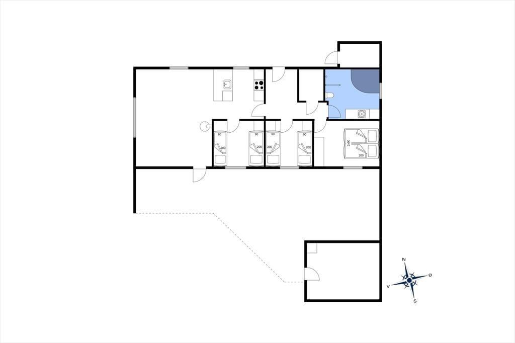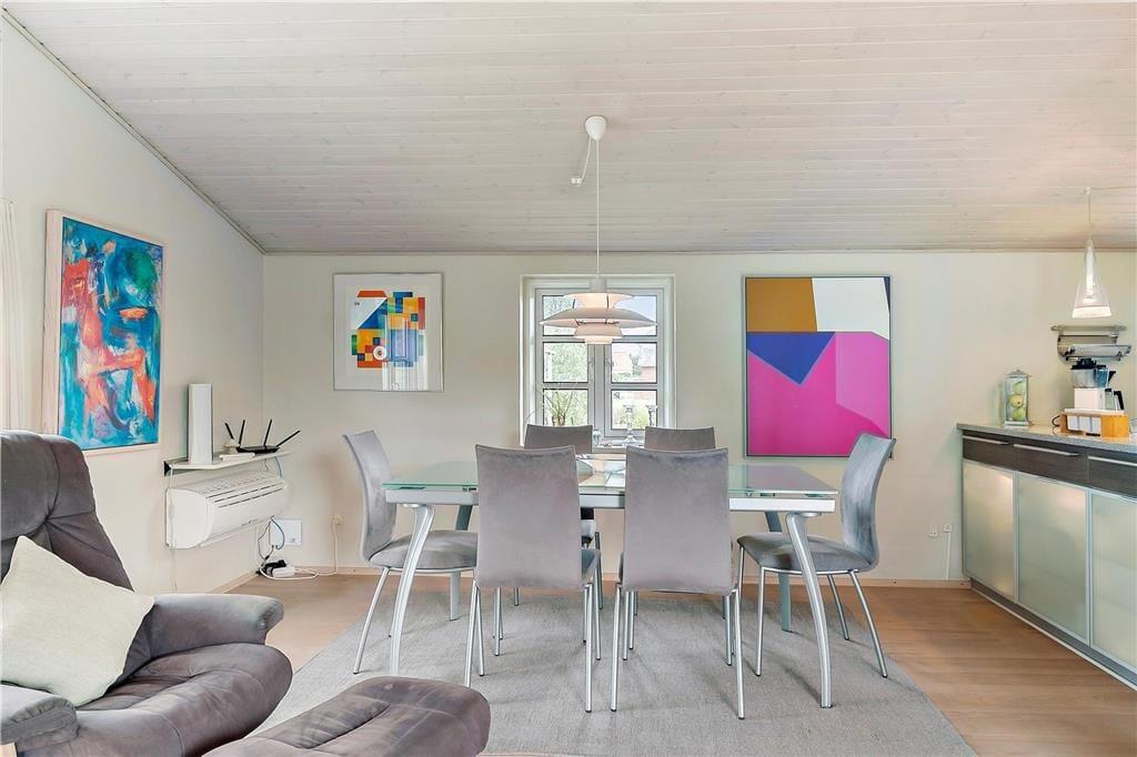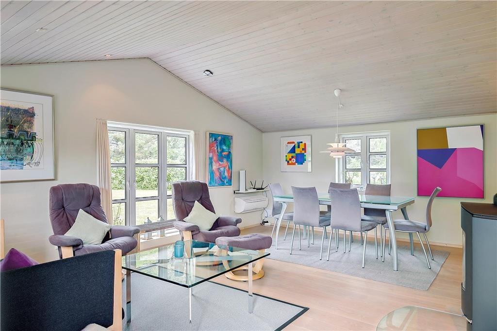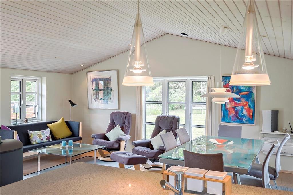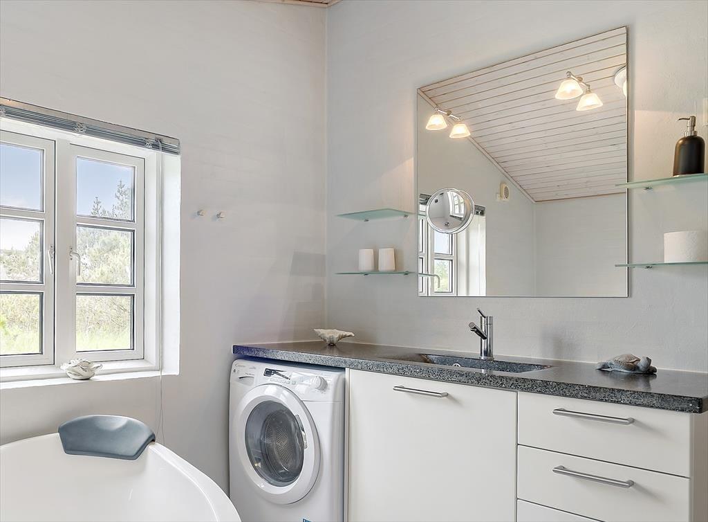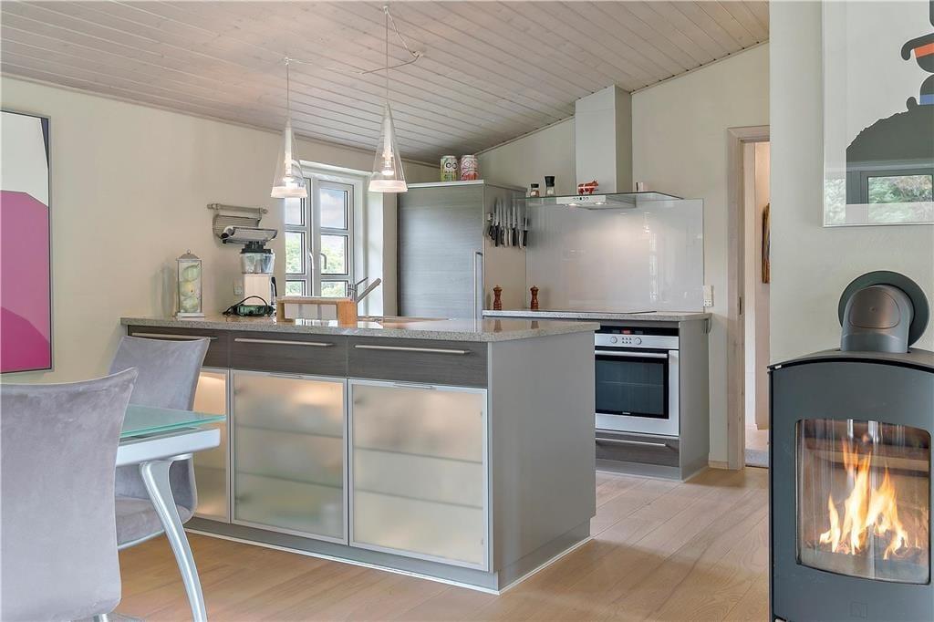 I dette feriehus bliver I budt velkommen af en lys entre som fører videre ind i det skønne køkkenalrum hvor der er god plads til hele familien, i køkkenalrummet er der dejlig højt til loftet og et fantastisk lysindfald ind gennem de store vinduer. Efter en kølig tur til Vesterhavet kan I passende tænde op for den dejlige brændeovn og nyde den dejlige varme der strømmer ud og blander sig med den fantastisk hyggelige knitrende lyd og fryser I virkelig meget kan I tænde op for den dejlige sauna og blive varmet godt igennem.