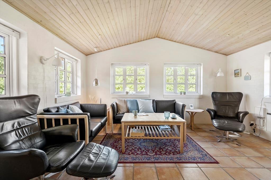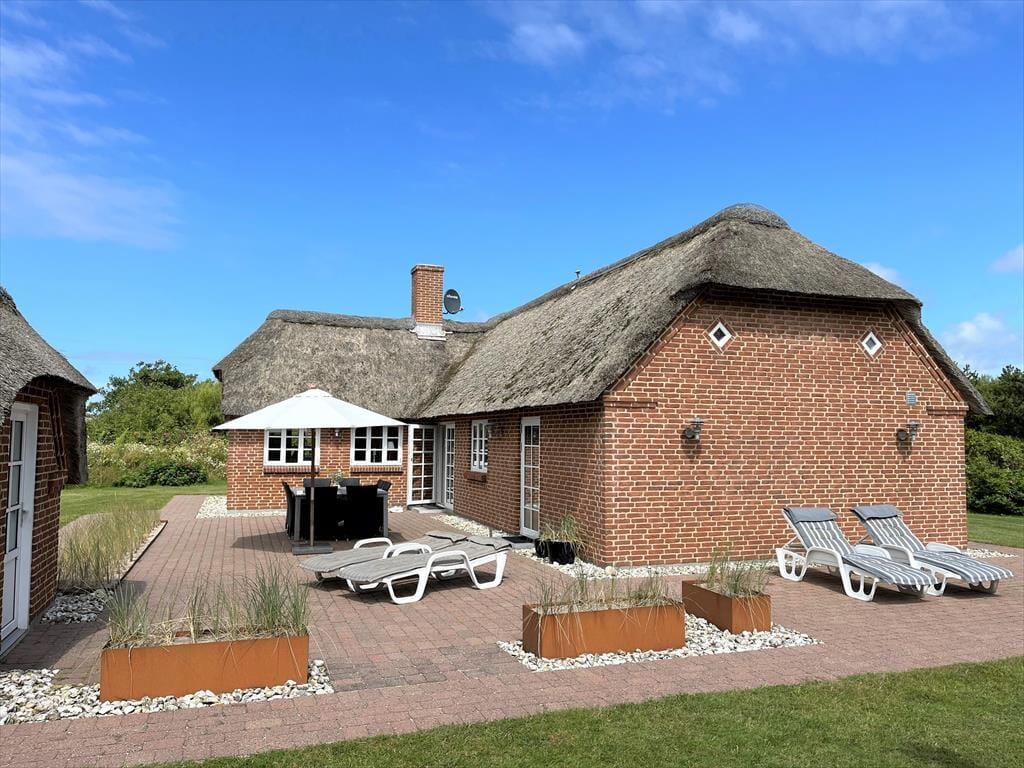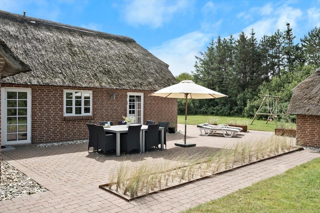På de store solrige, flisebelagte og møblerede terrasser mod vest og syd, har I de perfekte rammer til at nyde en lækker forfriskning eller hygge om grillen med enten skumfiduser eller et lækkert aftensmåltid. Terrasserne er meget ugenerede og I har derfor en masse dejligt privatliv til for eksempel at solbade og nyde solens stråler. Den fantastiske stilhed blandet med havets brusen i baggrunden sætter stemningen og skaber en helt fantastisk feriestemning. Nyd morgenkaffen på den lille terrasse mod øst og se solen gå op og fuglene begynder deres sang. Den store grund er omkranset af skærmende randbeplantning og I har masser af plads til diverse udendørs aktiviteter.