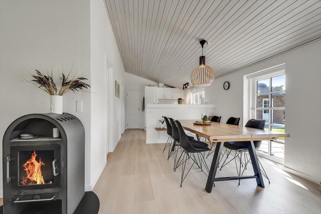 Mens aftensmaden tilberedes i ovnen, spreder duften sig fra køkkenet og ud i stuen, hvor brændeovnen knitrer og skaber en varm og indbydende atmosfære. Sæt jer godt til rette, nyd varmen og lad roen sænke sig.