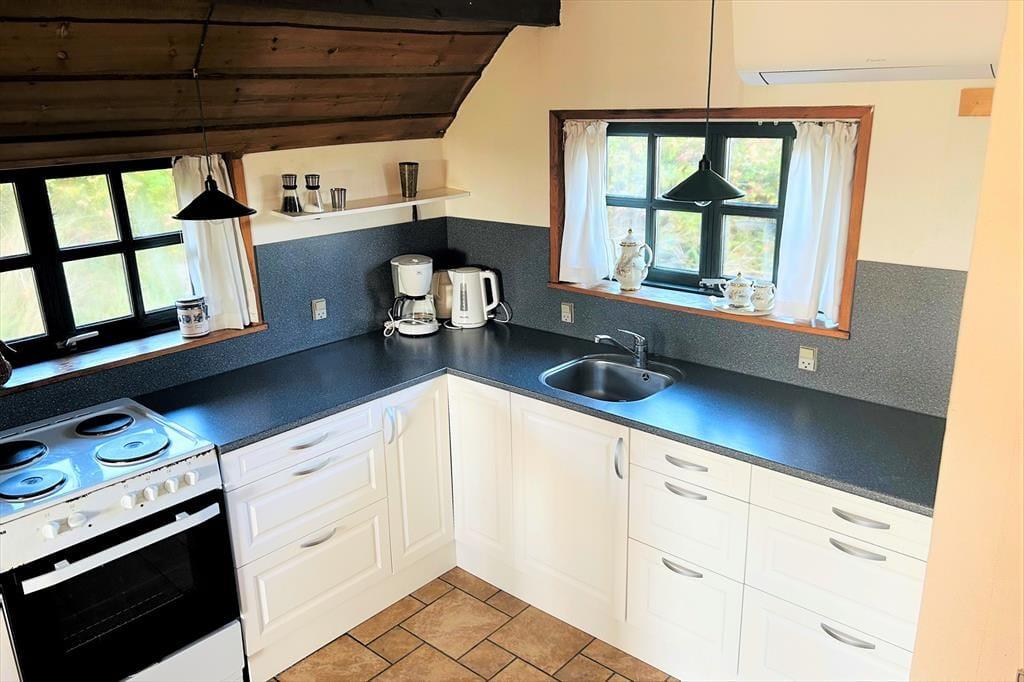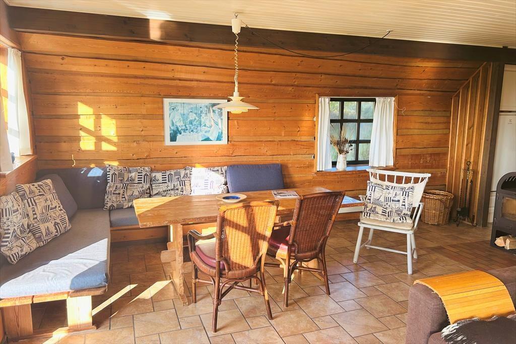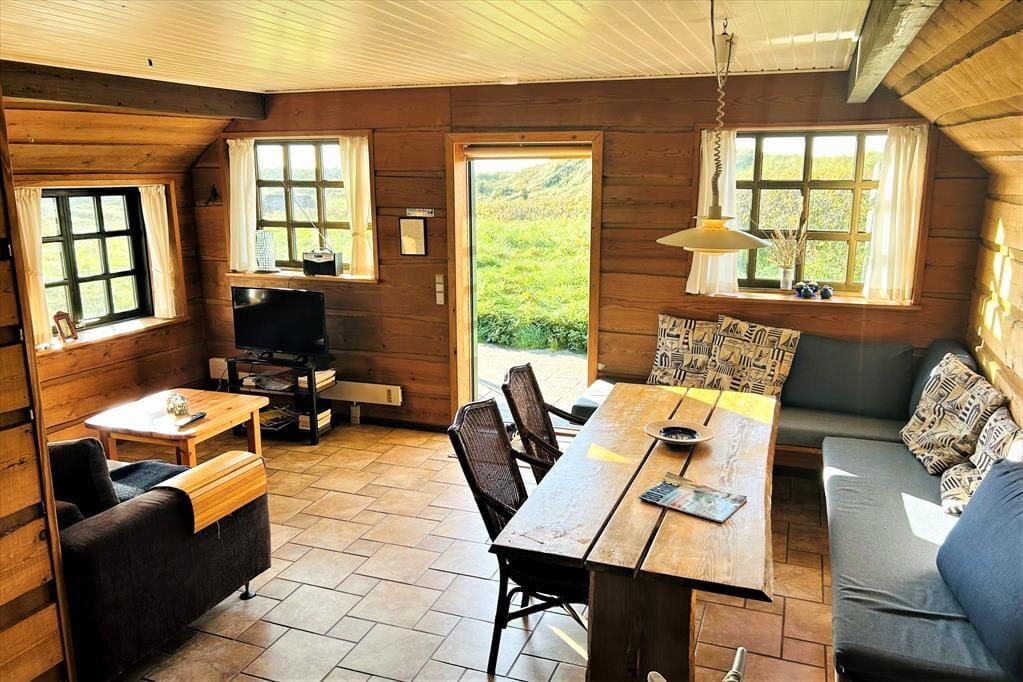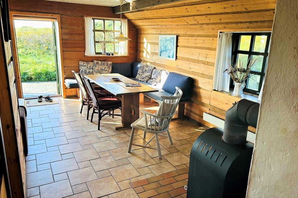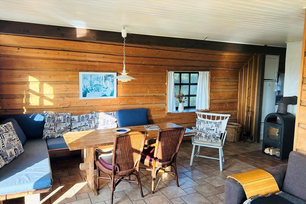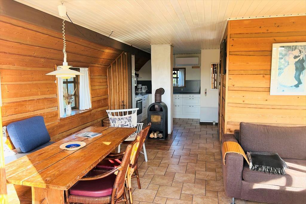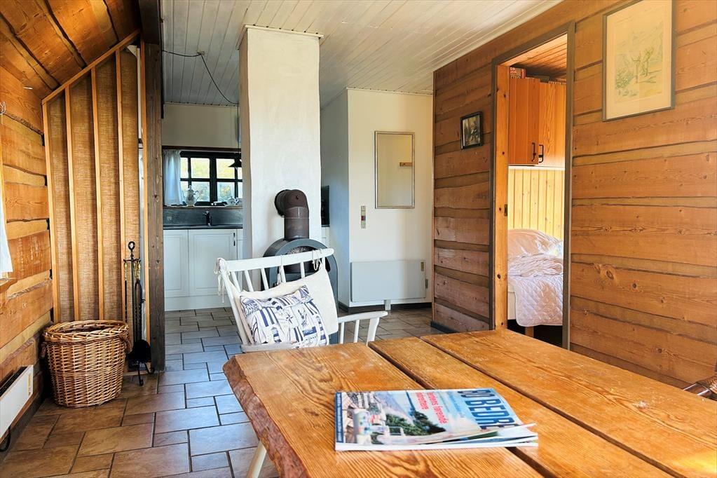 Træd ind i dette yderst charmerende feriehus, her bliver I mødt af en fantastisk hjemlig og hyggelig følelse for med de træbeklædte vægge, og det mindre areal, og brændeovnen i midten kan man ikke andet end at slappe af og komme helt ned i gear. Sæt jer omkring det rustikke spisebord og nyd en varm kop kaffe imens brændeovnen udsender en fantastisk varme og en herlig knitrende lyd. I dette skønne feriehus kan I hygge jer med en god film i fjernsynet, et kortspil eller dybe samtaler ved spisebordet.