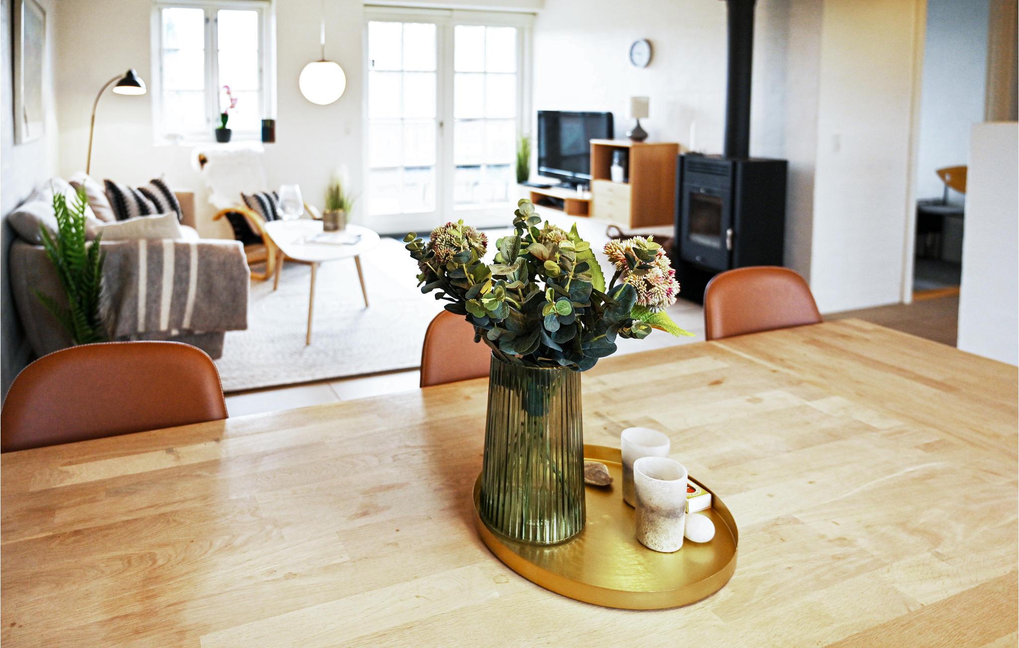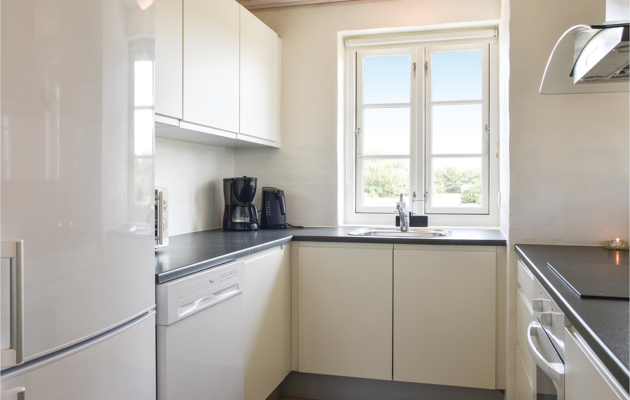I hjertet af huset ligger køkken/alrummet, som også deler huset op i midten. Huset har et moderne køkken, der indeholder de ting som I skal bruge for at holde en god ferie, det ligger i åben forbindelse med spisepladsen og opholdsstuen, så I er samlede, selvom I står og laver mad i køkkenet. I rummet er der gulvvarme og en dejlig brændeovn. Fra stuen er der udgang til en stor lukket syd-/vestvendt terrasse, hvor I kan nyde gode middage og solbadning.