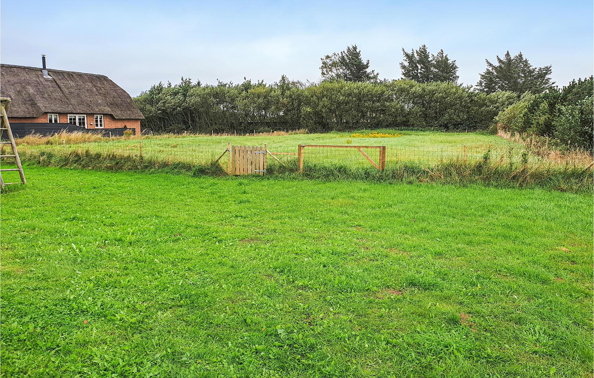 Hyggeligt stråtækt sommerhus i Vedersø Klit med stor indhegnet grund og wellness-faciliteter.