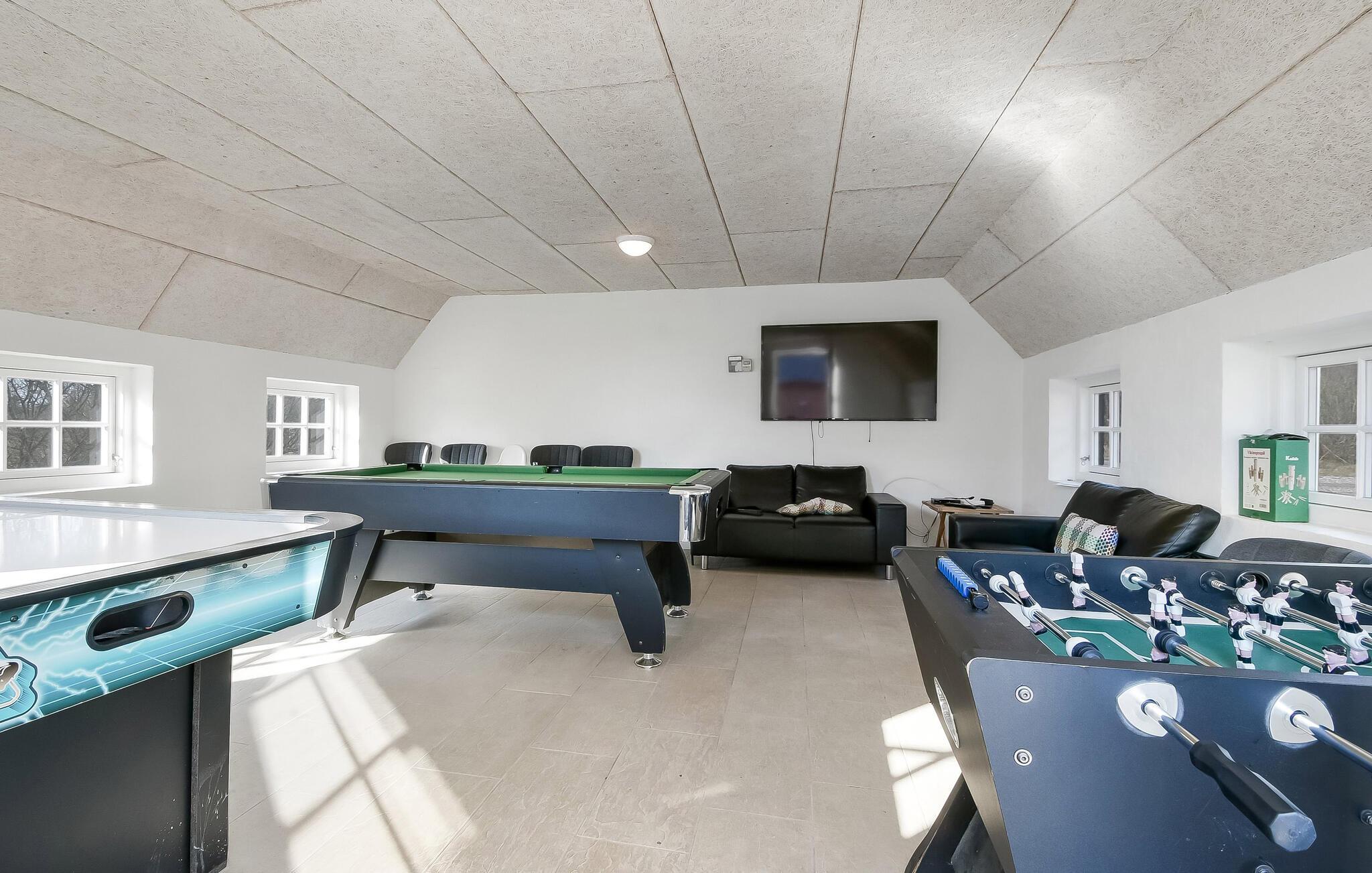 Dette hus byder jer velkommen med rummelige, lyse værelser og en stilfuld indretning, der straks giver en følelse af hygge og komfort. Det er ideelt til en stor familie eller en gruppe af venner, der kan spise sammen her, spille sjove spil eller tilbringe hyggelige aftener ved pejsen. Indendørspoolen med rutsjebane sørger for fornøjelige badeoplevelser, mens bordfodbold, airhockey og billard byder på underholdning.
