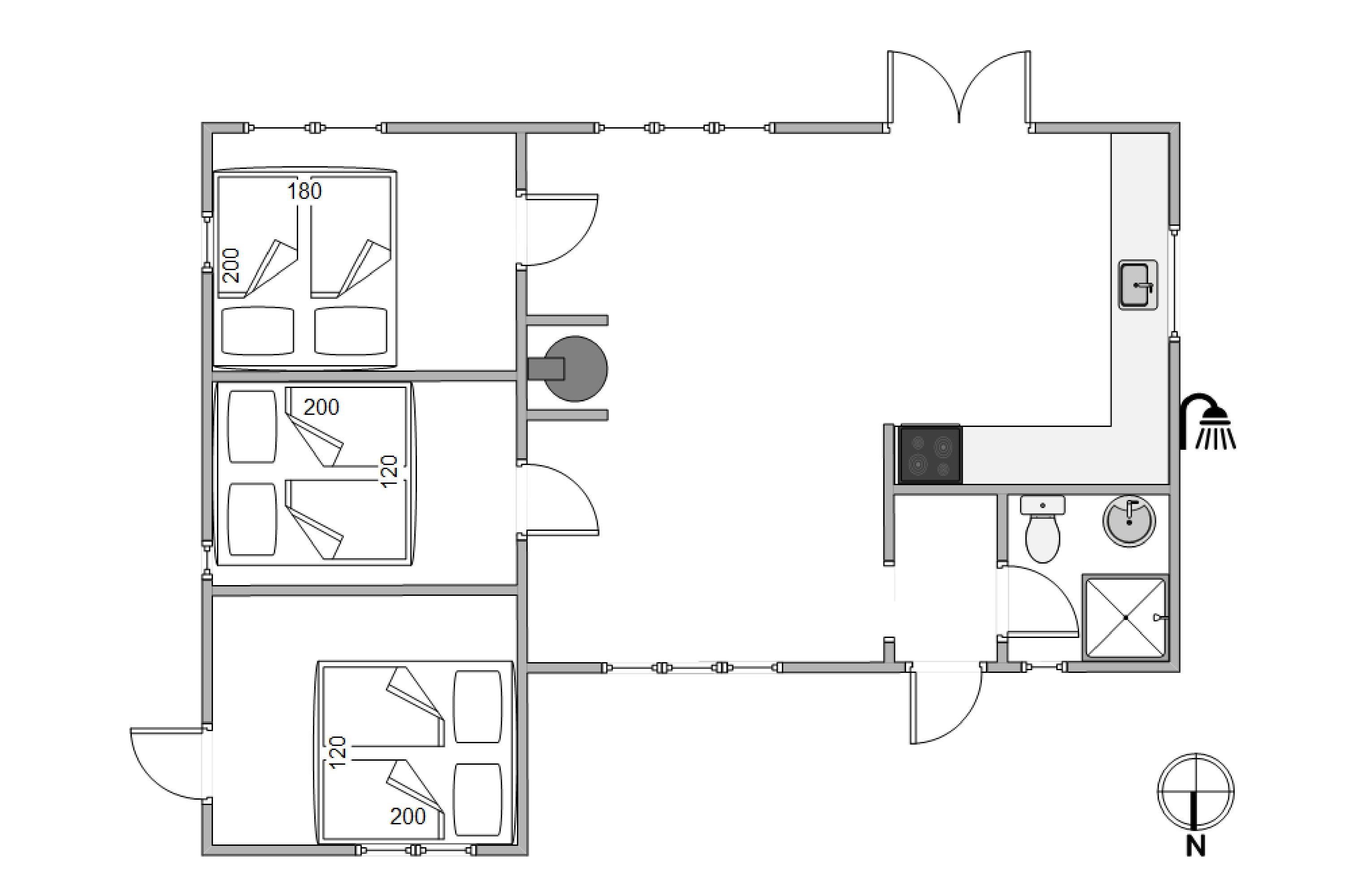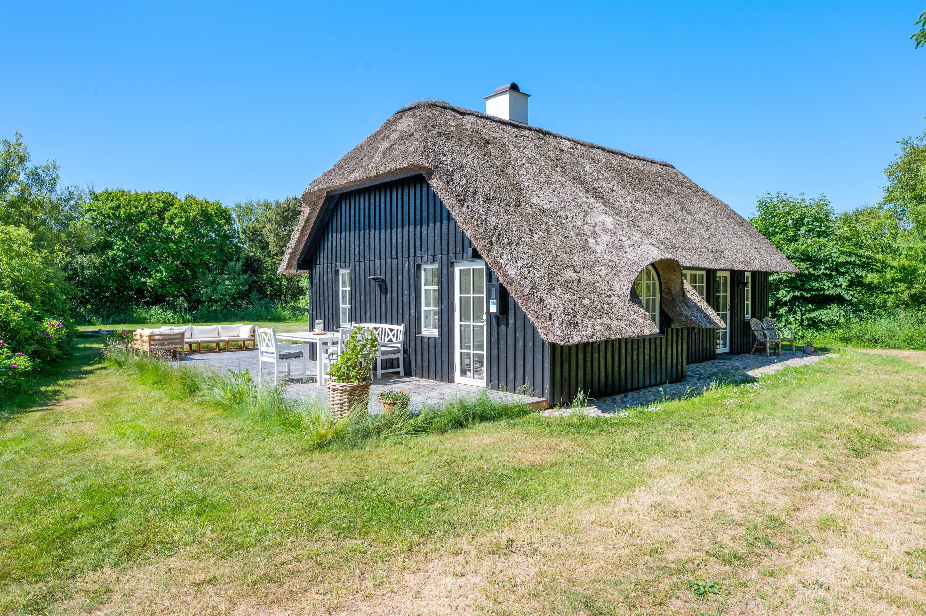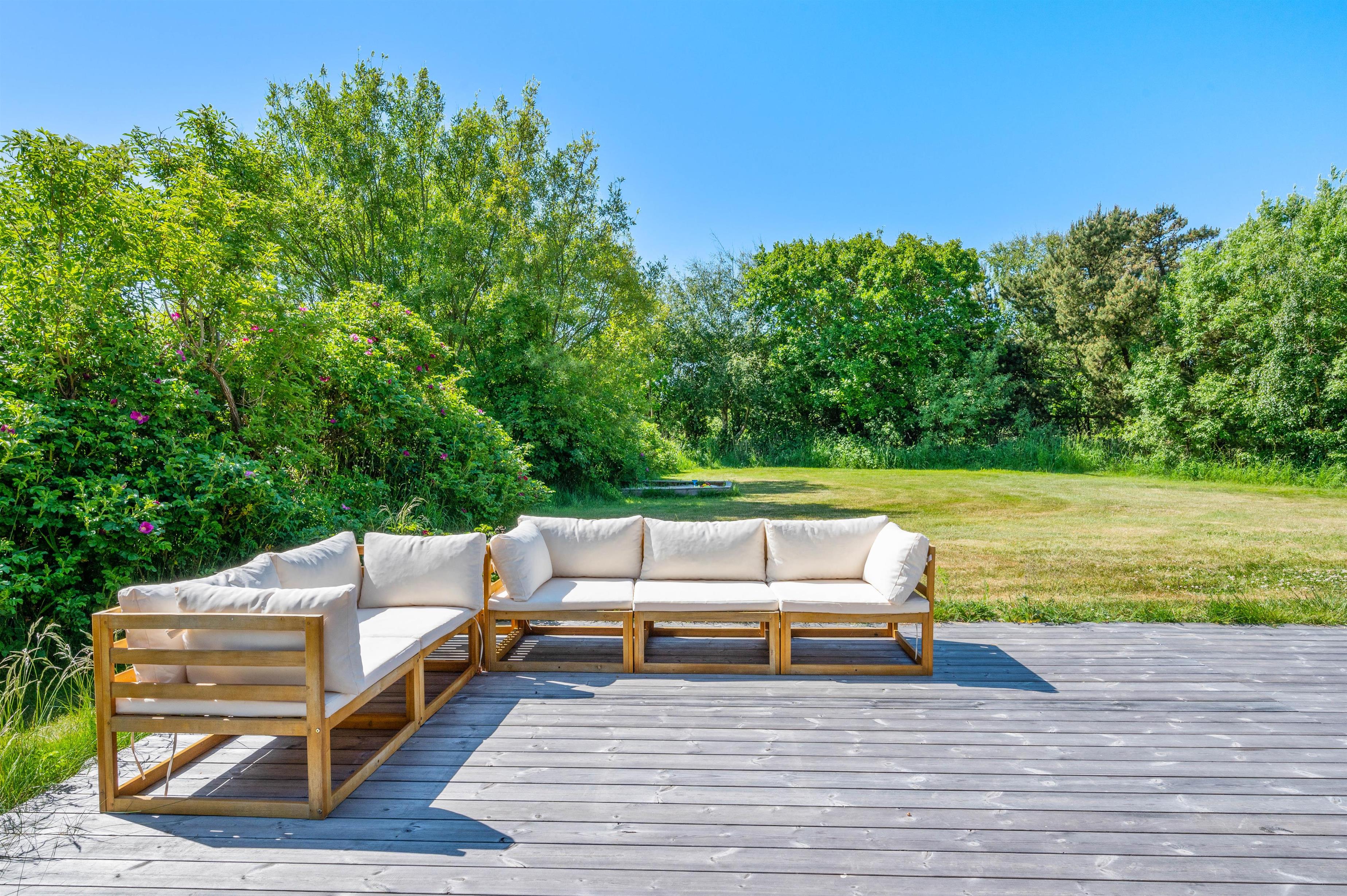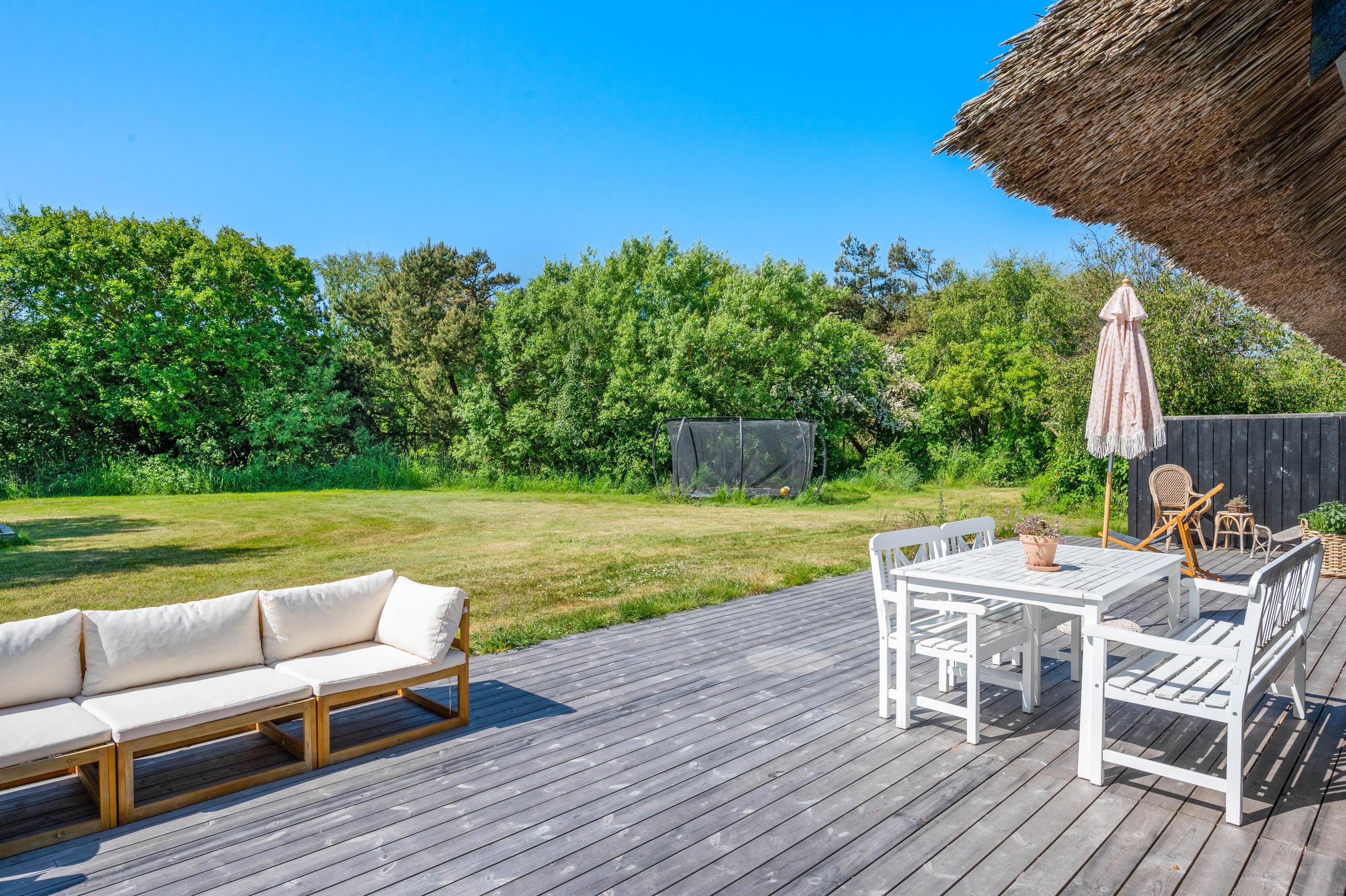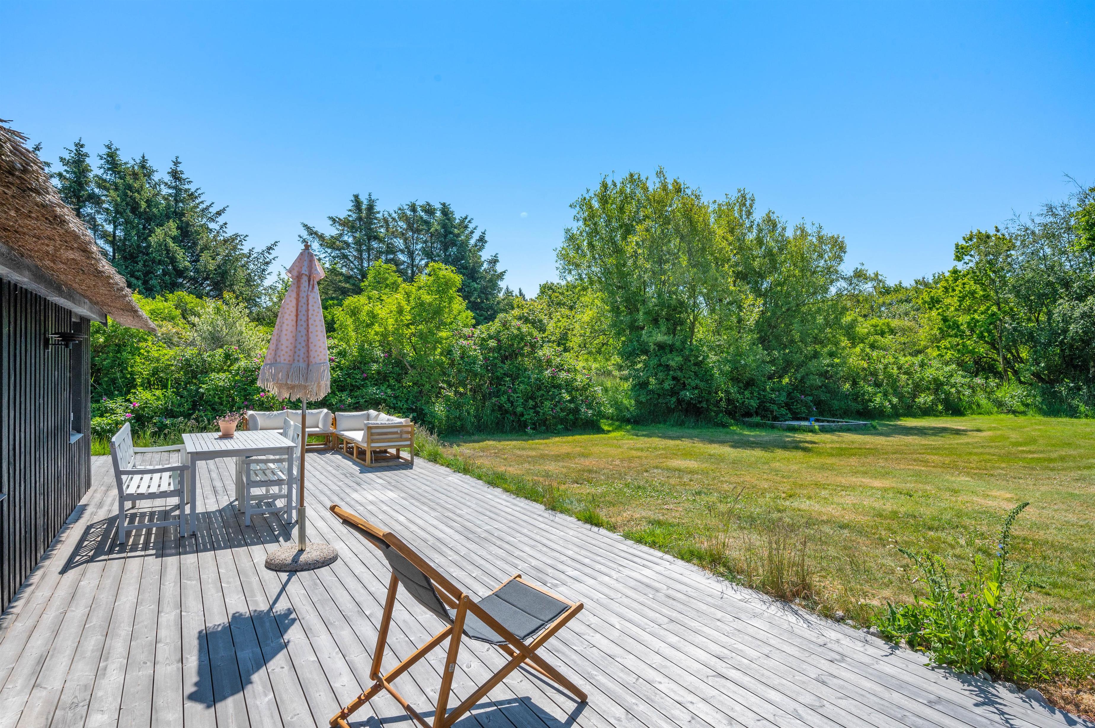 Rundt om sommerhuset er en skøn træterrasse med havemøbler, grill og solvogn til rådighed. For enden af gavlen finder I en skøn udebruser, så I kan skylle sandet af fødderne efter en dejlig gåtur langs havet, i det fine hvide sand. Udebruseren må benyttes fra april til november. Her er virkelig dømt afslapning og fred, hvor I kan sidde og nyde solen, mens I læser en god bog eller nyder en kølig drink på den dejlige træterrasse, der omslutter huset.