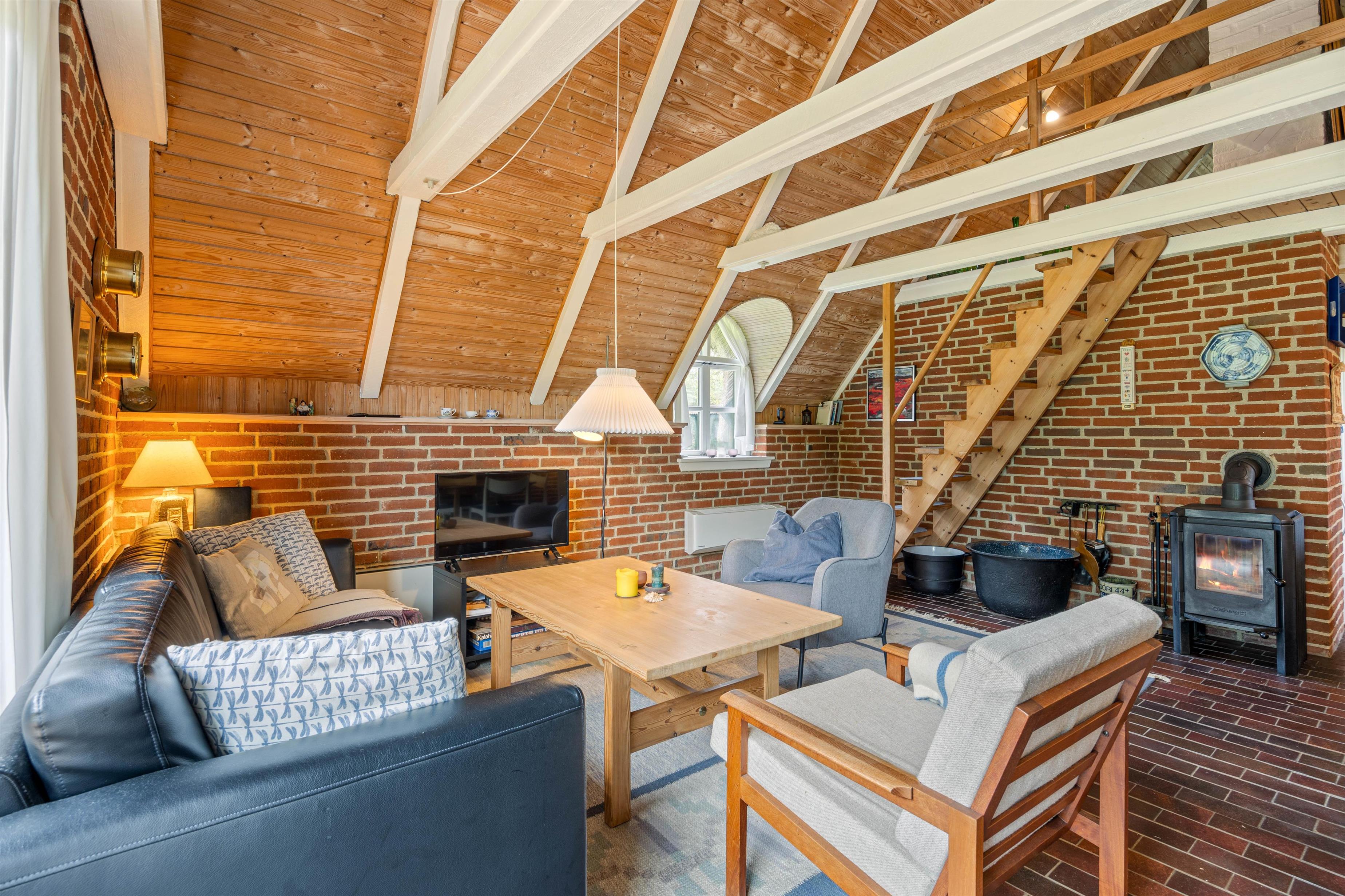 I forlængelse af køkkenet ligger opholdsstuen, som emmer af hygge. På de lidt koldere dage har I mulighed for at tænde op for brændeovnen og lige føle den ekstra feriehushygge, som det giver. Har I ikke tændt for brændeovnen, har I mulighed for at bruge den energibesparende luft til luft varmepumpe, som sørger for et behageligt indeklima hele året rundt.