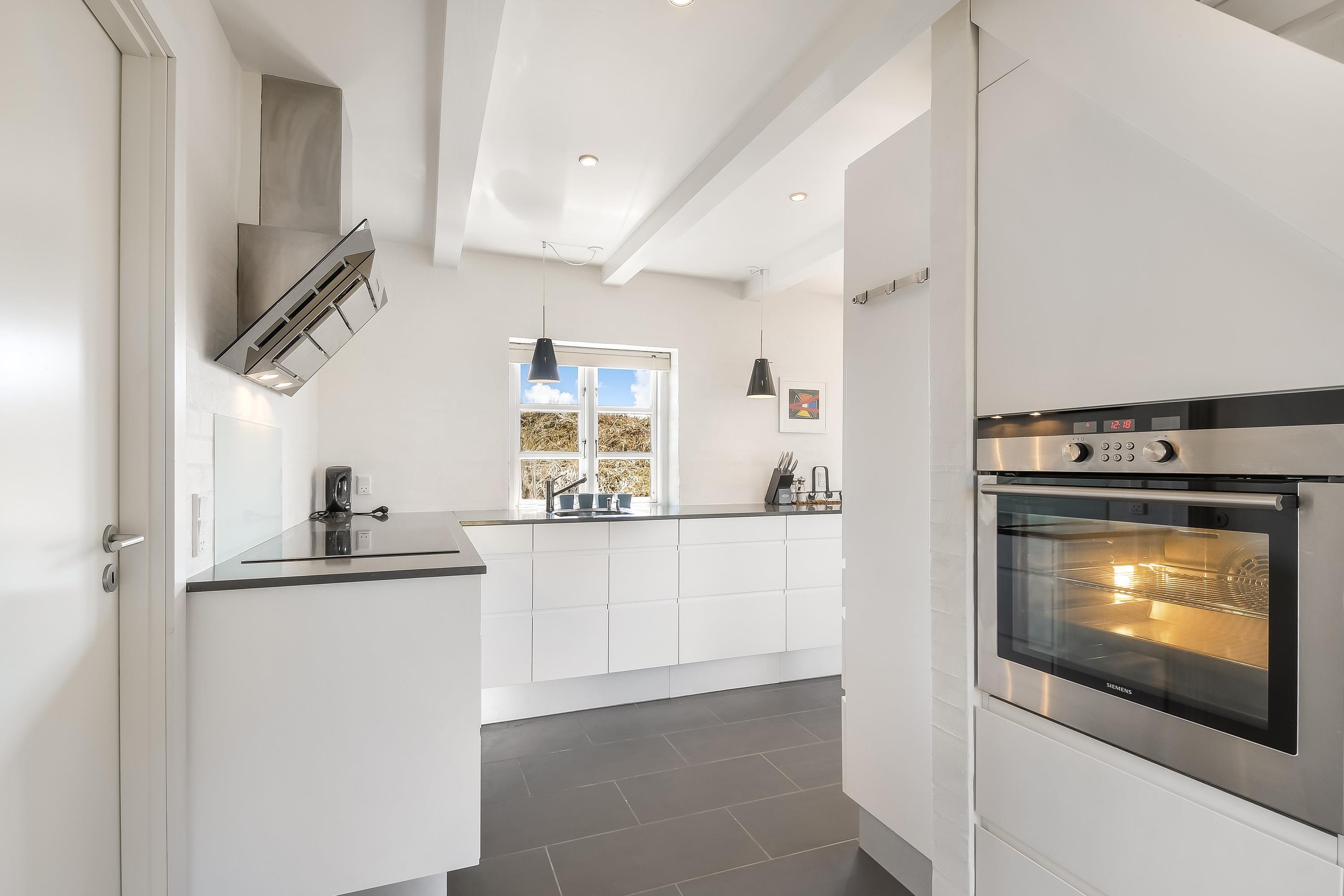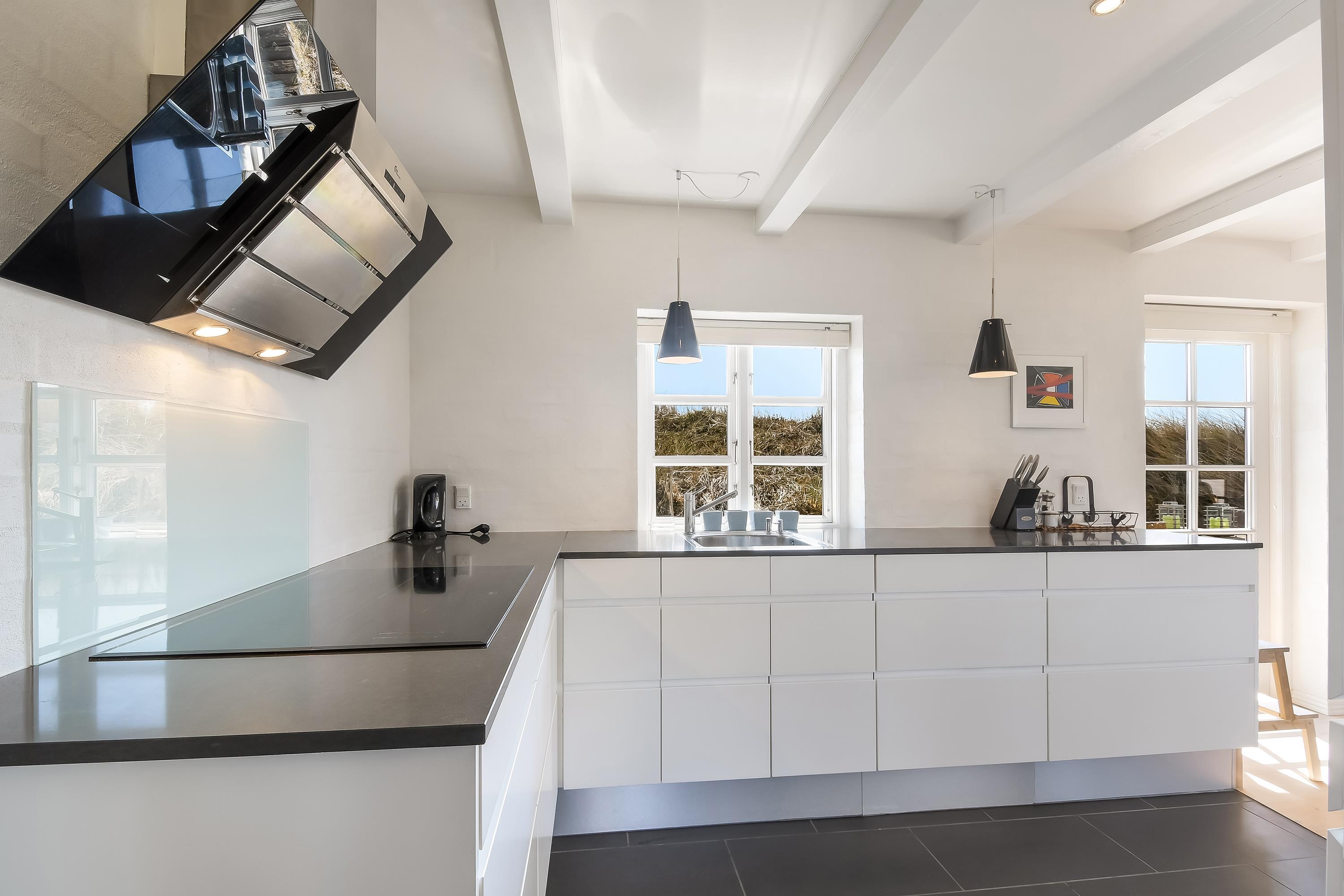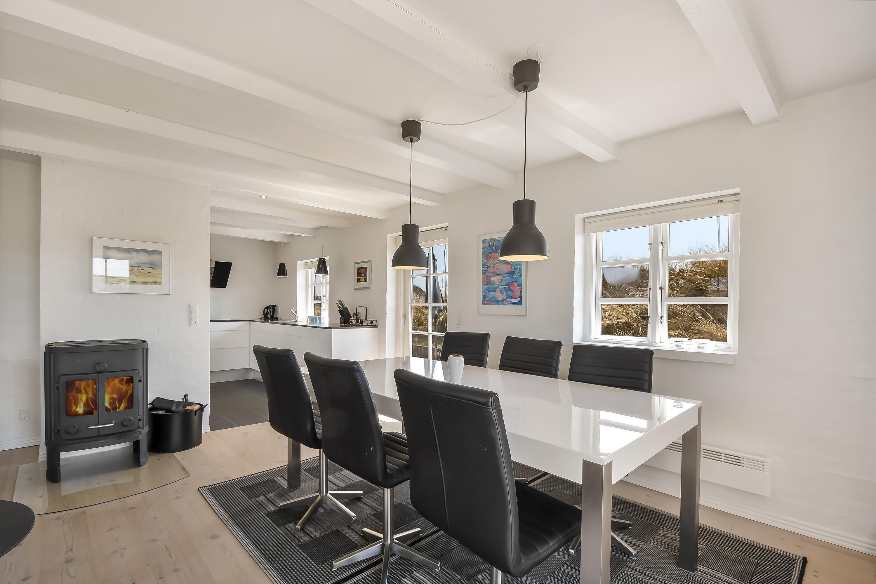 Køkkenet, med opvaskemaskine, ligger i åben forbindelse med spisestuen og stuen – et lyst og rummeligt samlingspunkt med brændeovn, fladskærms-TV og direkte udgang til begge terrasser.