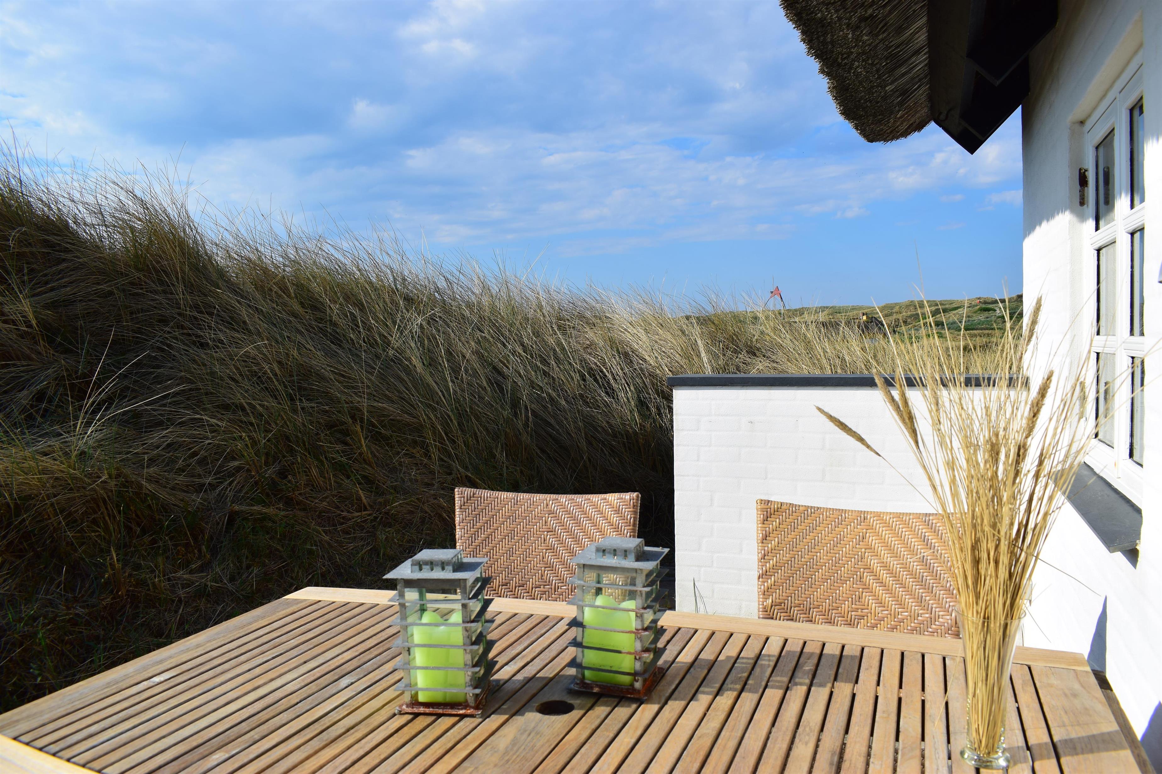 På den sydvendte terrasse kan du sidde helt ugeneret og nyde solen i læ bag klitterne – den perfekte ramme om afslapning med en kop kaffe eller en god bog.
