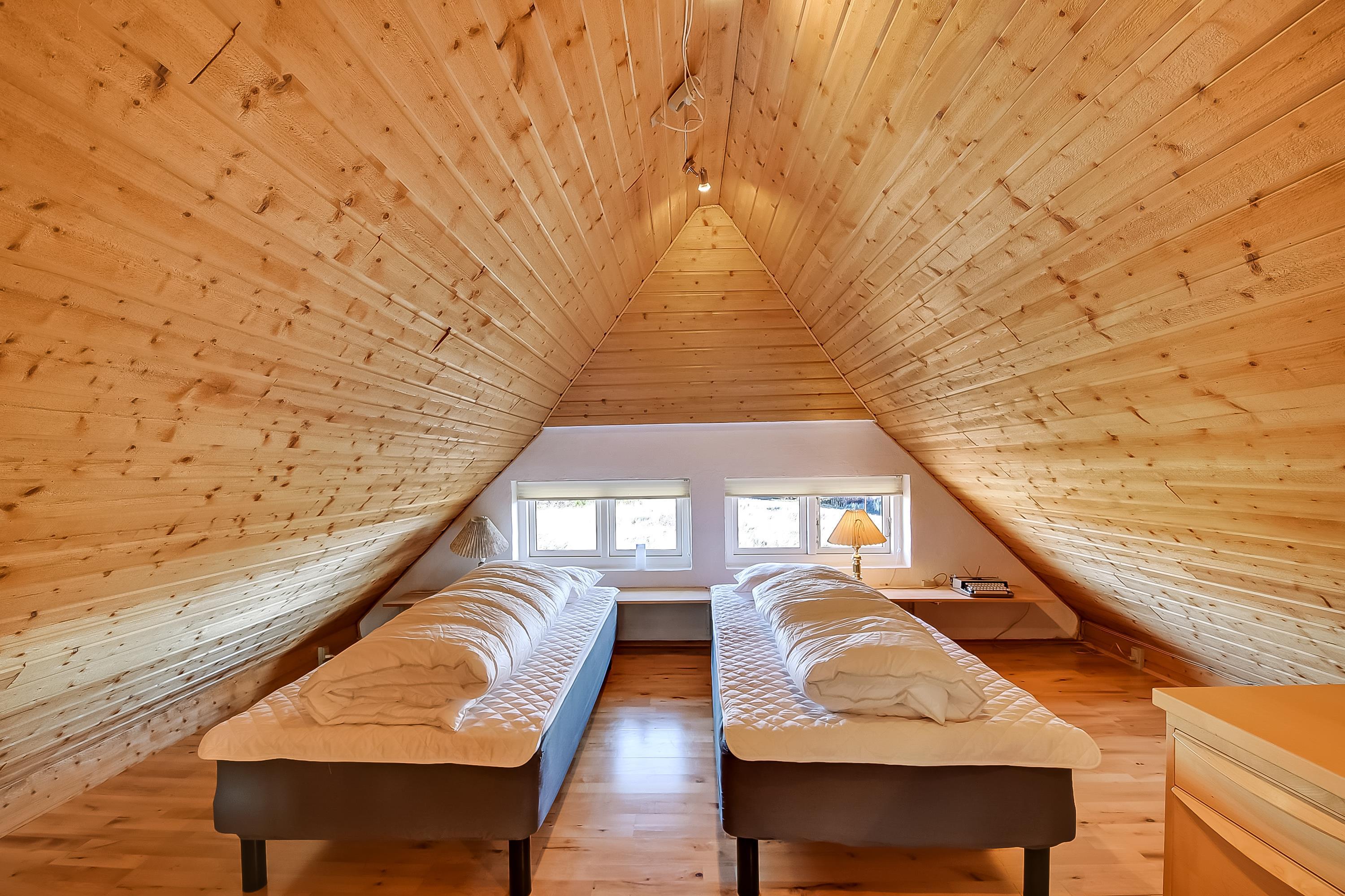 Stor hems med to enkeltsenge og et arbejdsbord med udsigt over området