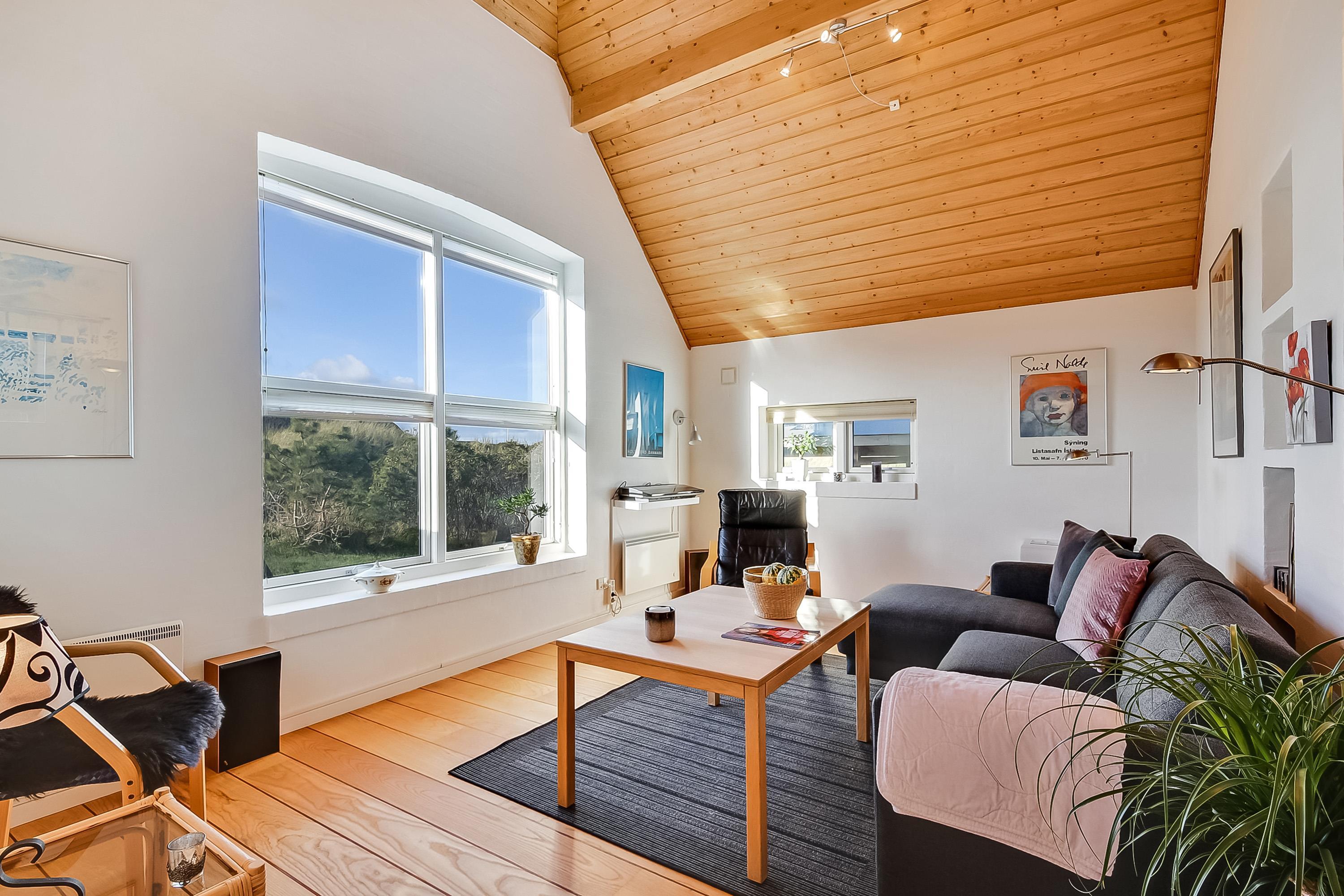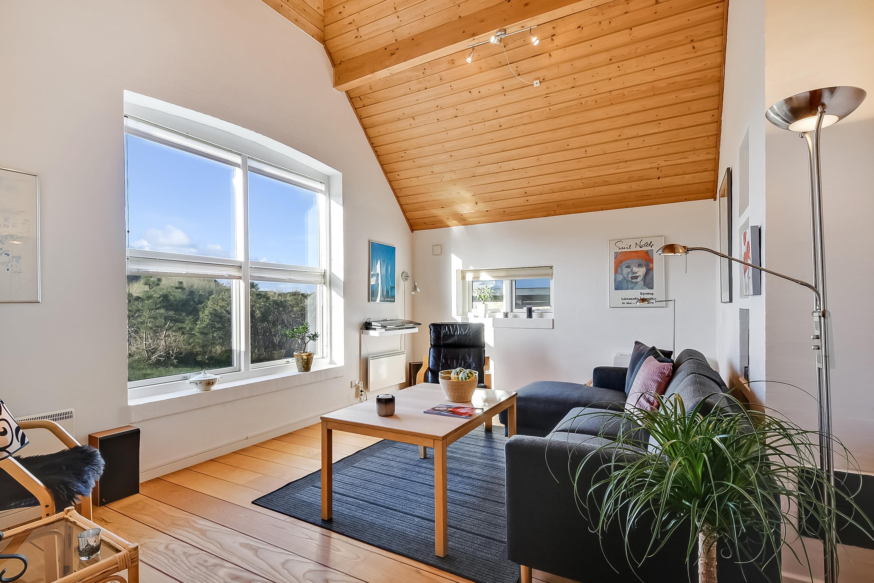 Indretningen byder på flere hyggelige opholdsrum og fantastisk udsigt – både mod klitterne og mod det ikoniske sømærke, som troner i horisonten.