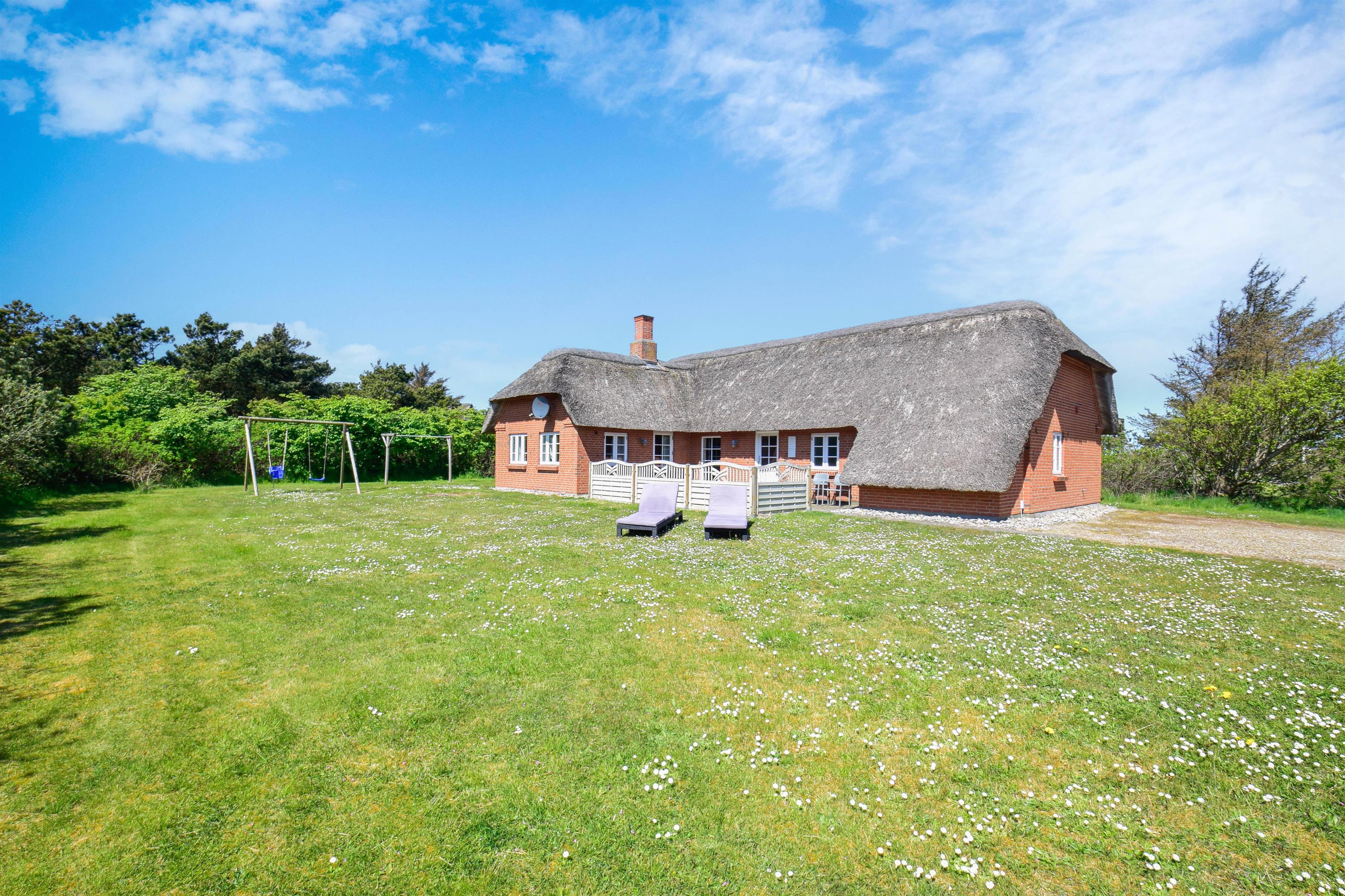 Med sit flotte stråtag, murede facade og håndværksmæssige detaljer fremstår huset som et klassisk vestjysk feriehus med et strejf af luksus.