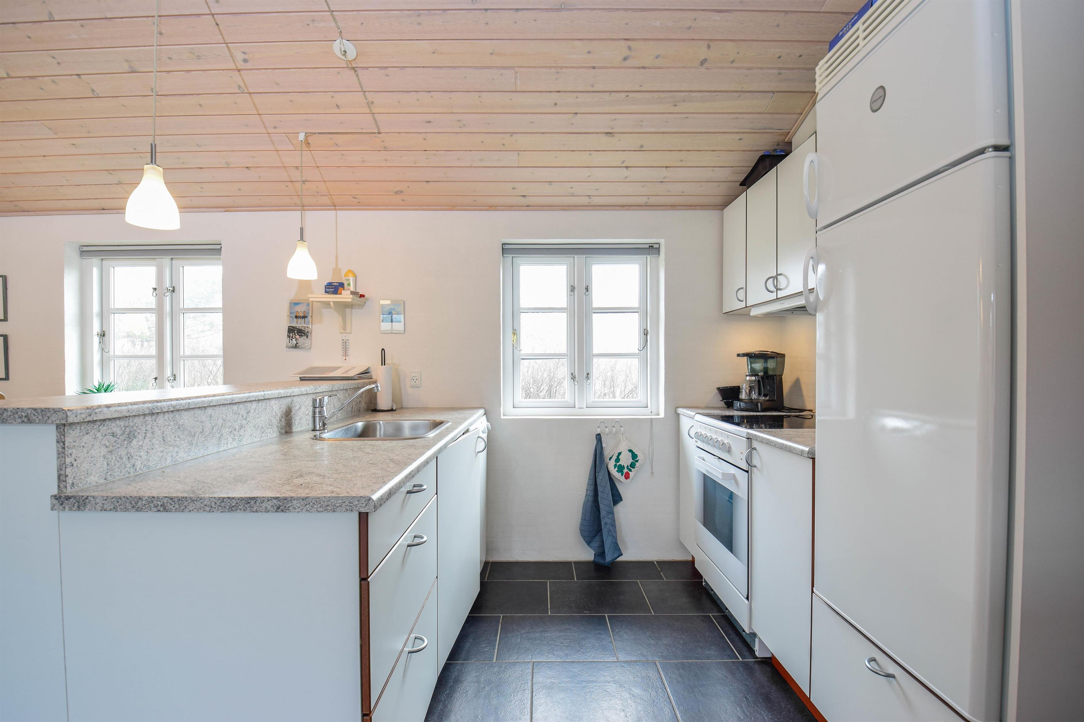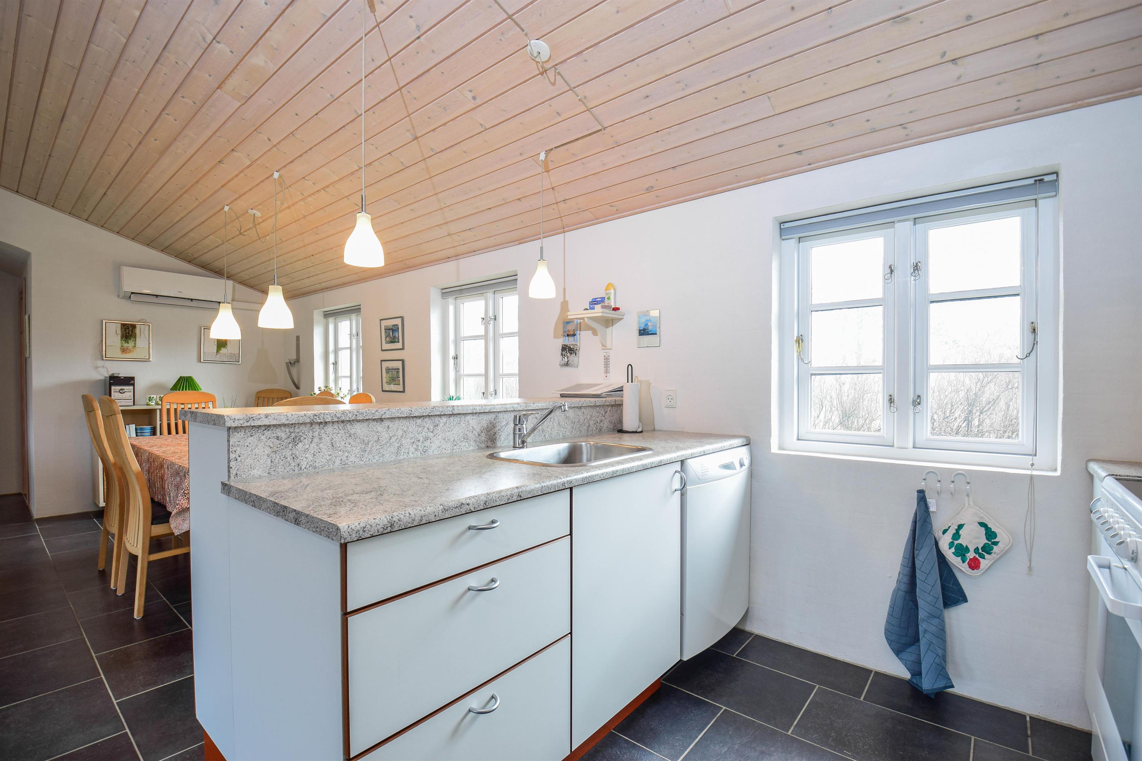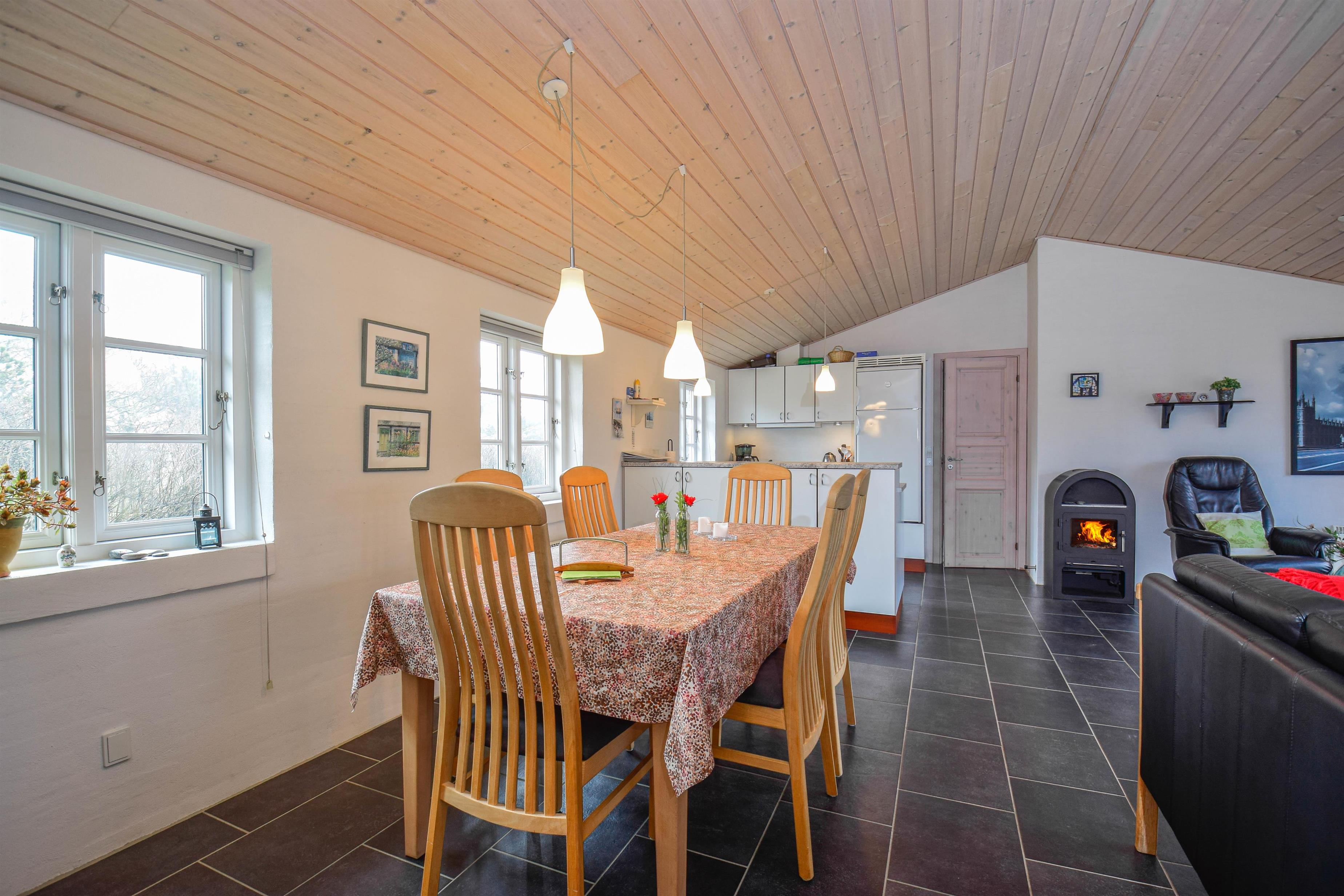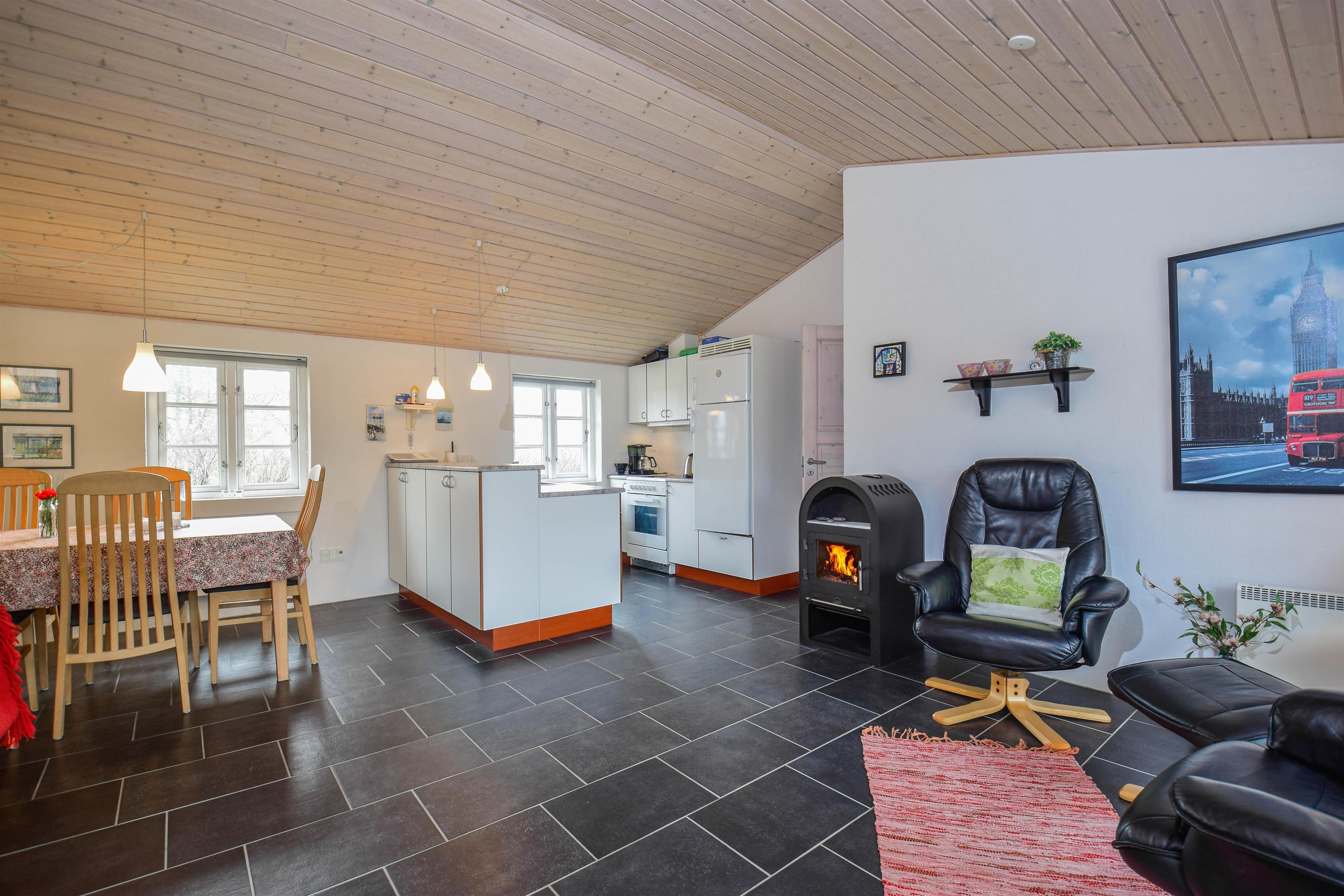 Midt i huset ligger det store, åbne opholdsrum med køkken, spiseplads og stue – et hyggeligt samlingspunkt med brændeovn og fladskærms-tv.