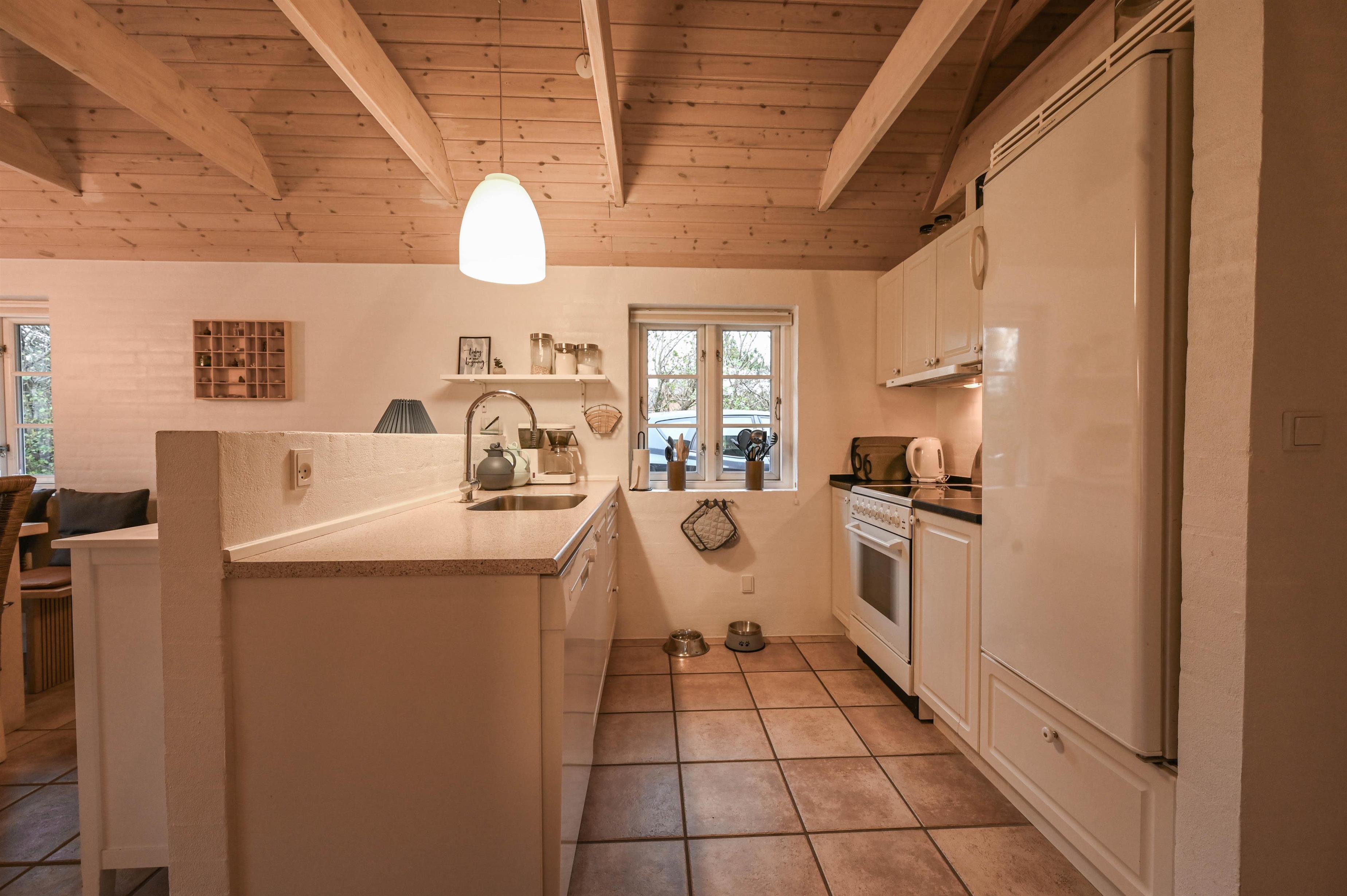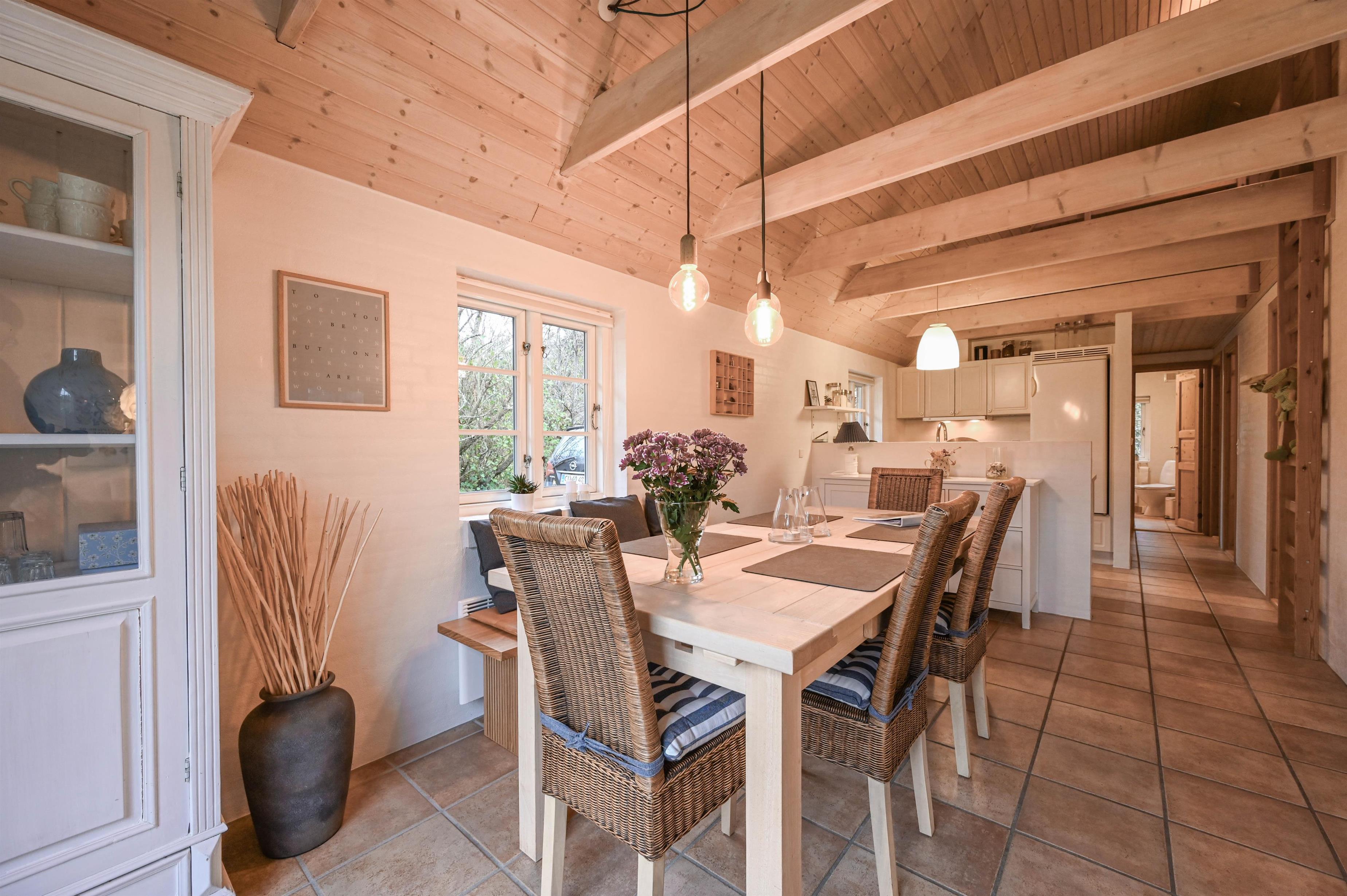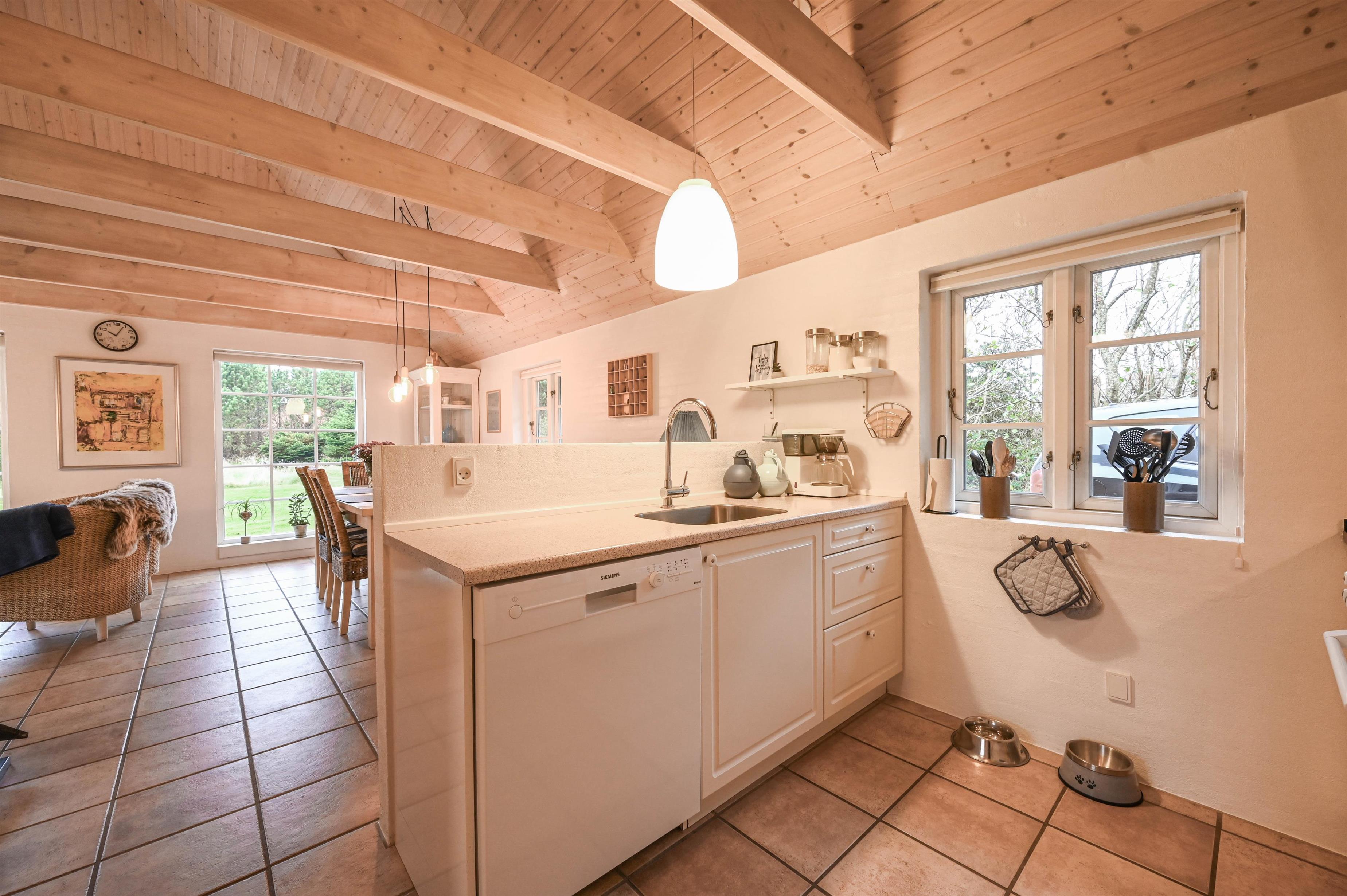 Det veludstyrede køkken ligger i åben forbindelse med stuen, hvor brændeovnen, spiseområdet og sofaafdelingen indbyder til hyggelige stunder. Herfra er der direkte adgang til den sydvendte terrasse, hvor du kan nyde solen dagen lang.