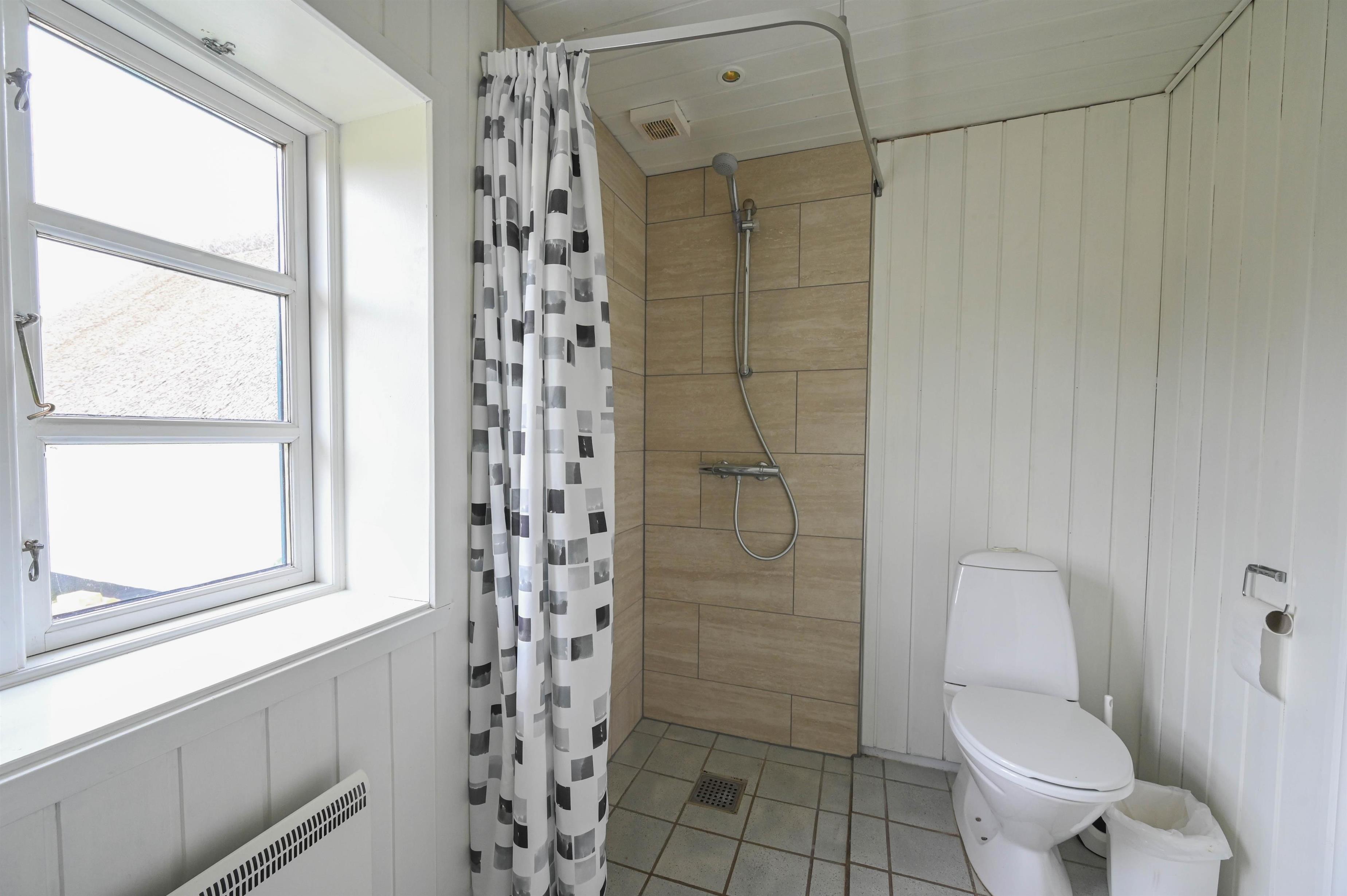 Et lyst badeværelse med sauna – perfekt til afslapning efter en lang dag ved havet