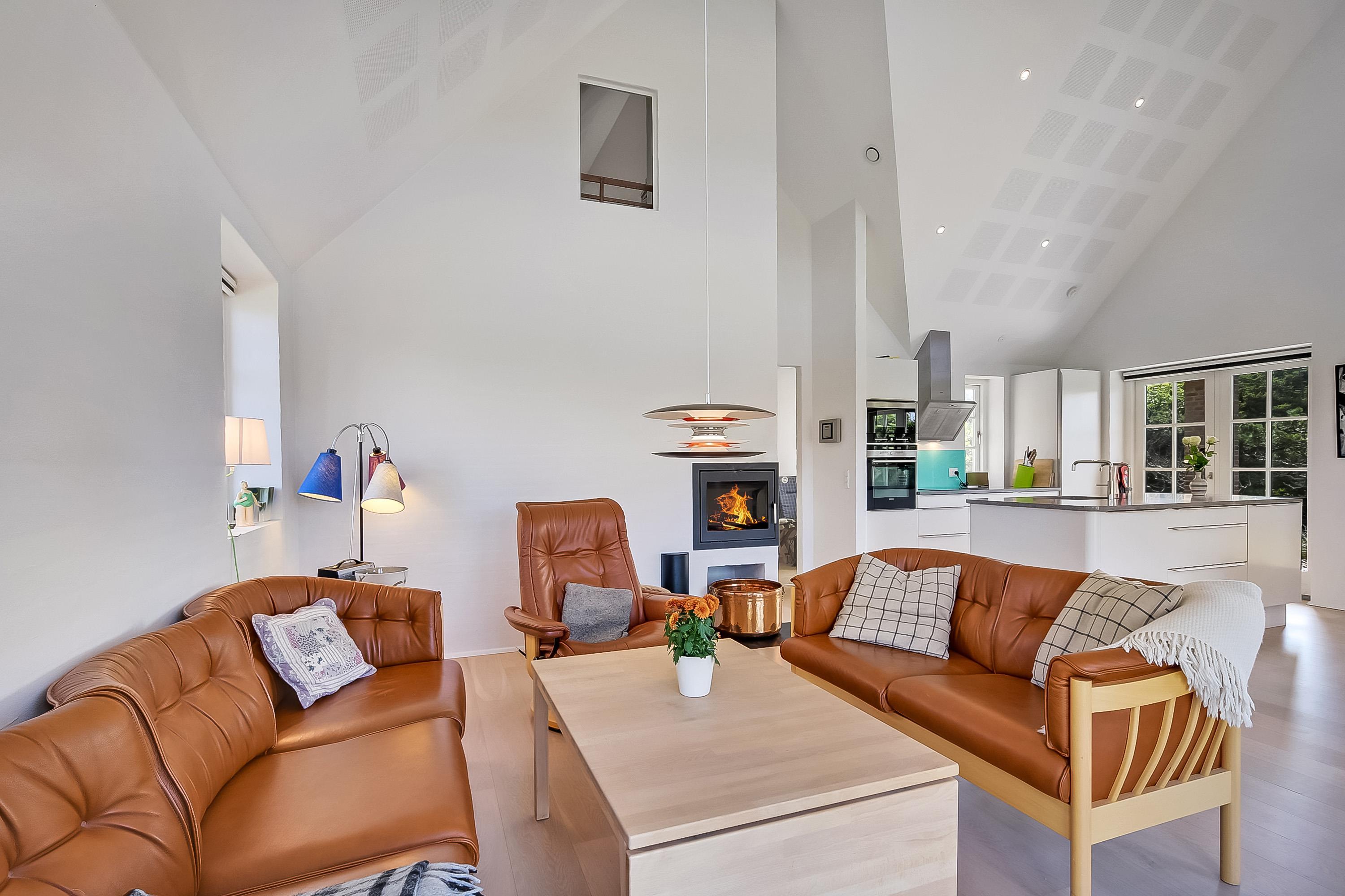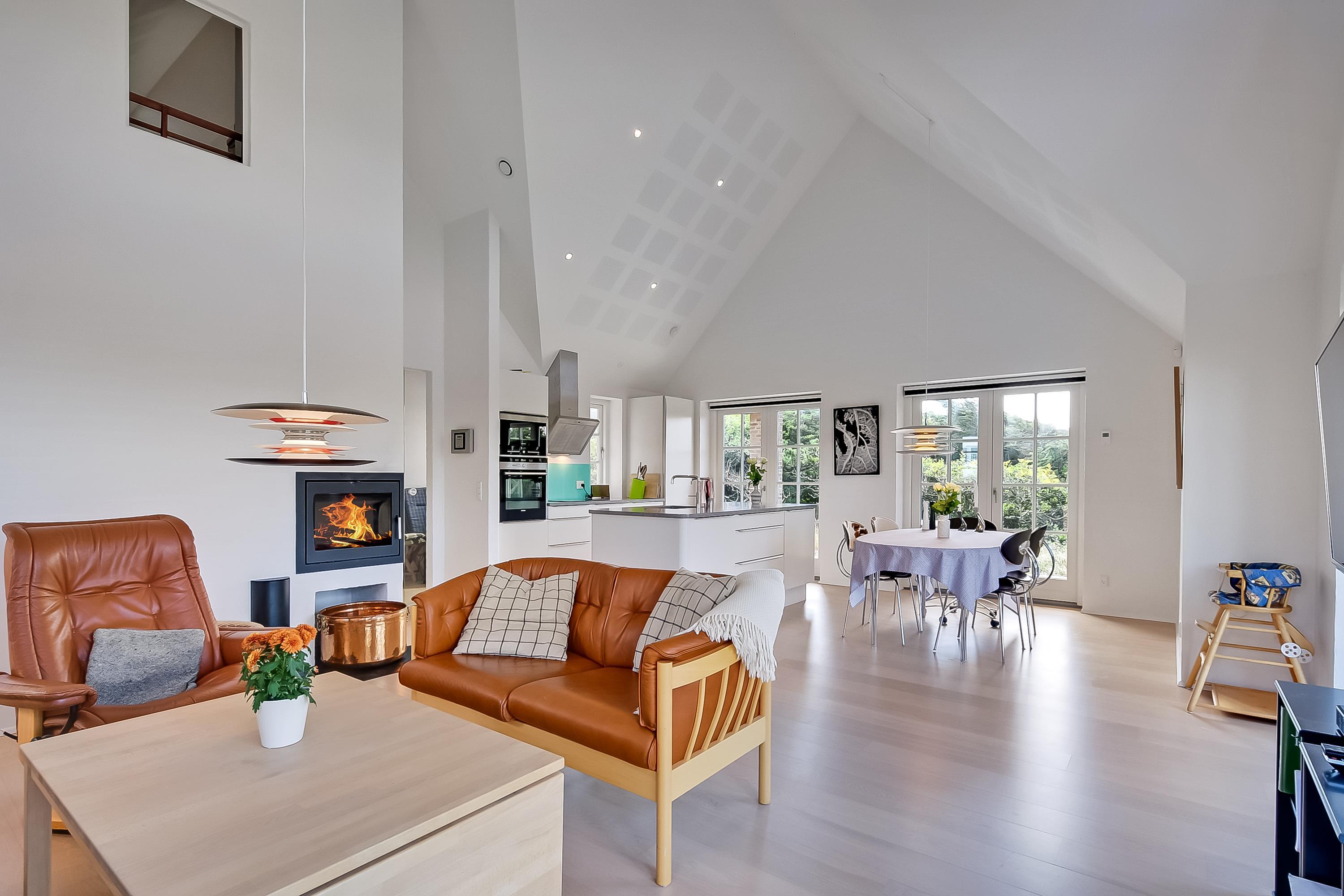 Åbent køkken i forbindelse med stuen med brændeovn og flot udsigt