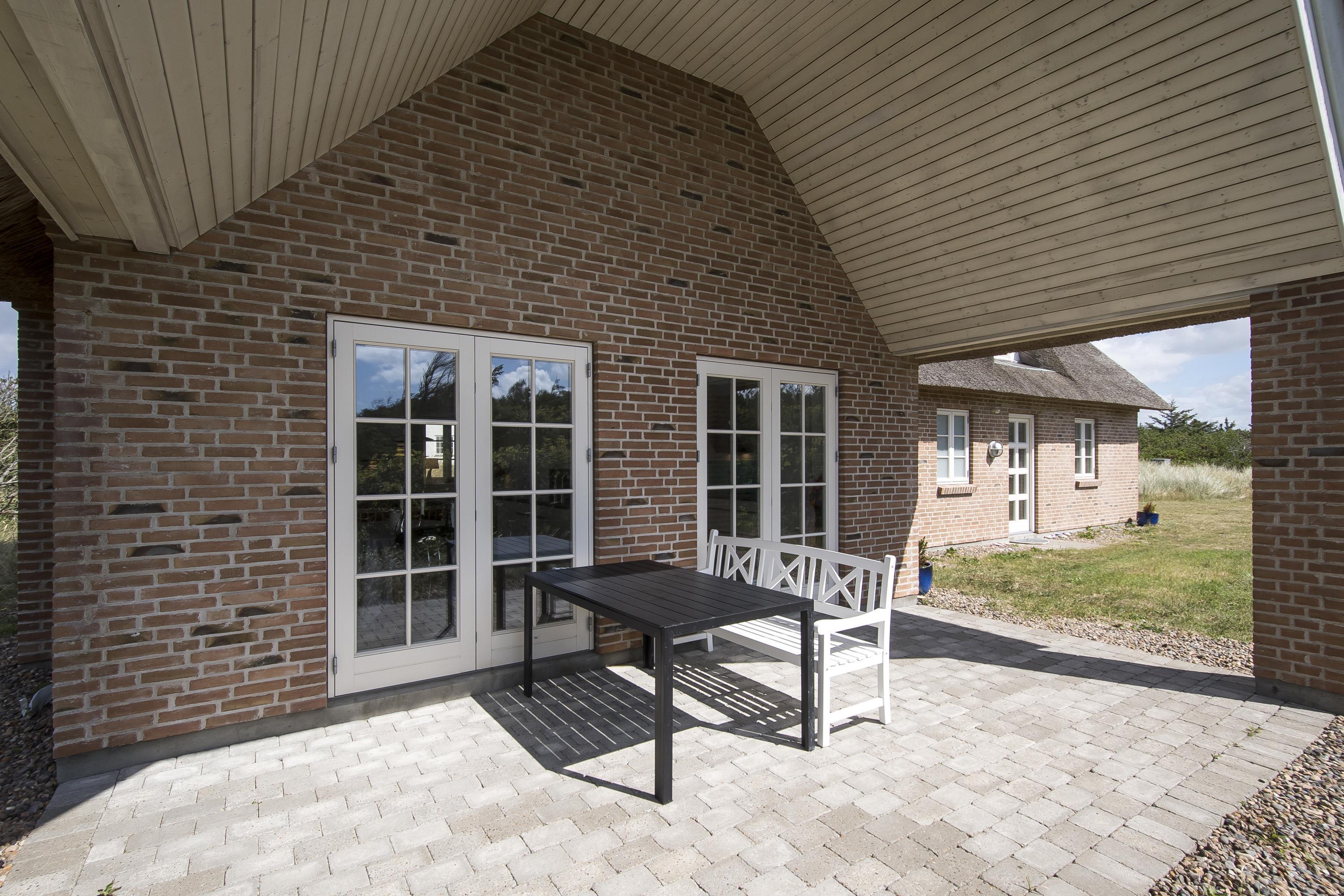 Mod syd finder du en overdækket terrasse, hvor man kan nyde solen, stilheden og lyden af vinden, der suser i marehalmen – et perfekt sted til morgenkaffen eller afslappende aftener i læ.
