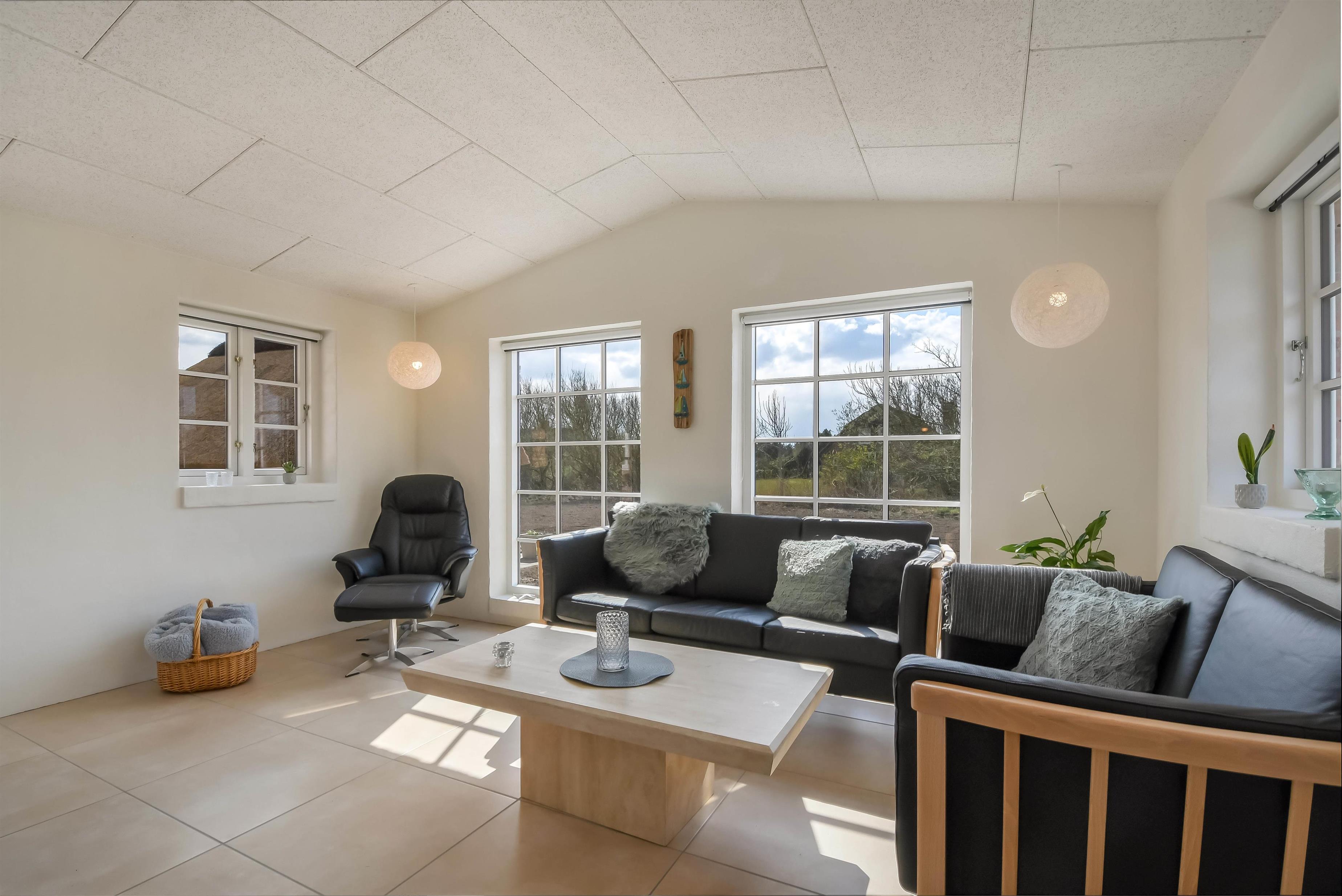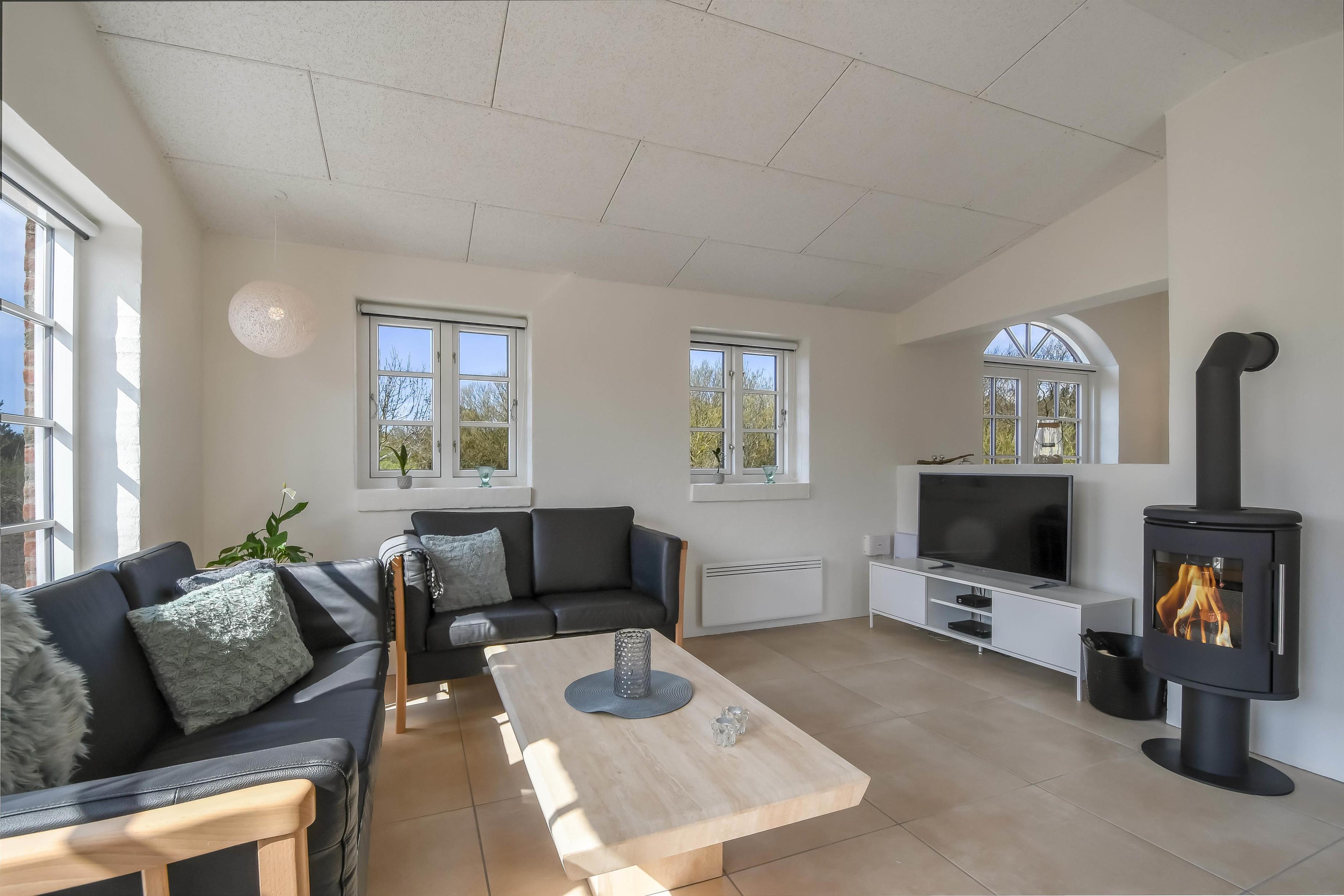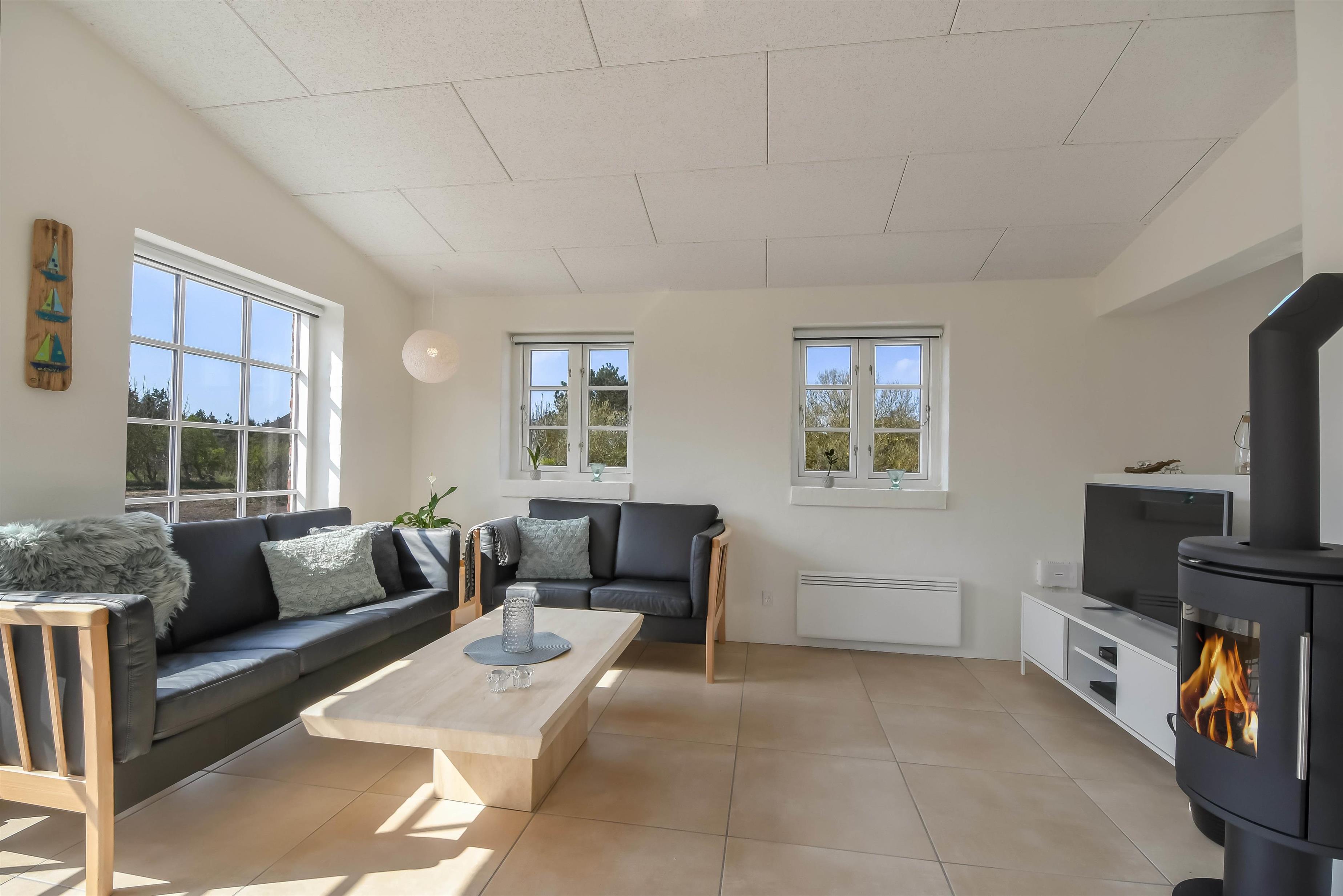 Det lyse opholdsrum med brændeovn og gulvvarme indbyder til hyggelige stunder året rundt – uanset vejret udenfor.