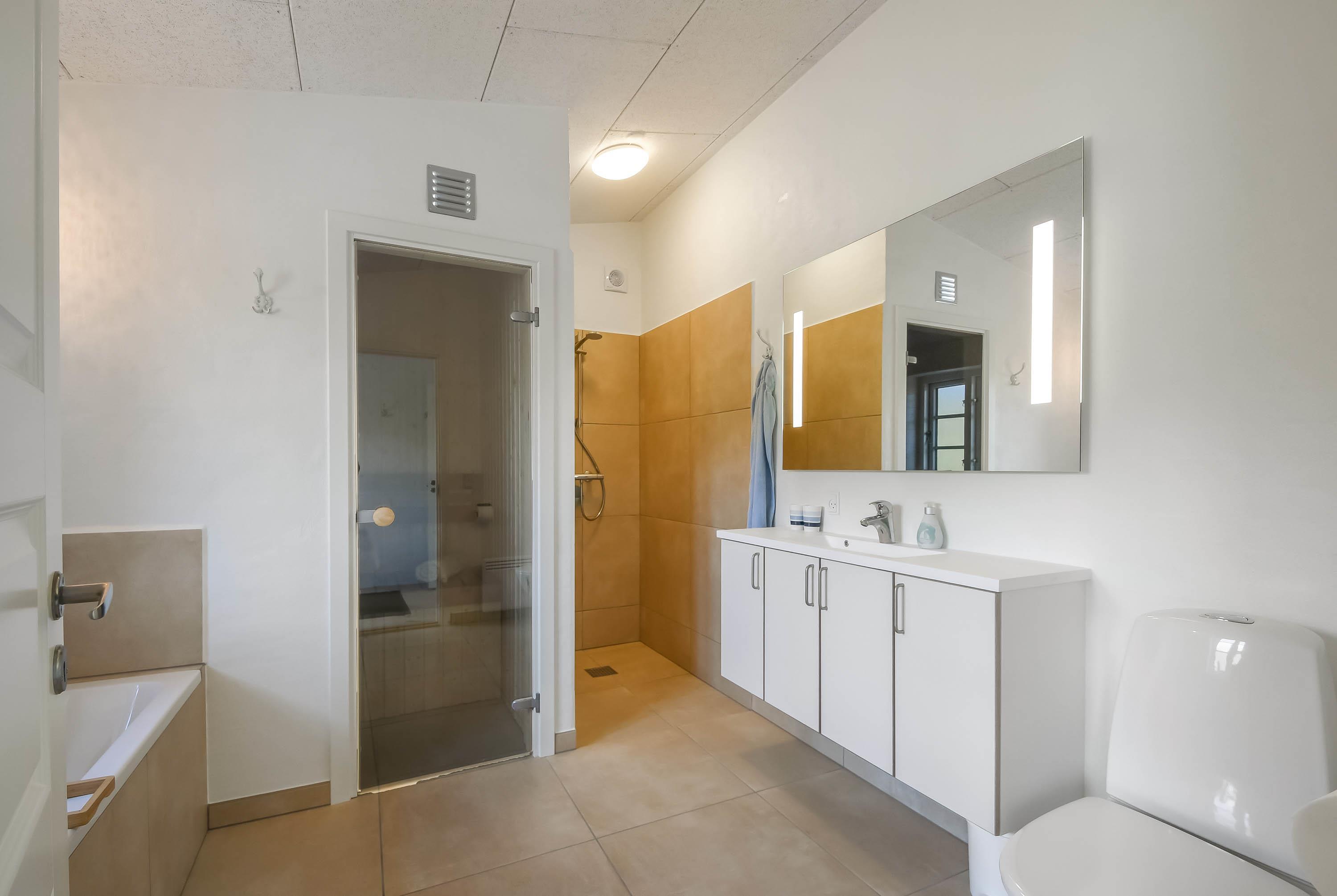 Lyst badeværelse med sauna, badekar, gulvvarme og stor bruseniche