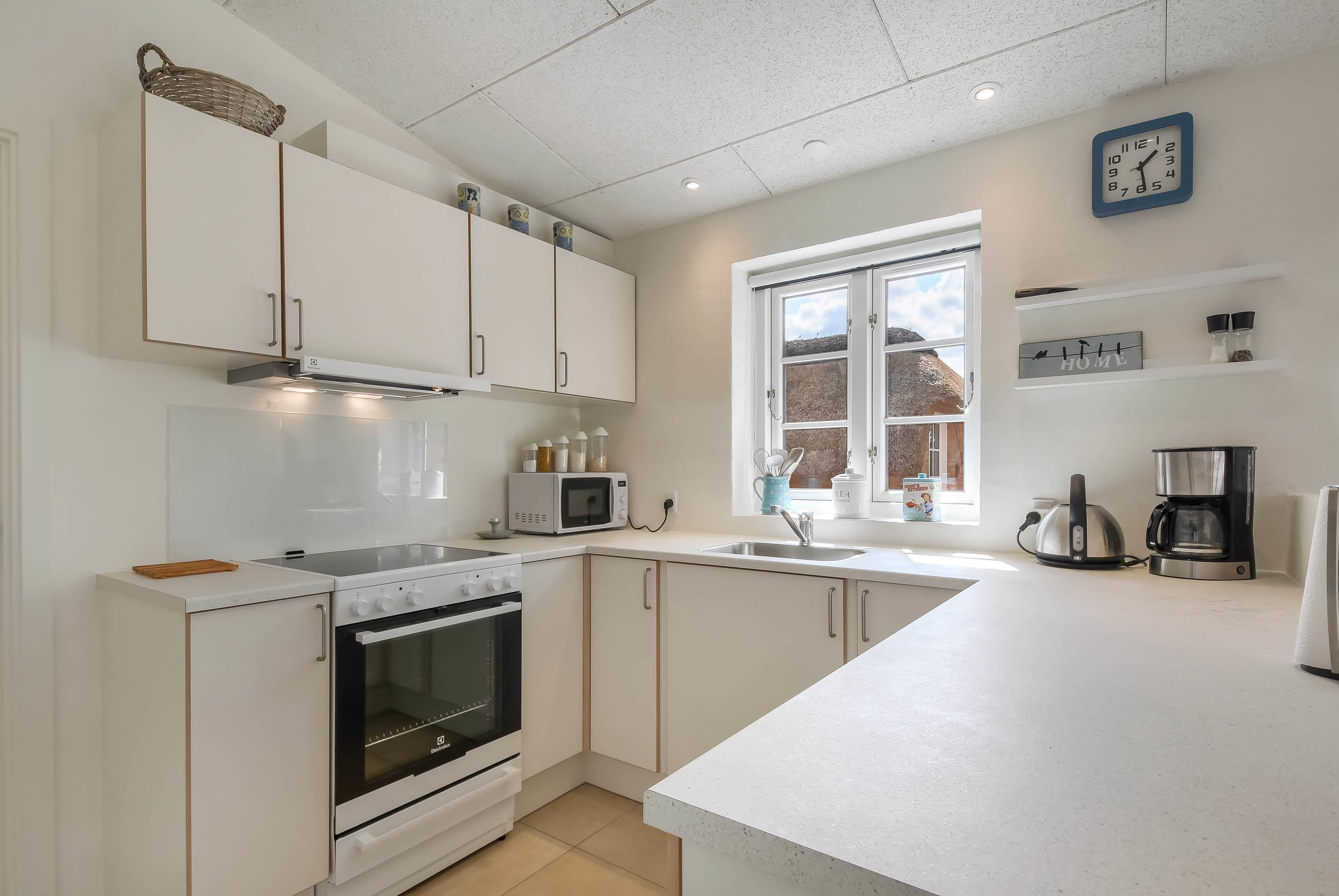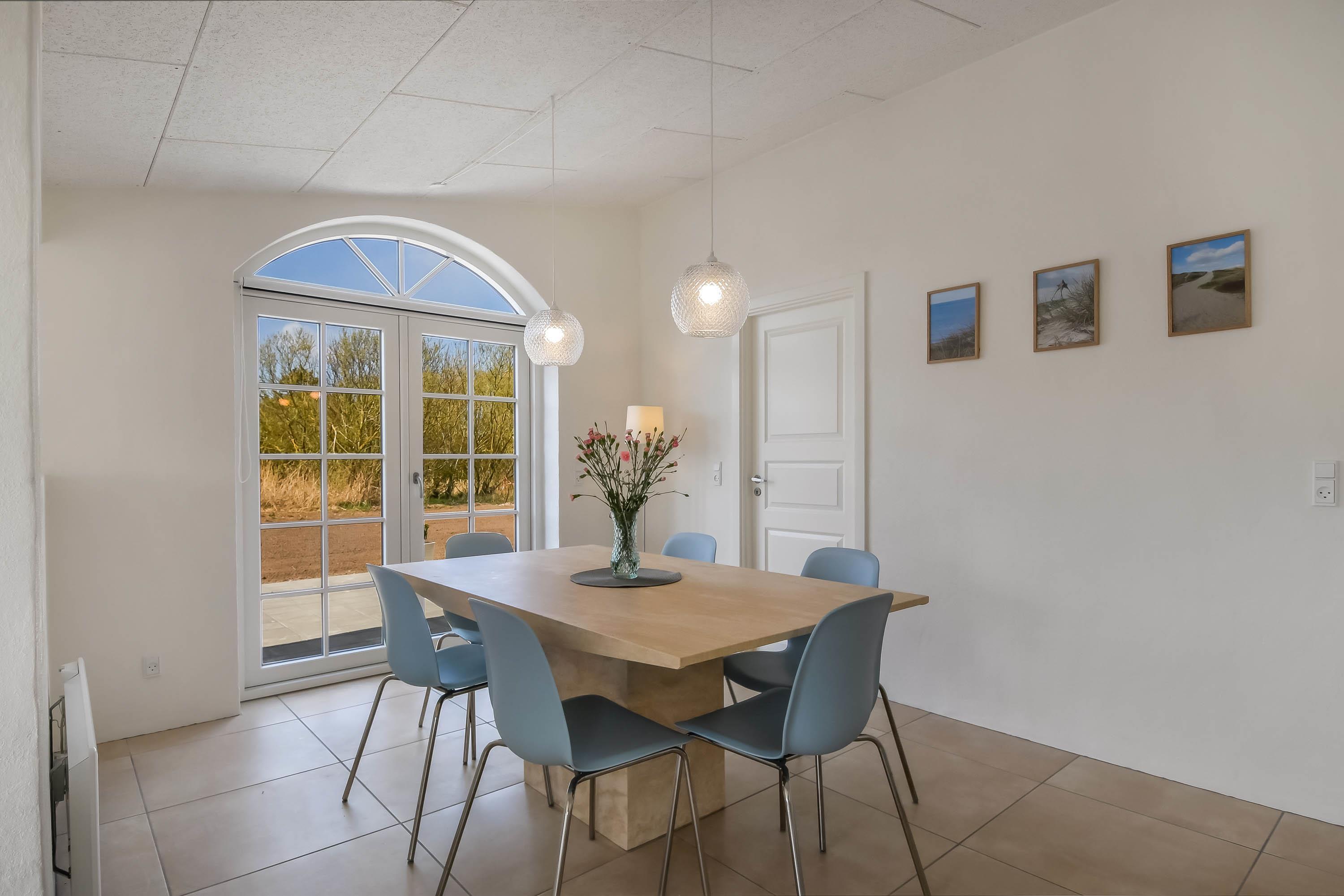 Veludstyret køkken med spiseplads og dobbeltdør til vestvendt terrasse
