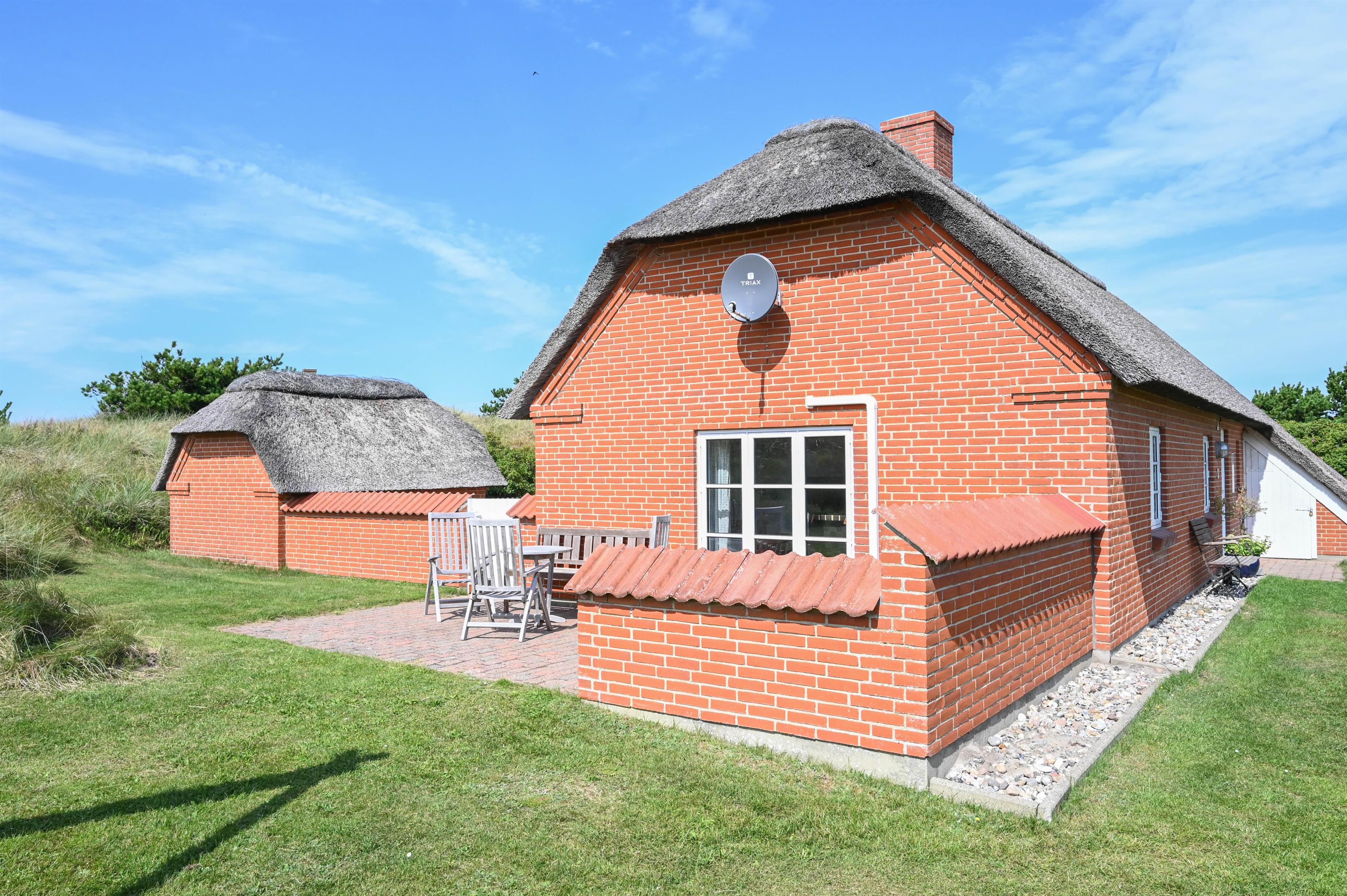 Huset ligger på en 1210 m² stor klitgrund, omgivet af smuk natur og frisk havluft. Den store, lukkede terrasse, som vender mod syd, nord og vest, byder på fantastiske læforhold – her kan du altid finde et fredfyldt hjørne i solen, uanset vindretningen.