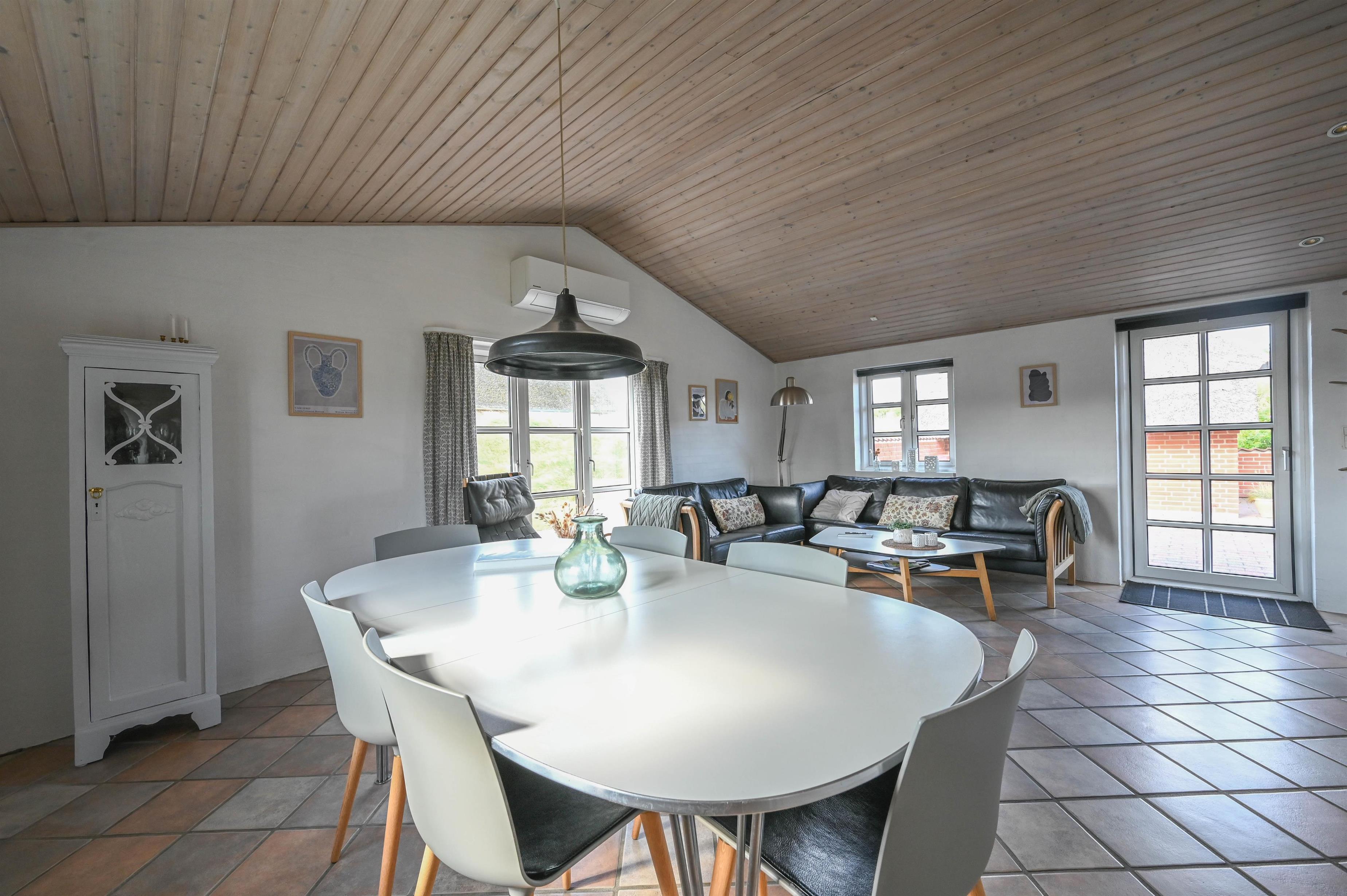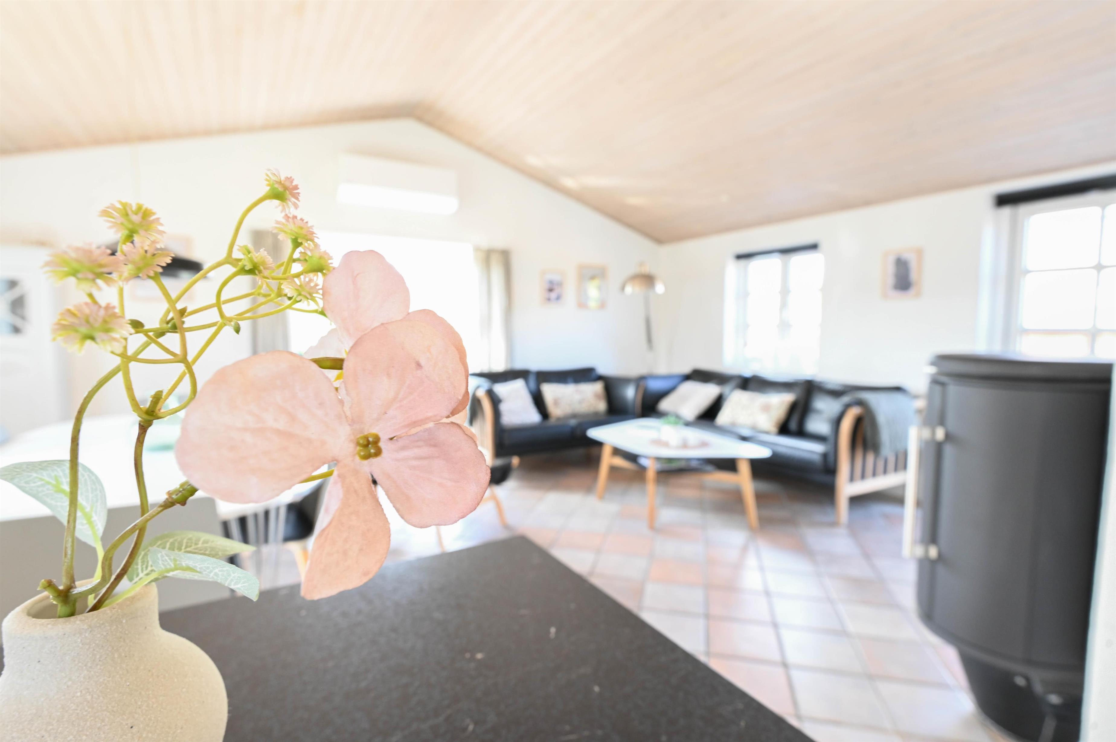Indenfor byder huset på en lys, hyggelig og smagfuldt indrettet stue i åben forbindelse med køkkenet. Her skaber klinkegulve, brændeovn og behagelig indretning en varm og indbydende atmosfære – ideelt til både rolige aftener og hyggelige familiestunder.
