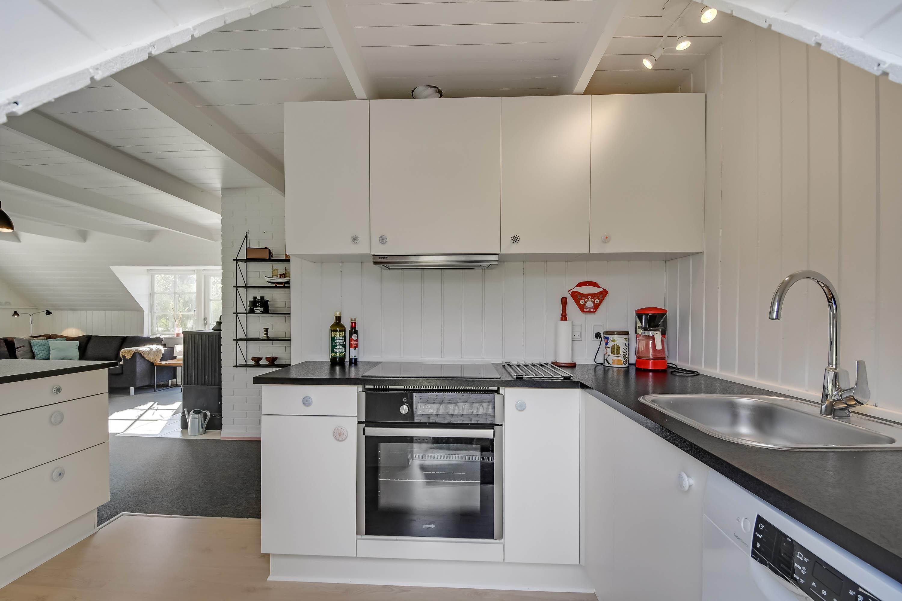 Det åbne køkken ligger i direkte forbindelse med spiseplads og stue, så man kan lave mad, tale og hygge sig på samme tid.