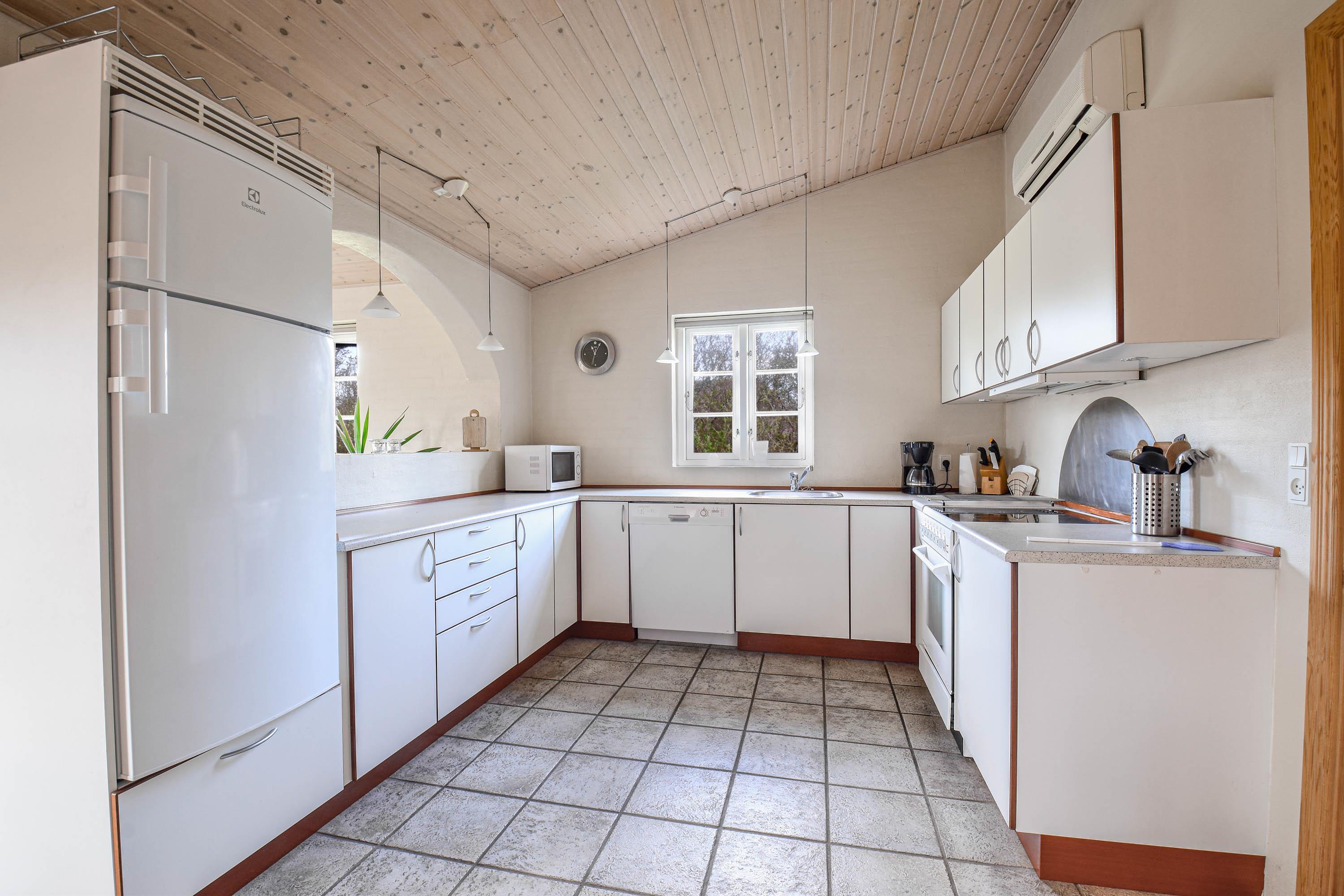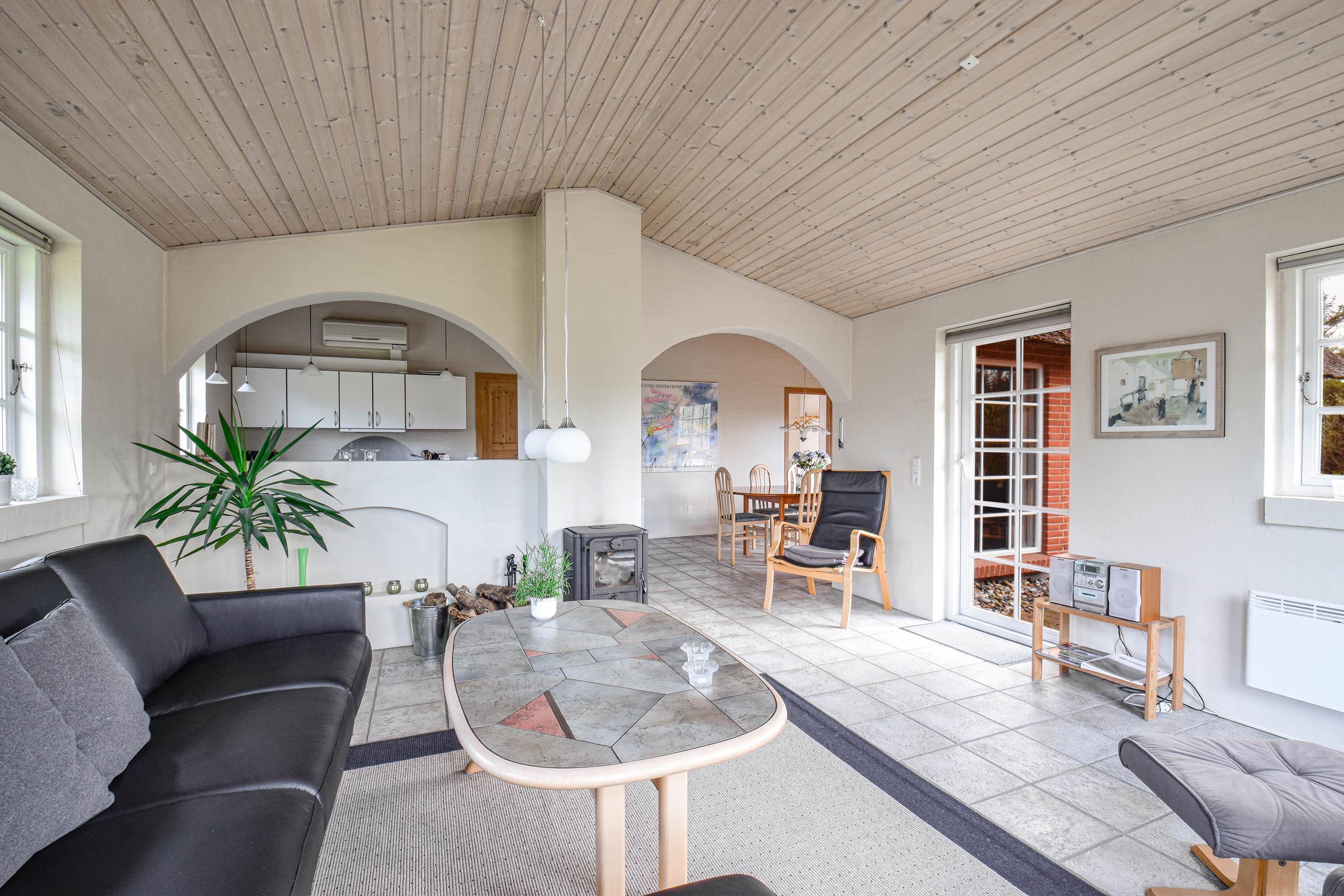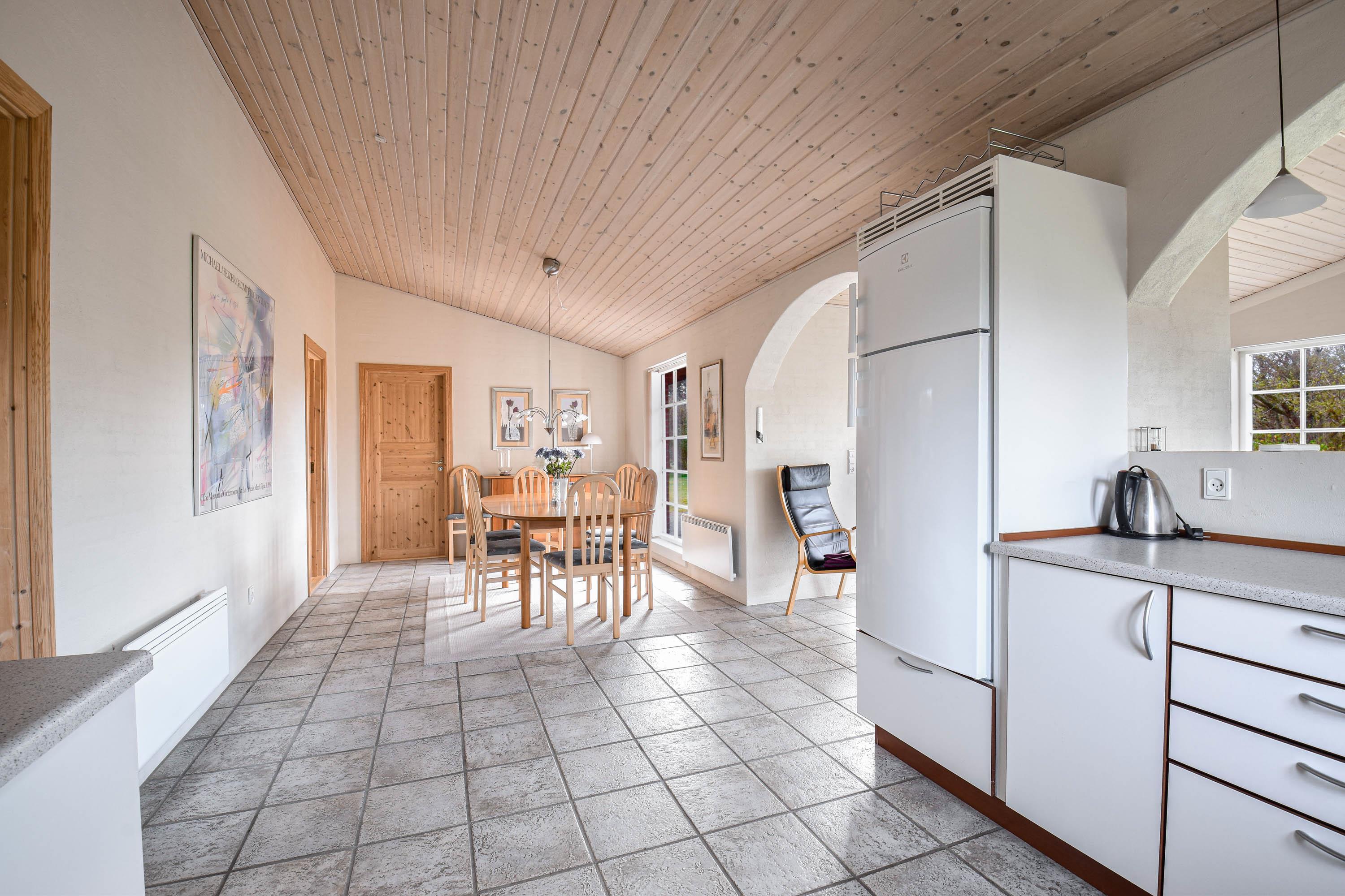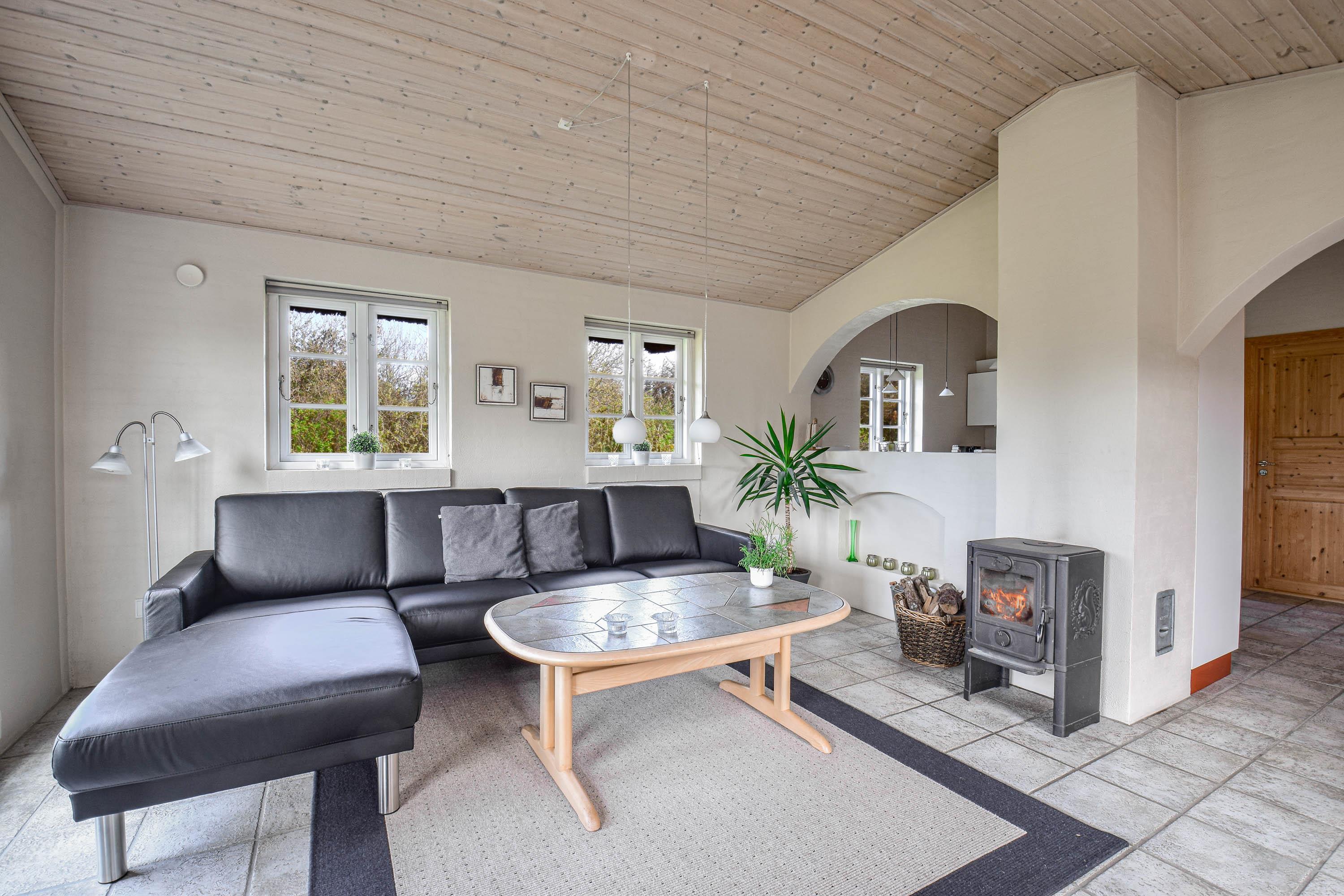 Det flotte vinkelkøkken ligger i åben forbindelse med stuen, hvor brændeovnen sørger for varme og hygge på kølige dage. Fra stuen er der udgang til terrassen – perfekt til morgenkaffe, grillhygge eller bare at nyde roen.
