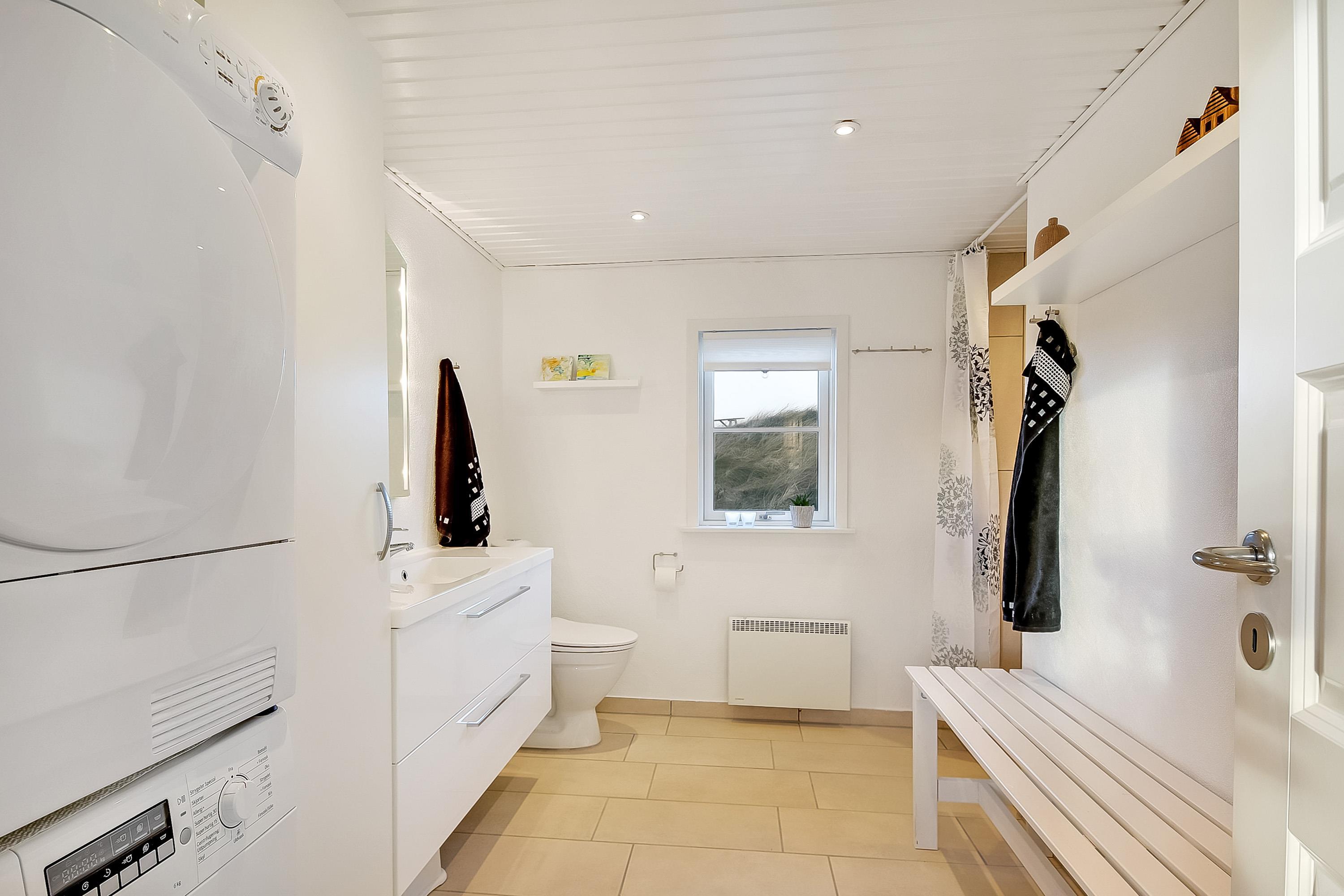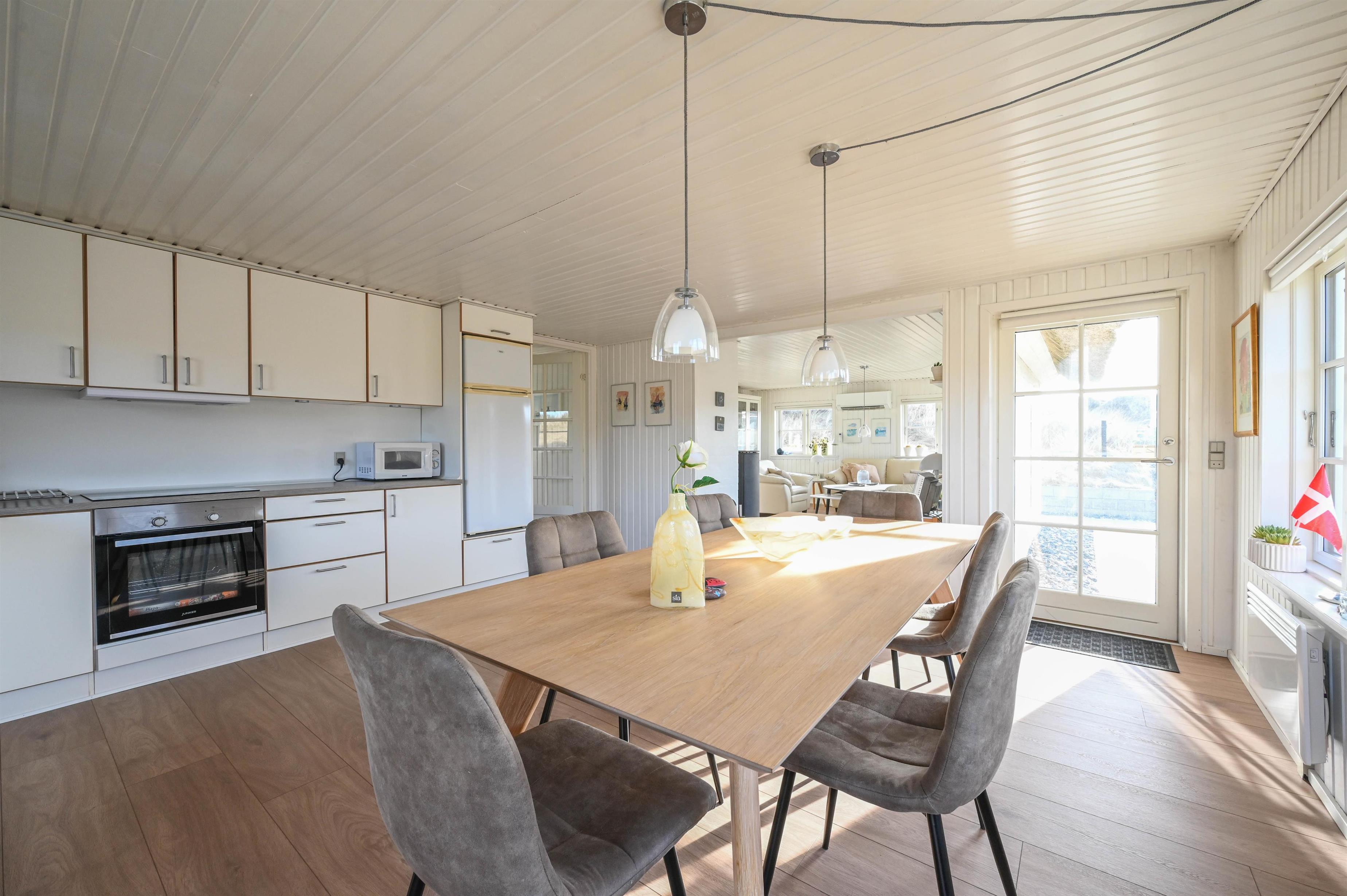 Indretning: Entre som fungerer som fordelingsgang til husets værelser og badeværelse. Fra entreen er der desuden indgang til husets store køkken/alrum, hvorfra der er udgang til terrasse mod vest og udsigt til klitterne. Køkken/alrum ligger i åben forbindelse med stuen, der er hyggeligt indrettet med komfortable møbler og brændeovn.