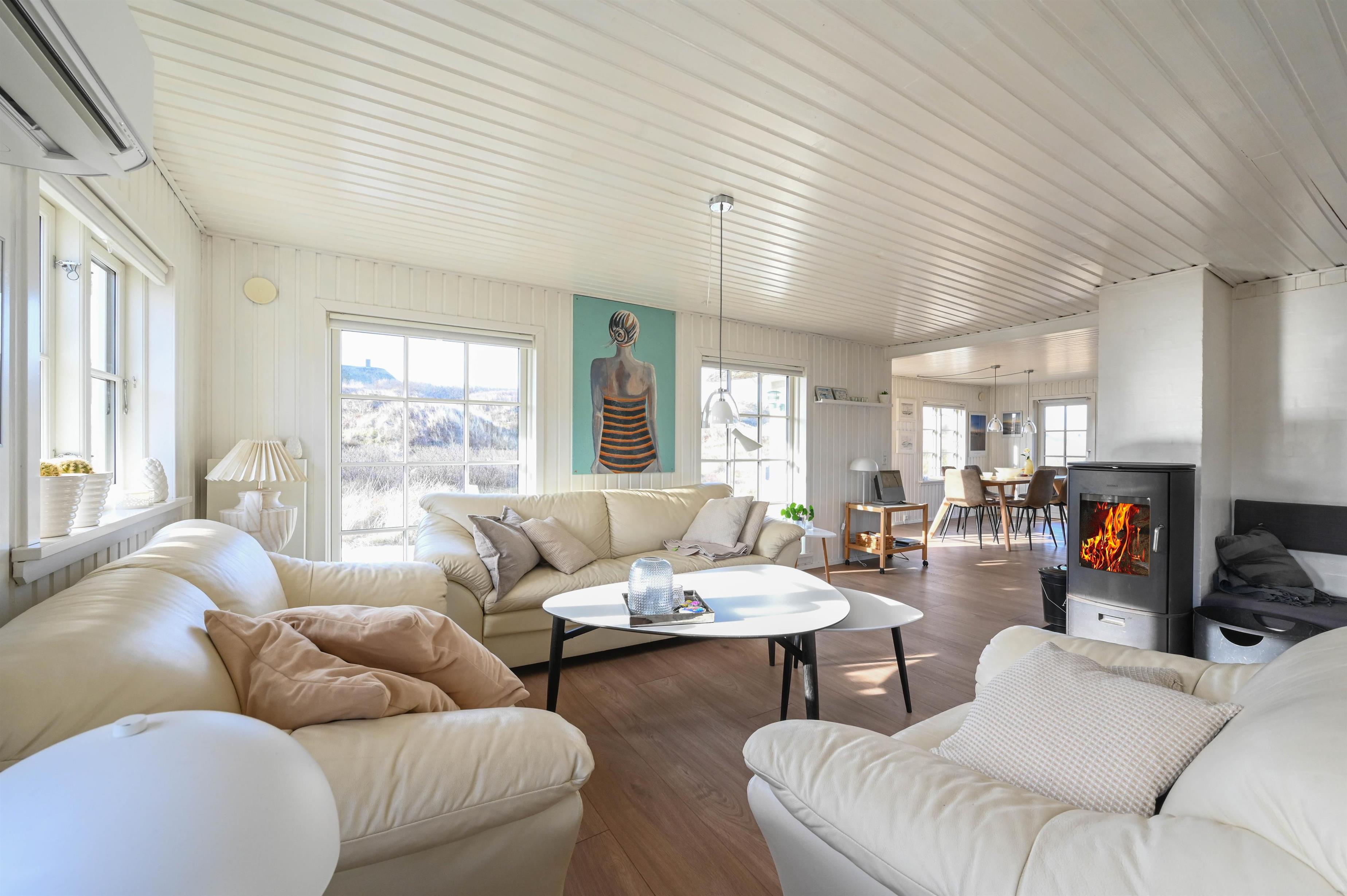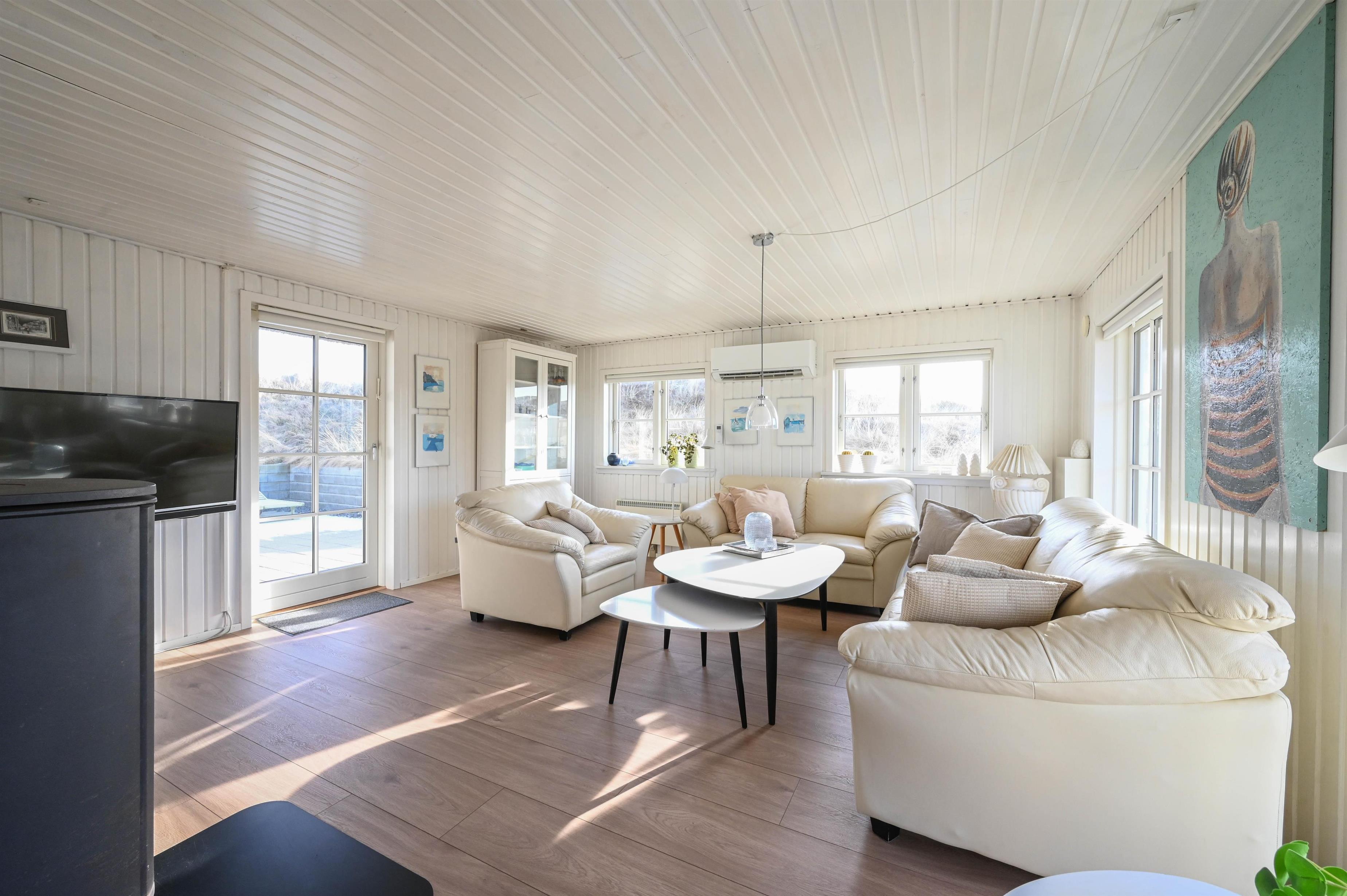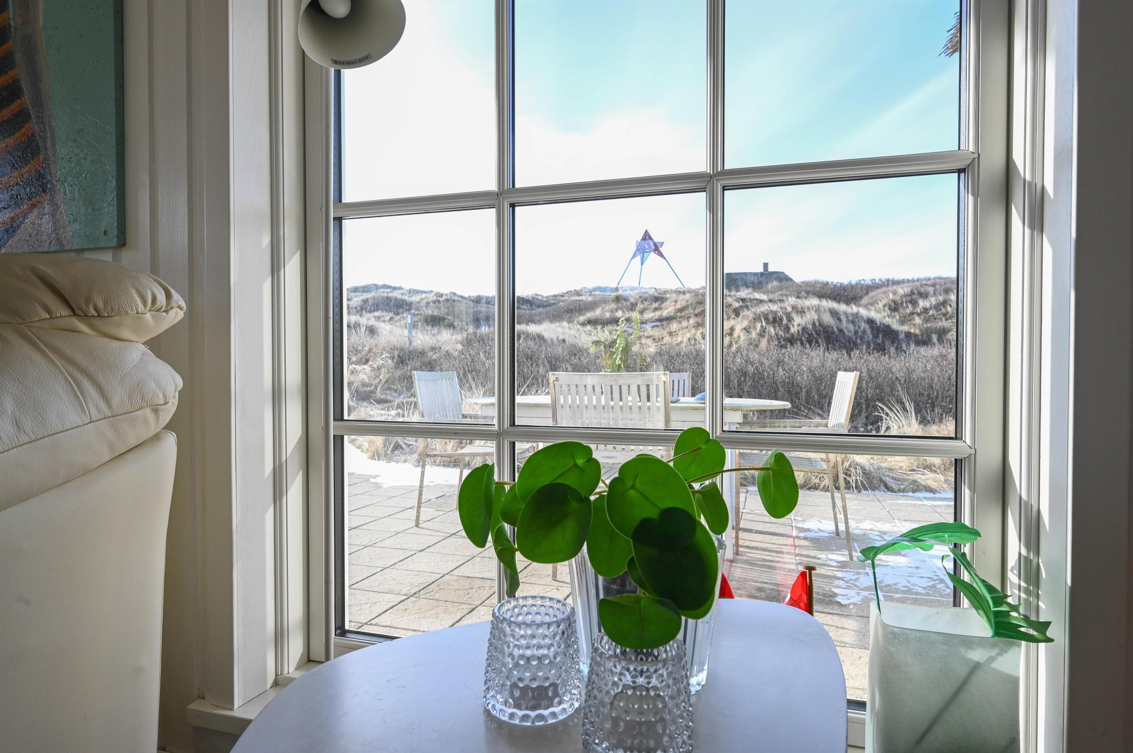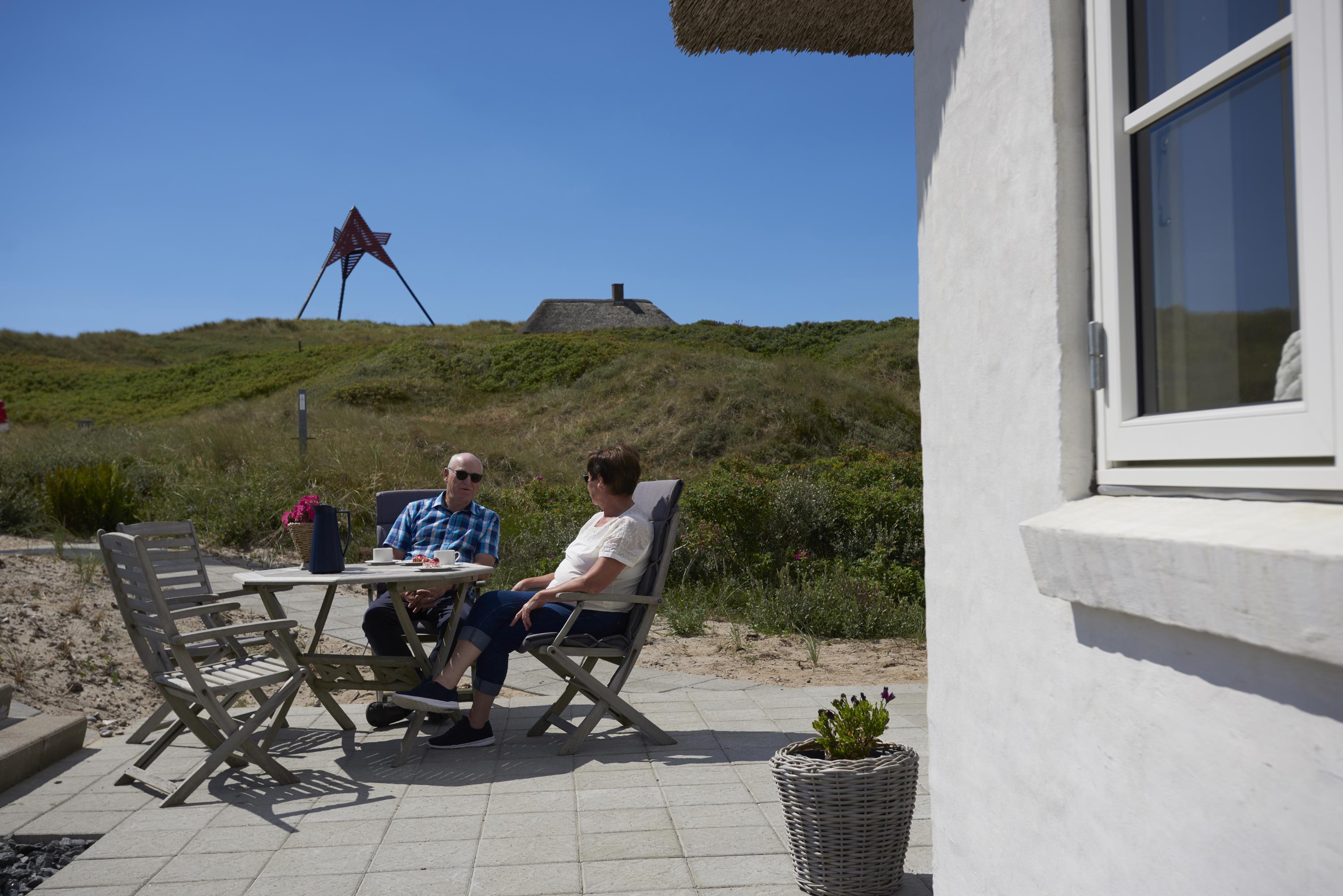 Fra stuen er der udgang til den syd/vest-vendte terrasse, der er hyggeligt og naturligt omkranset af klitterne.