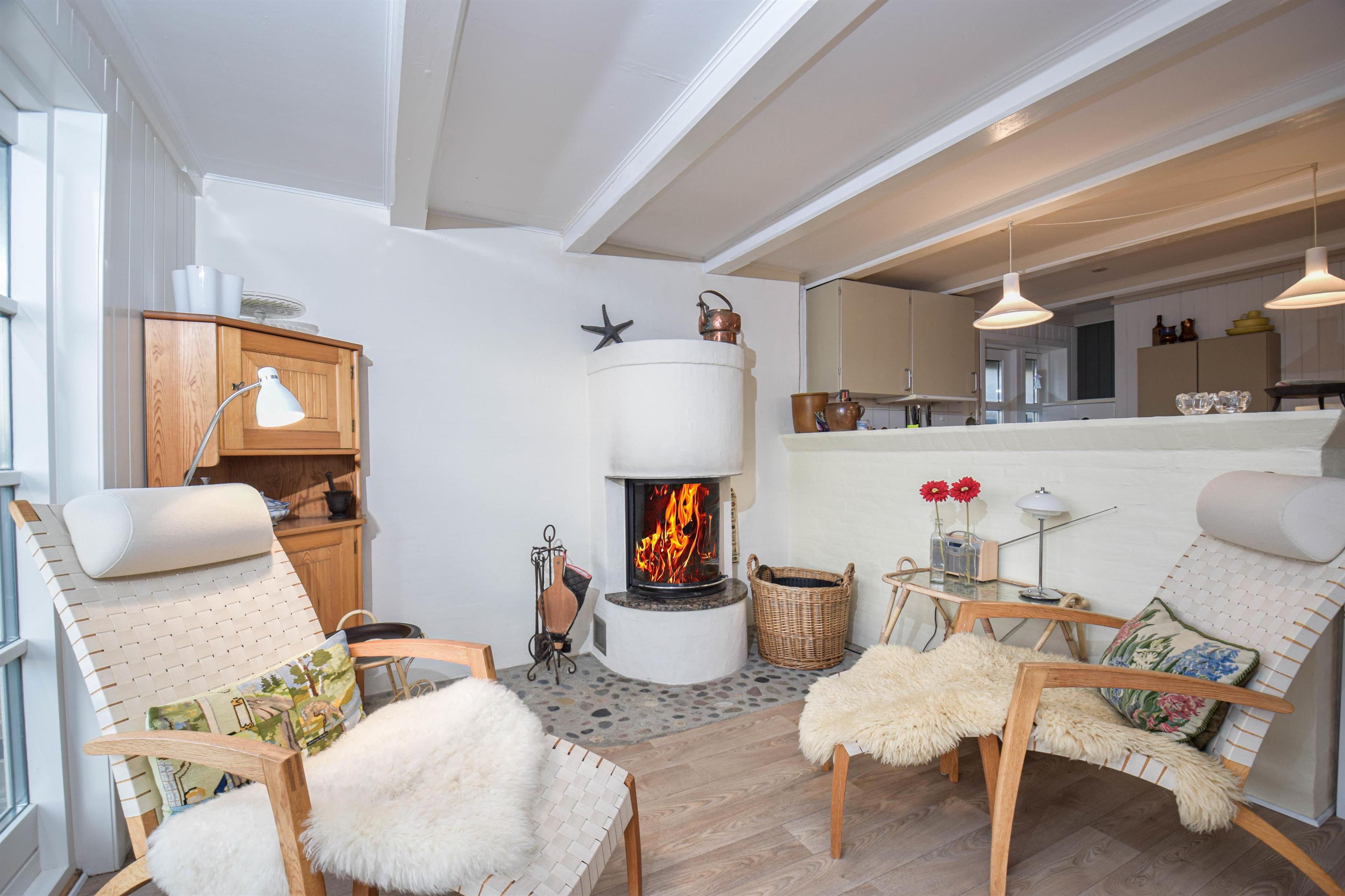Det åbne køkken ligger i forbindelse med stuen, hvor brændeovnen skaber varme og stemning på kølige dage.