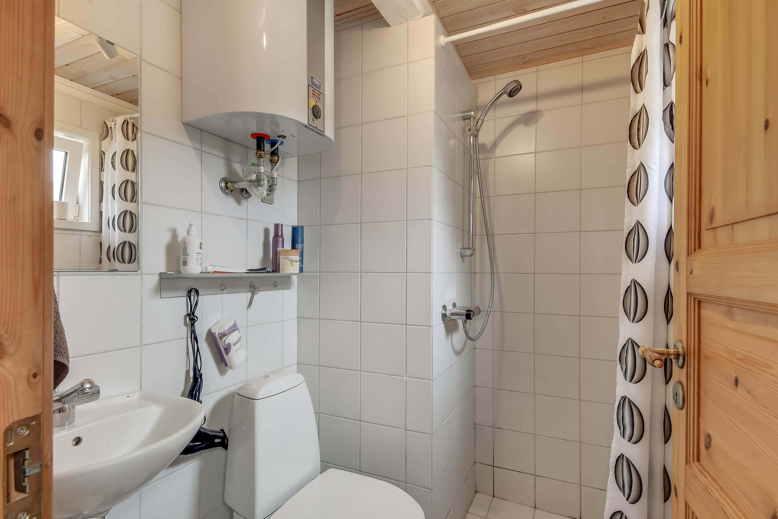 Pænt badeværelse med bruser og toilet