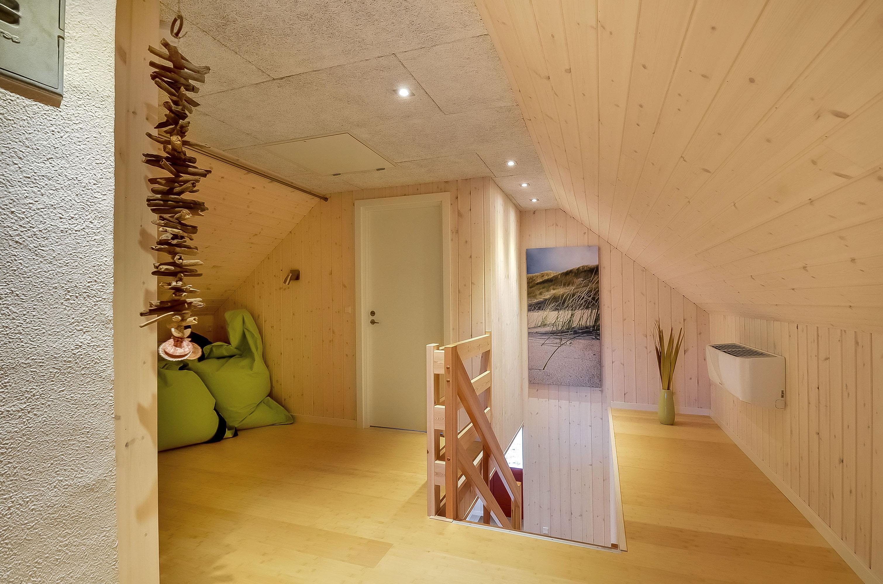 På 1. sal finder du et stort, lyst soveværelse med dobbeltseng, et lille renoveret toilet og et hyggeligt repos med udsigt til trætoppene.