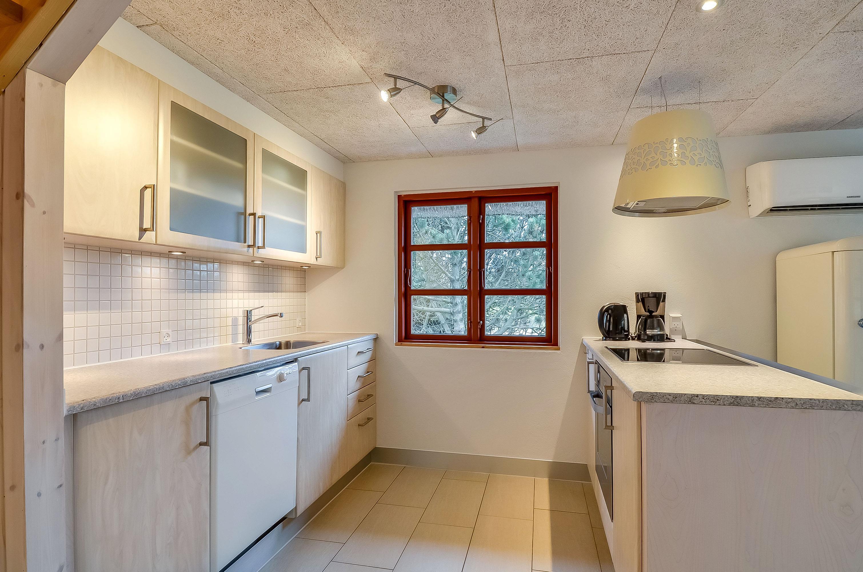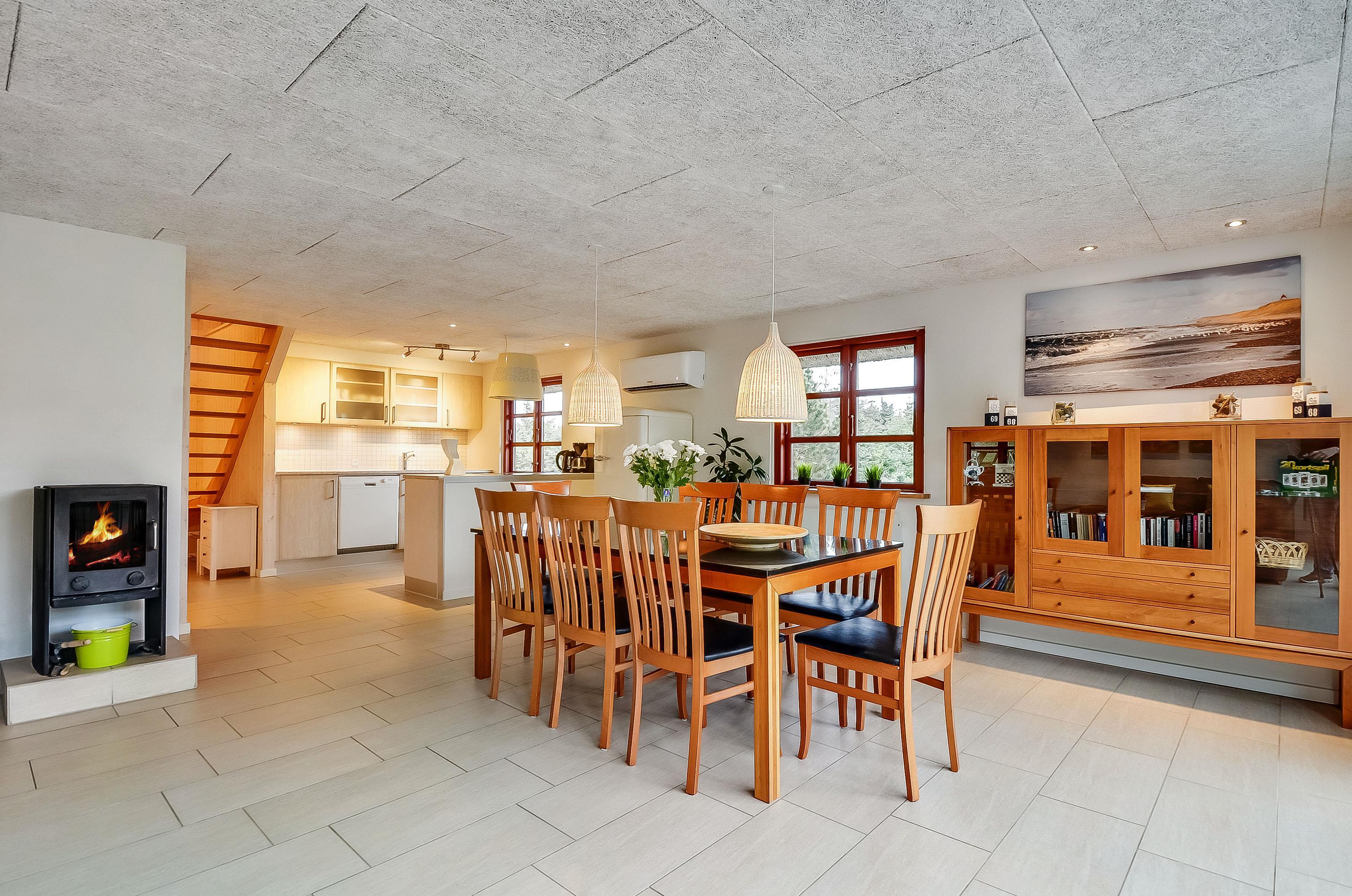 Det lyse og veldisponerede køkken ligger i åben forbindelse med stuen, hvor der både er plads til hyggelige måltider ved spisebordet og afslapning foran brændeovnen. Herfra er der direkte udgang til den solrige, sydvendte terrasse – et oplagt sted til morgenkaffen, grillmiddage eller bare ren afslapning i solen.
