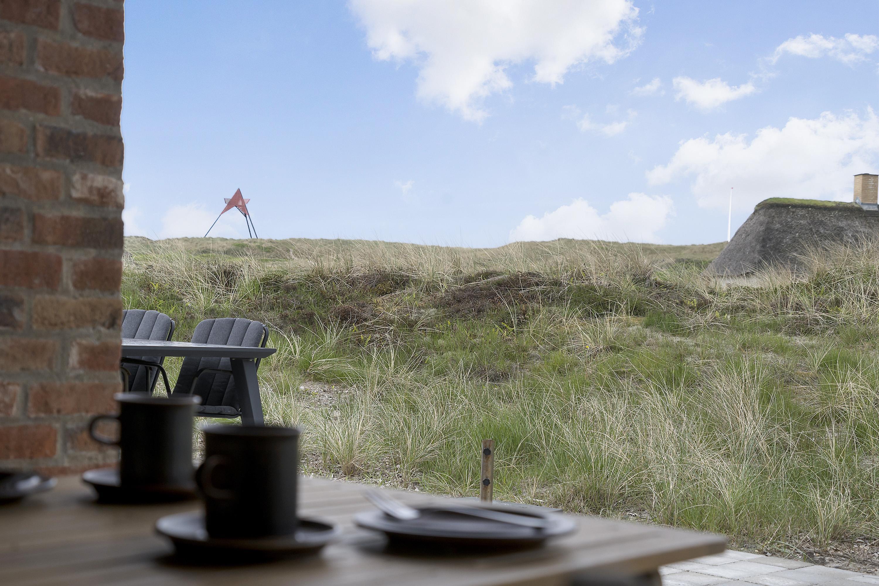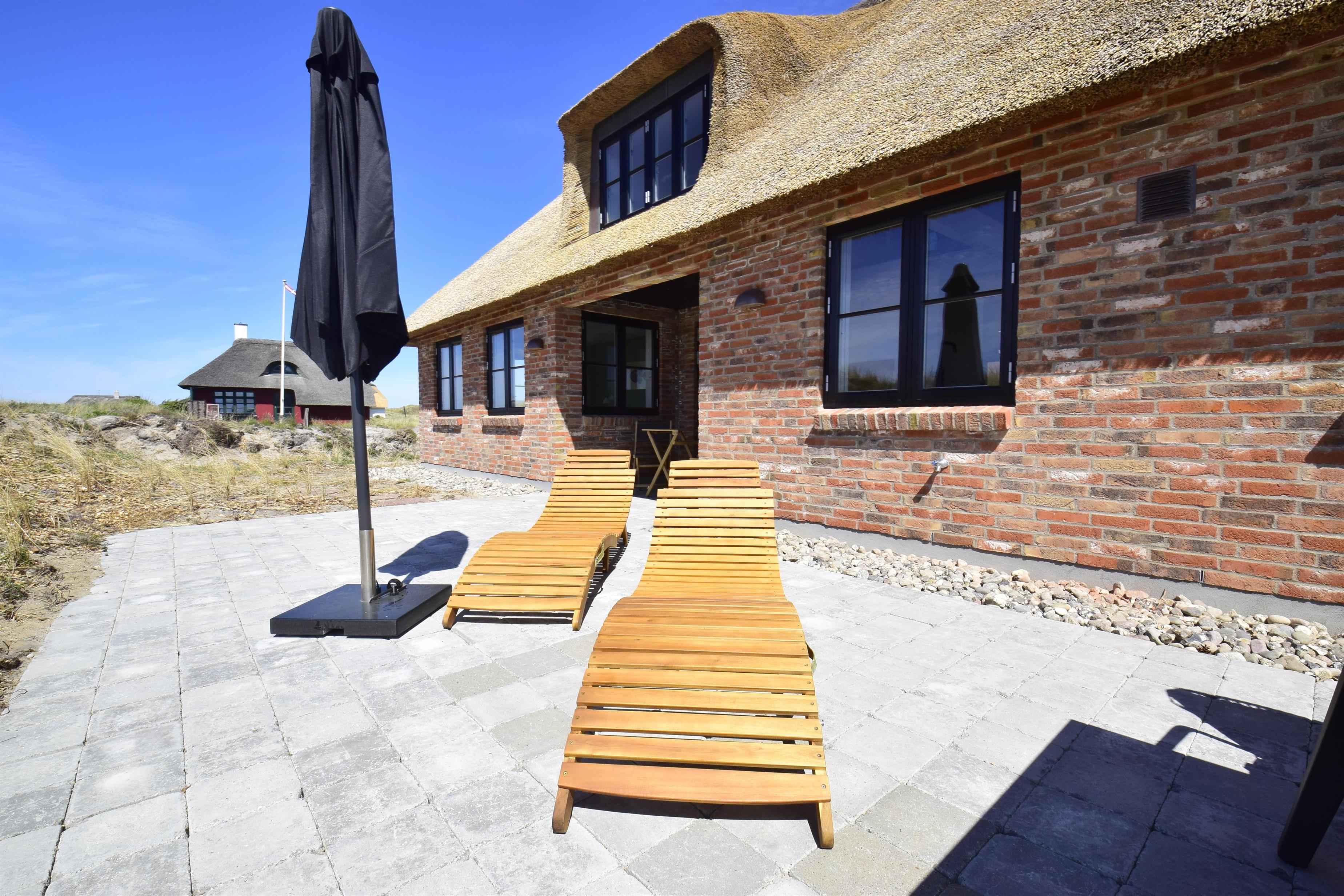 Udenfor er der gode terrasser mod syd og vest med udendørs brus med varmt vand, der kan bruges efter en badetur ved havet. Et feriehus med mange velovervejede detaljer, på en af de bedste grunde på det ”gamle” Vedersø Klit.