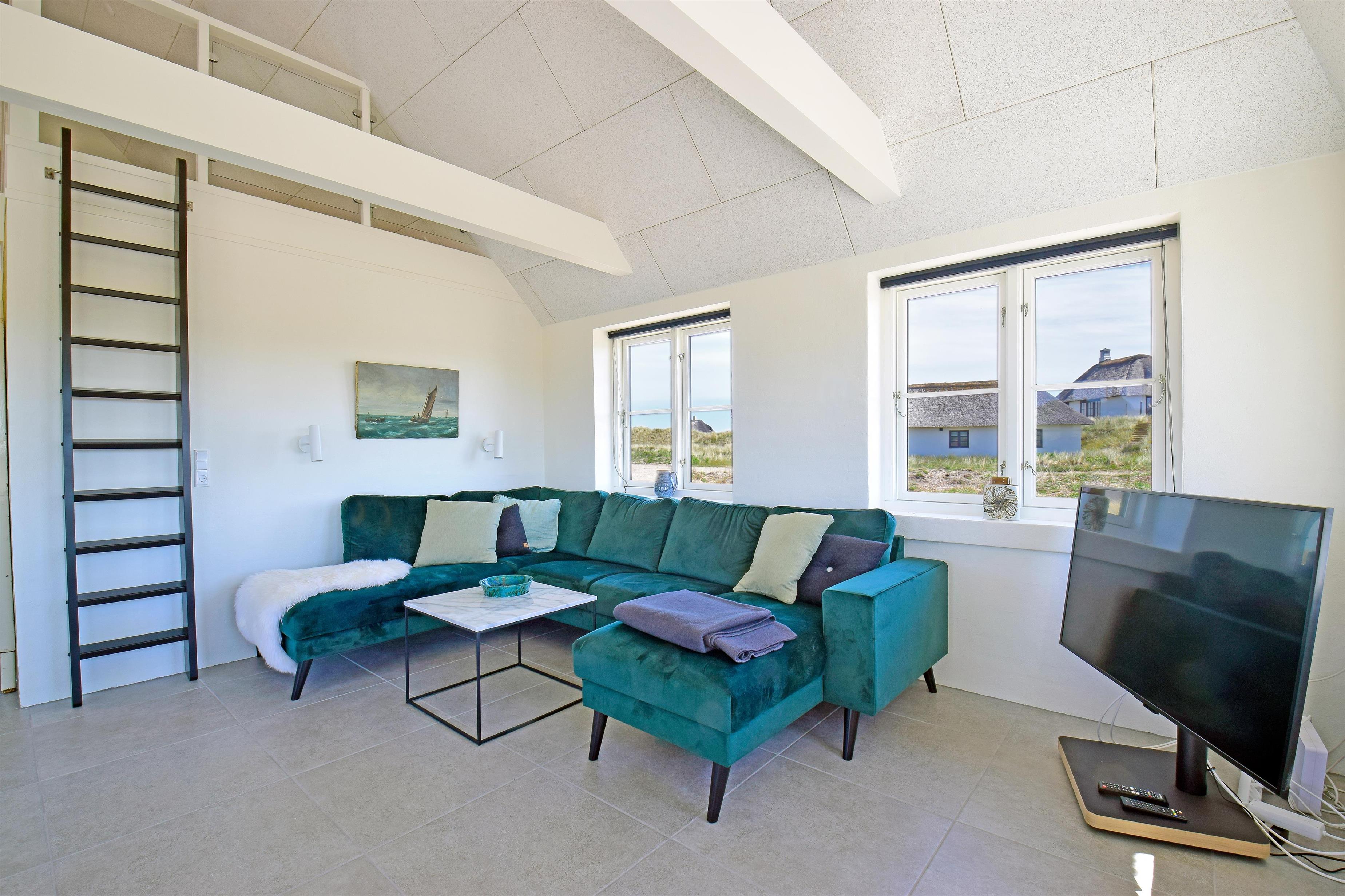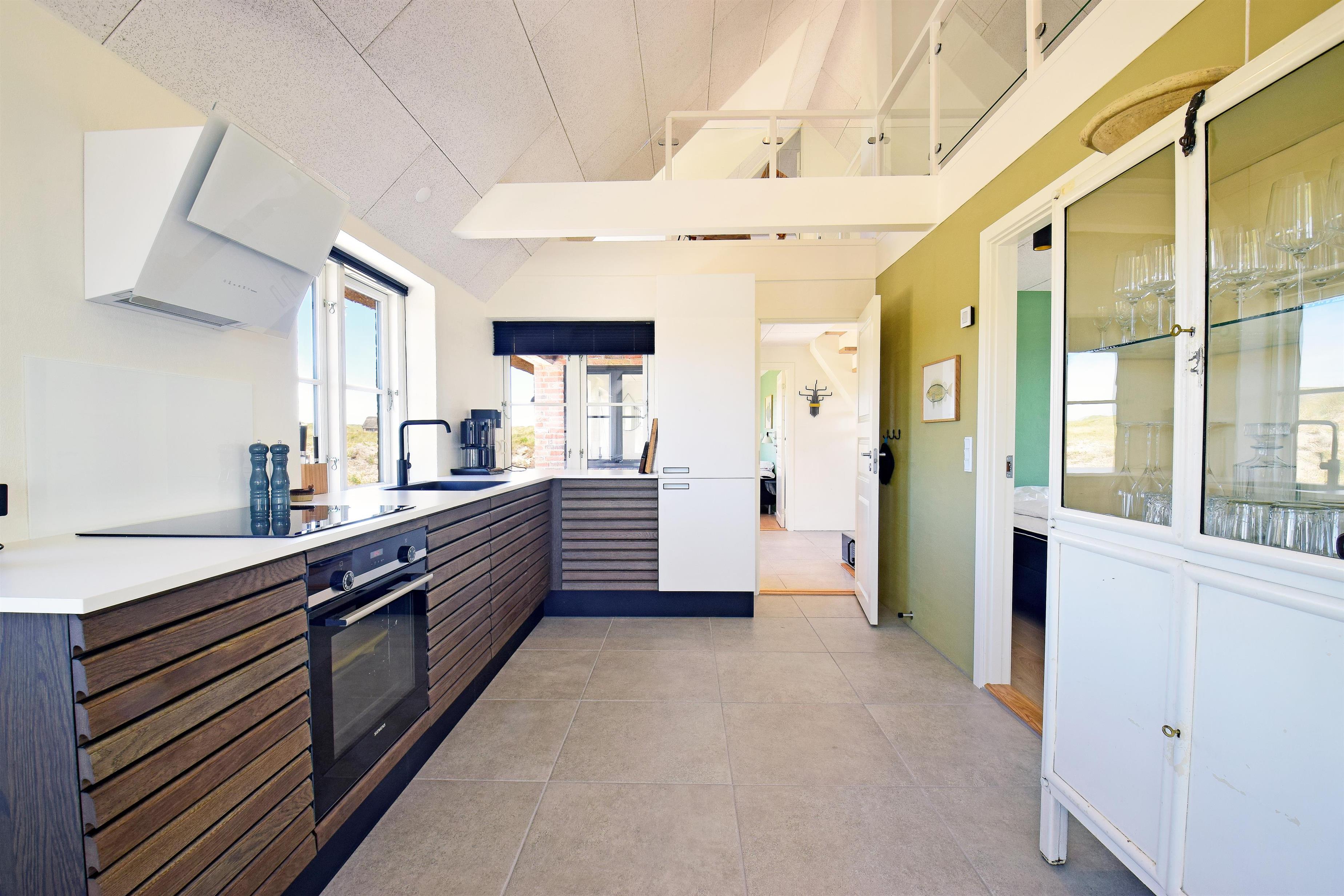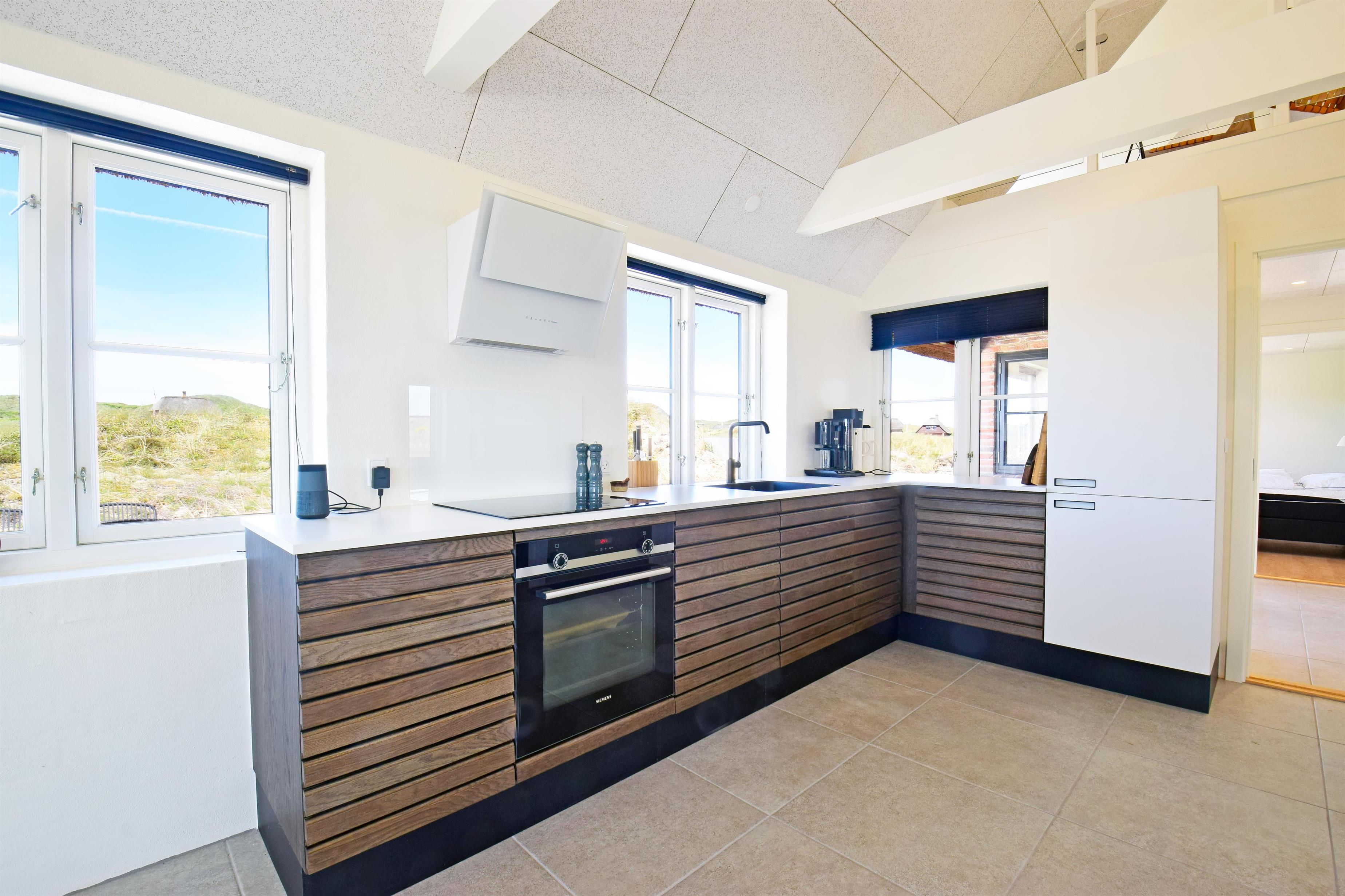 Indretning: Stor lys entre med trappe til 1. sal samt vaskemaskine og tørretumbler. I stueplan der et stort badeværelse med dobbelt bruseniche, sauna samt badekar med udsigt til klitterne. Stort soveværelset (1) med dobbeltseng (180 cm bred), hvor vinduer åbner op for syd, vest og nord så det næsten giver en 180 grader udsigt til klitterne. Derudover rummer værelset et skrivebord med skærm; her kan du sidde med udsigt til Sømærket. Køkkenet er af høj kvalitet og veludstyret, og i åben forbindelse med stuen. Mod vest mellem det store soveværelse og køkkenet er en lille overdækket terrasse, der giver mulighed for at sidde ud i ly for blæst og regn. Husets stue er lys med mange vinduer mod øst, syd og vest så udsigten til de naturskabte klitter og det ikoniske sømærke kan nydes både fra spiseplads og sofa.