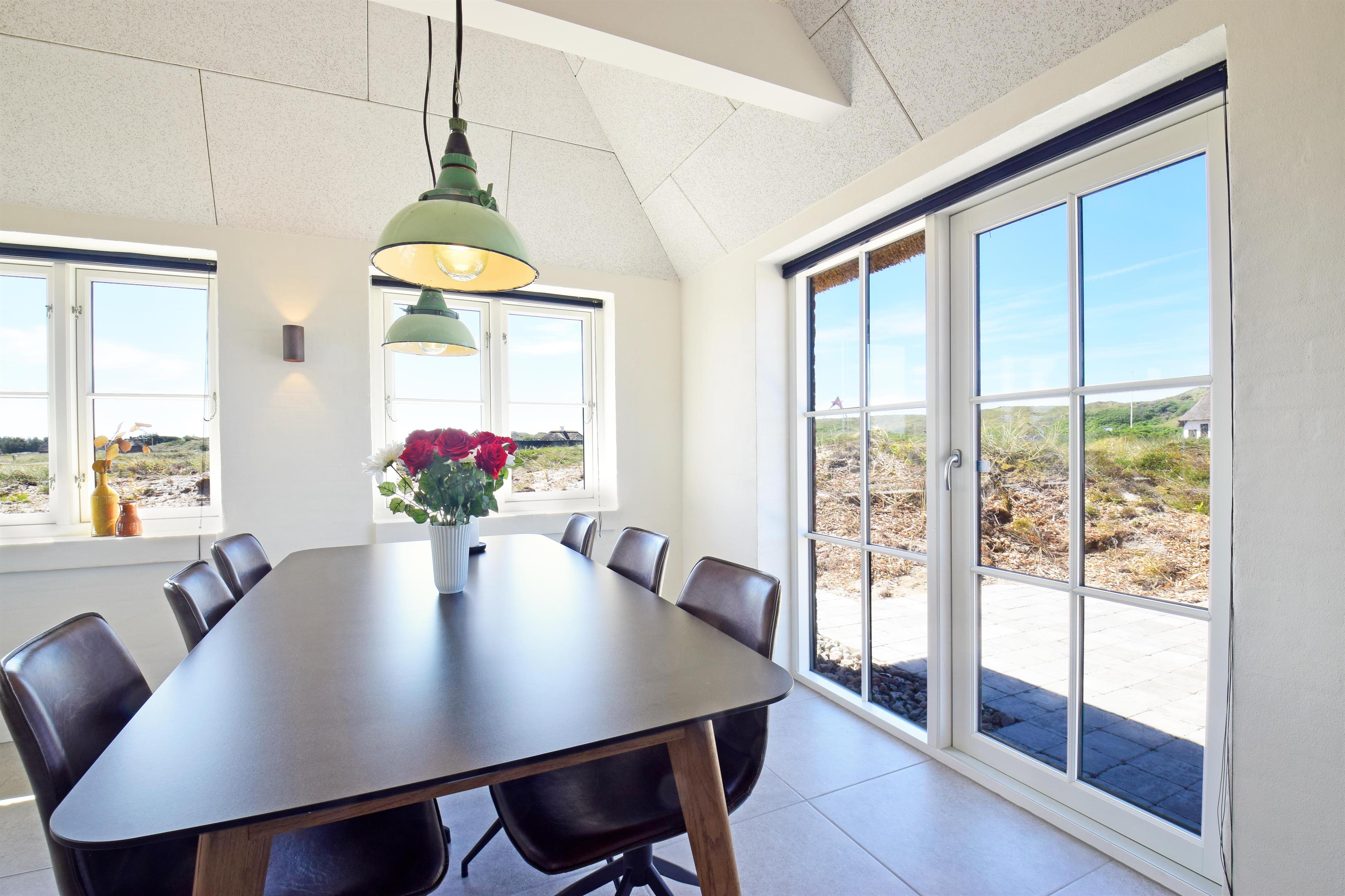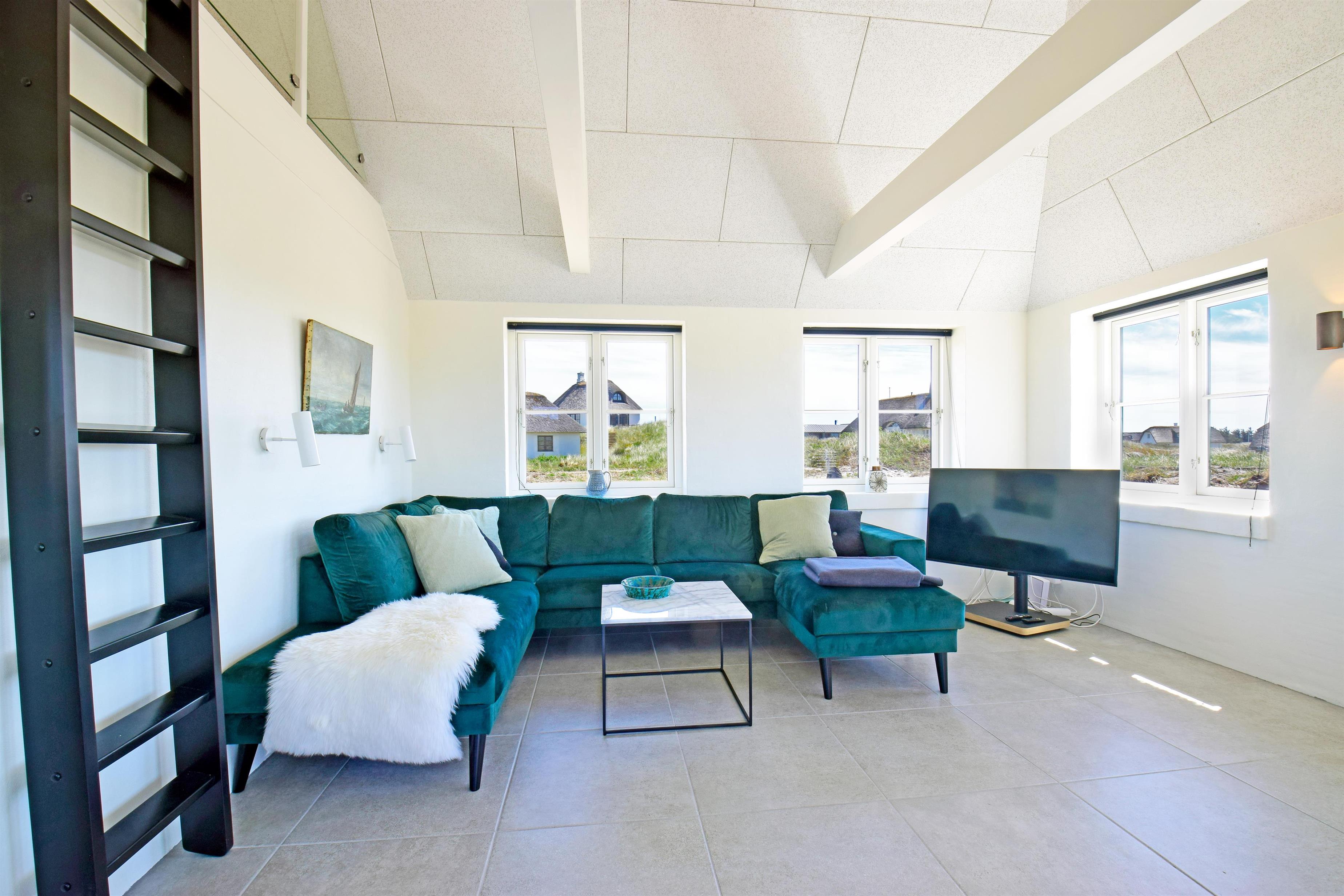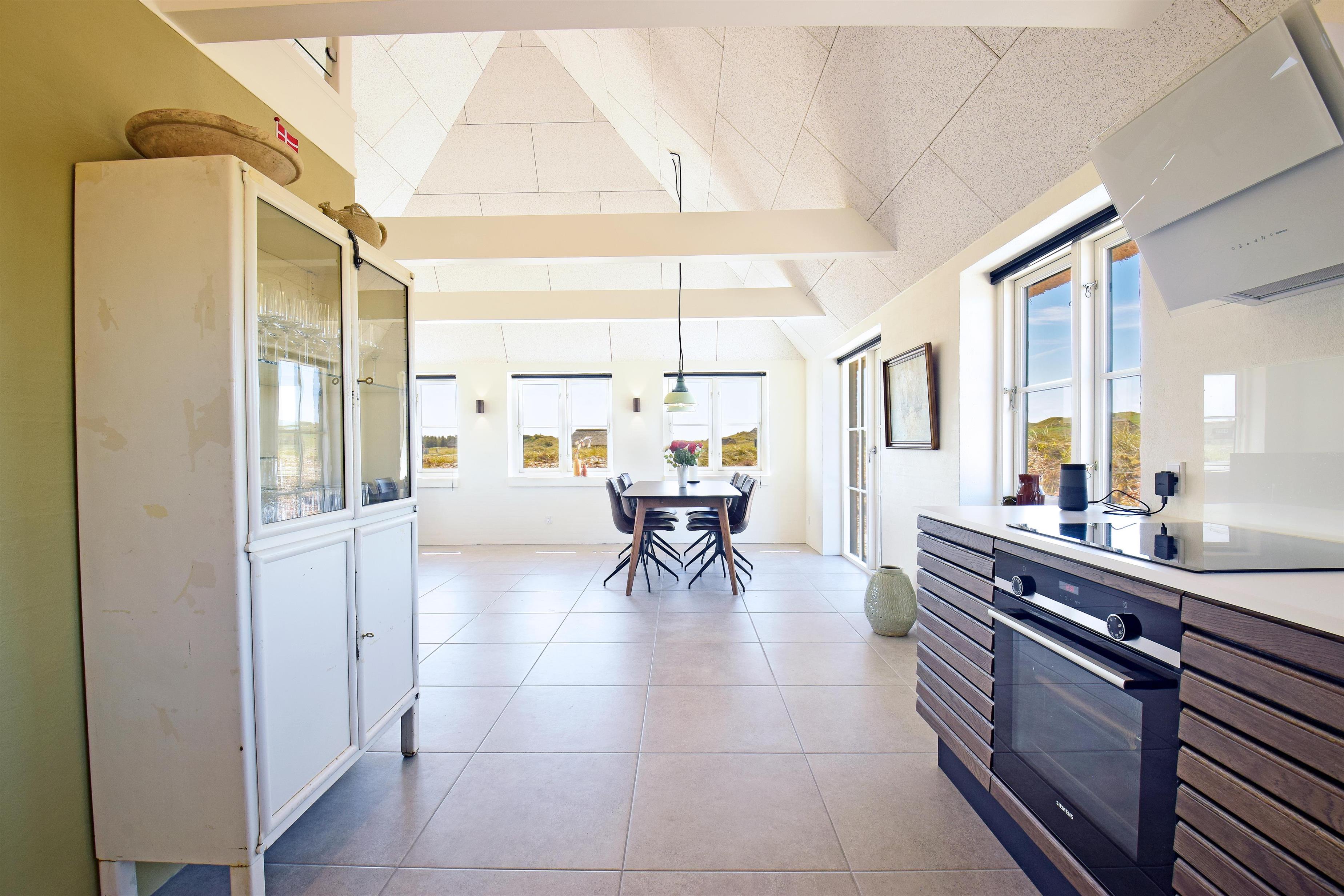 Indretning: Stor lys entre med trappe til 1. sal samt vaskemaskine og tørretumbler. I stueplan der et stort badeværelse med dobbelt bruseniche, sauna samt badekar med udsigt til klitterne. Stort soveværelset (1) med dobbeltseng (180 cm bred), hvor vinduer åbner op for syd, vest og nord så det næsten giver en 180 grader udsigt til klitterne. Derudover rummer værelset et skrivebord med skærm; her kan du sidde med udsigt til Sømærket. Køkkenet er af høj kvalitet og veludstyret, og i åben forbindelse med stuen. Mod vest mellem det store soveværelse og køkkenet er en lille overdækket terrasse, der giver mulighed for at sidde ud i ly for blæst og regn. Husets stue er lys med mange vinduer mod øst, syd og vest så udsigten til de naturskabte klitter og det ikoniske sømærke kan nydes både fra spiseplads og sofa.