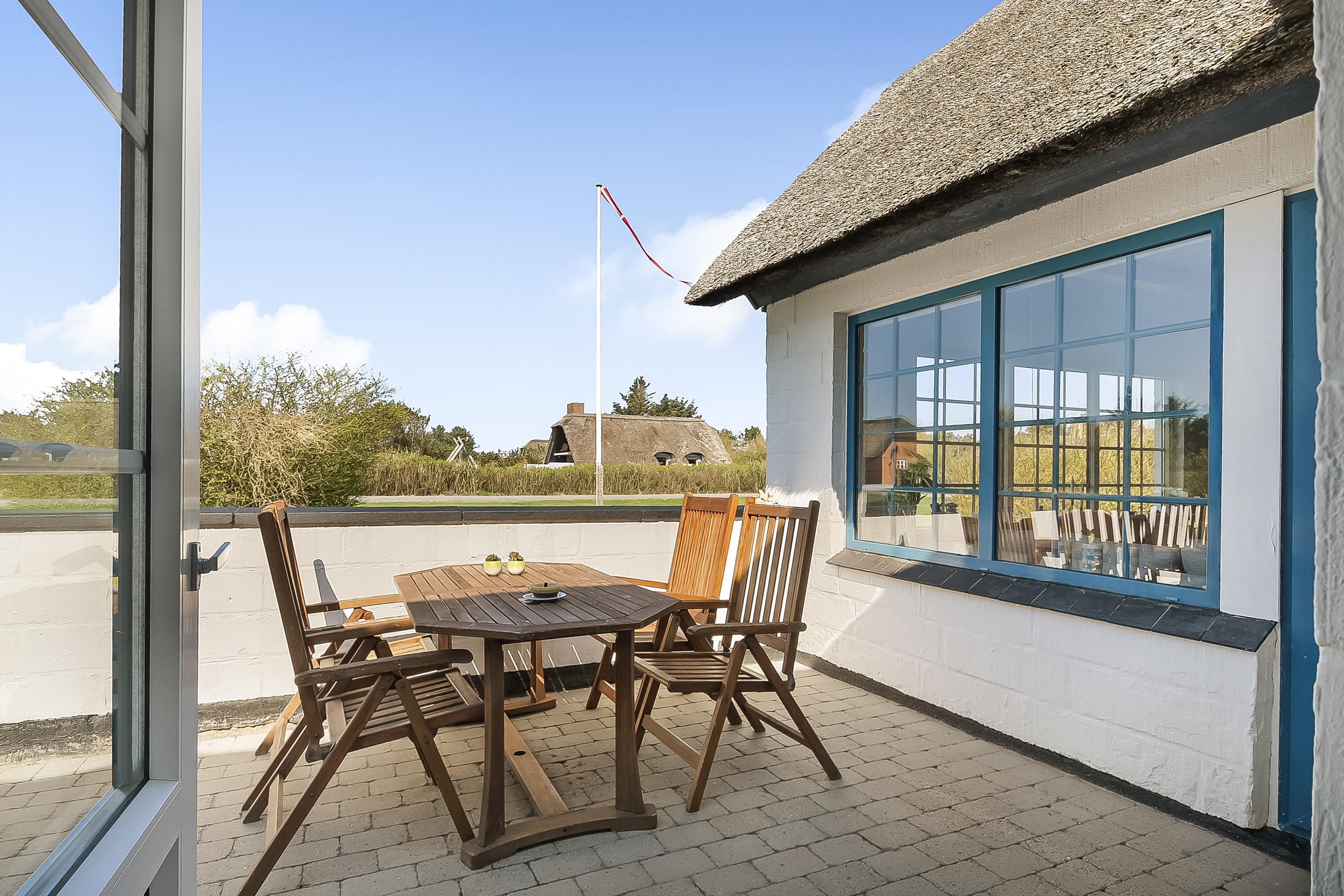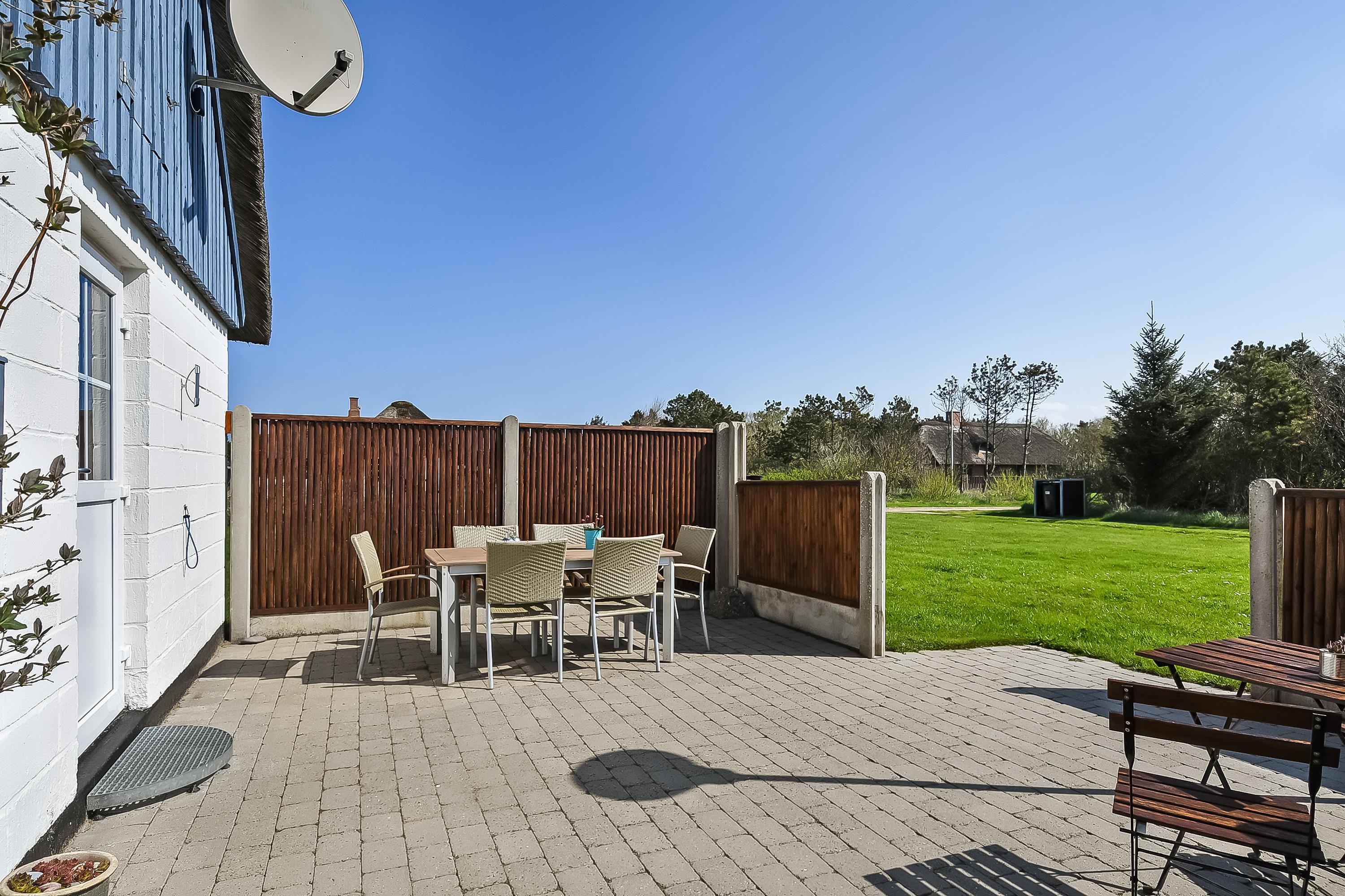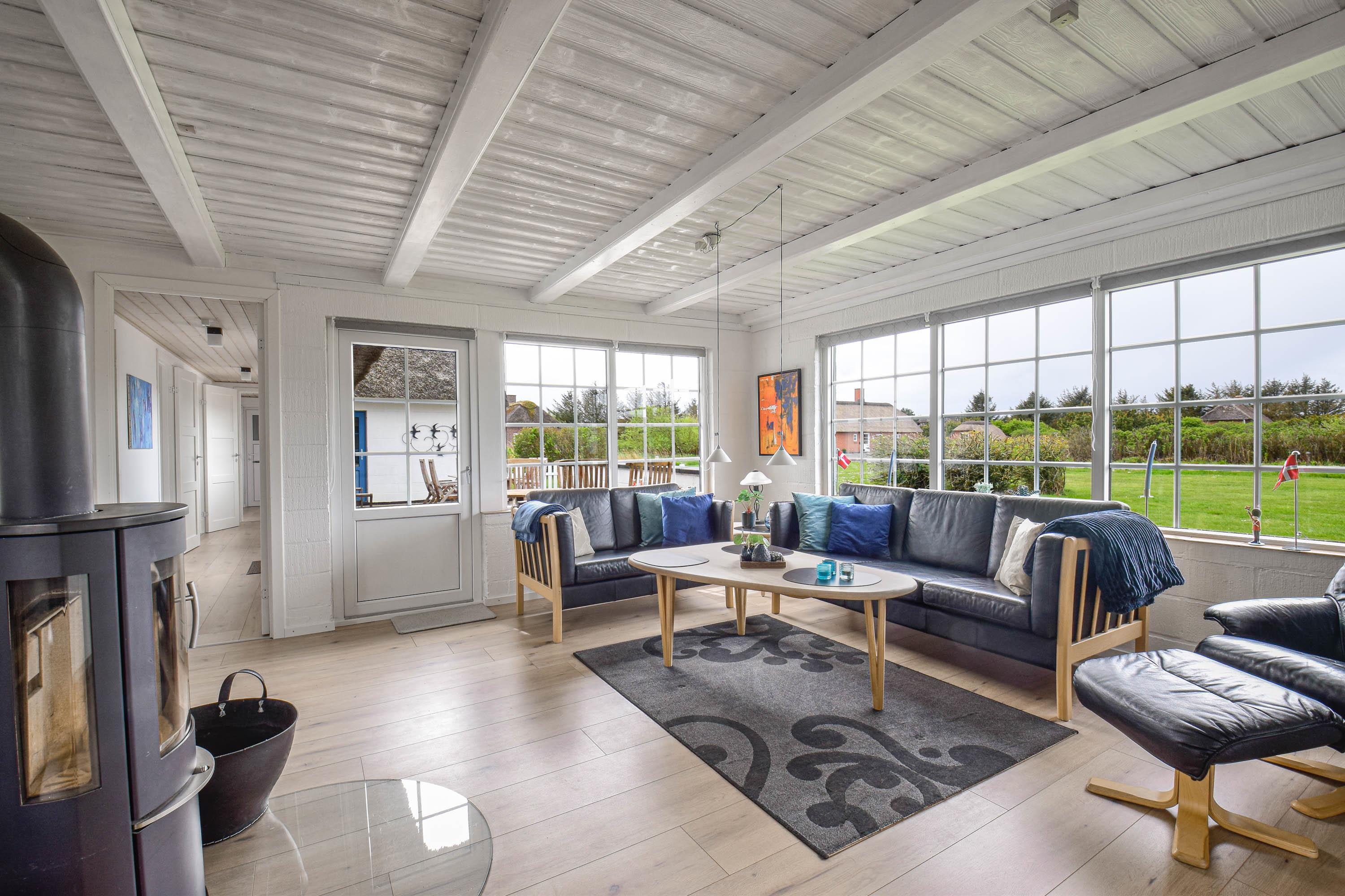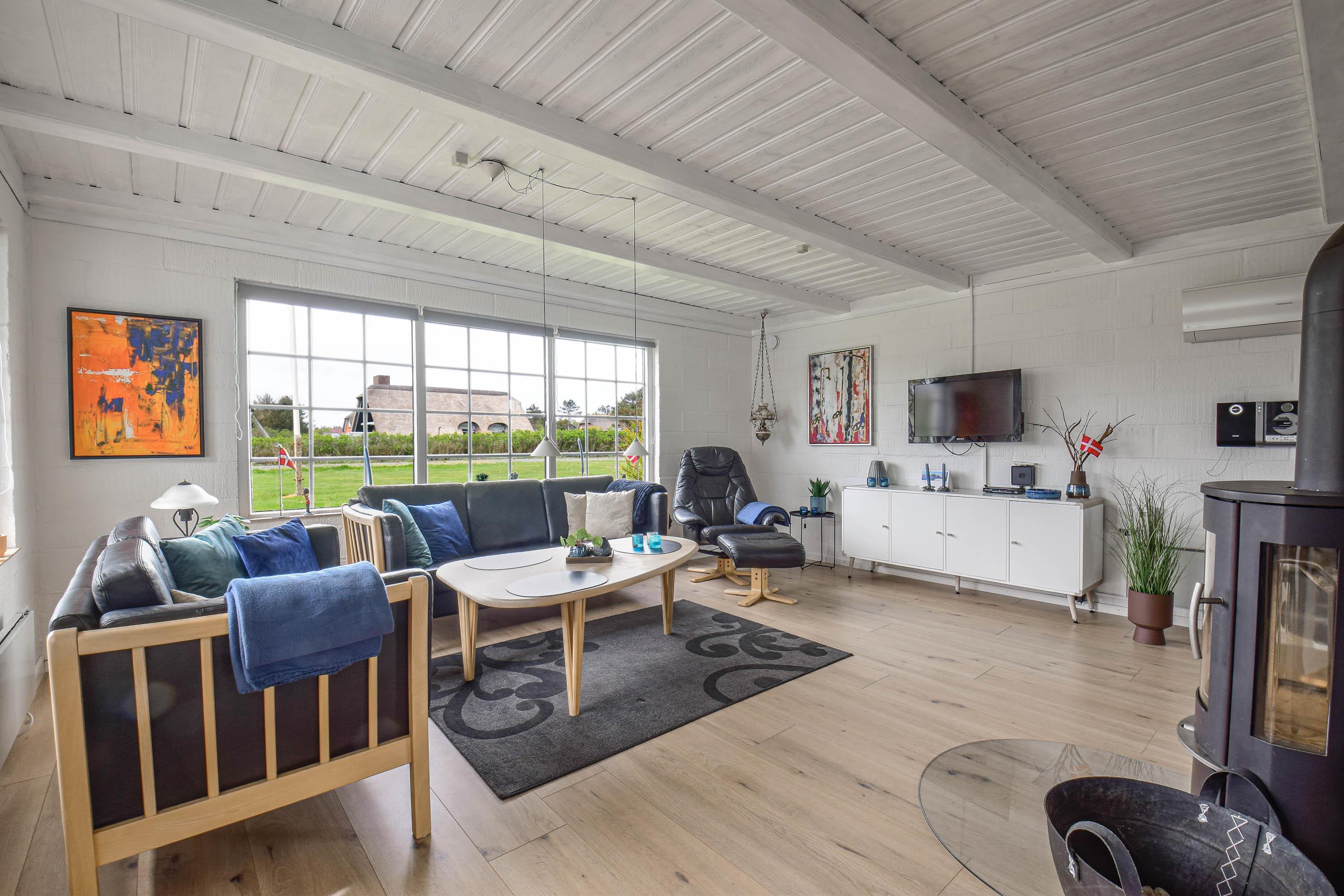 Indretning: Nyt køkken med spiseplads og i åben forbindelse med stuen, hvor der er brændeovn, sofagruppe og fjernsyn. Flot nyt badeværelse med bruser, vaskemaskine og tørretumbler, værelse med 2 enkeltsenge, værelse med dobbeltseng samt stort soveværelse med dobbeltseng. Fra stuen er der udgang til en dejlig vestvendt terrasse, og mod øst er der endnu en delvis lukket terrasse, hvor morgenmaden kan nydes til fuglesang og med havets brusen i baggrunden. 70 ltr. fryser.