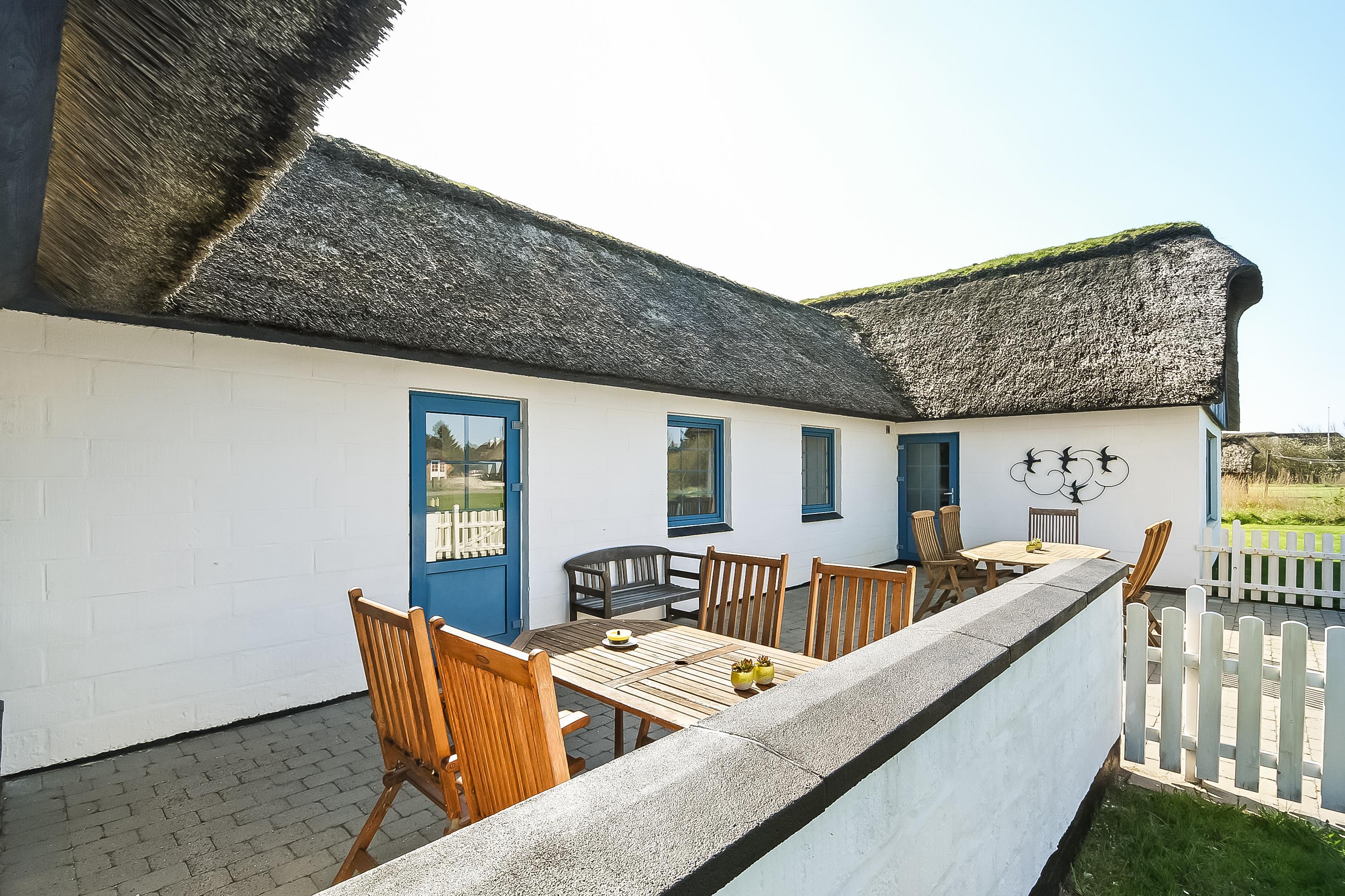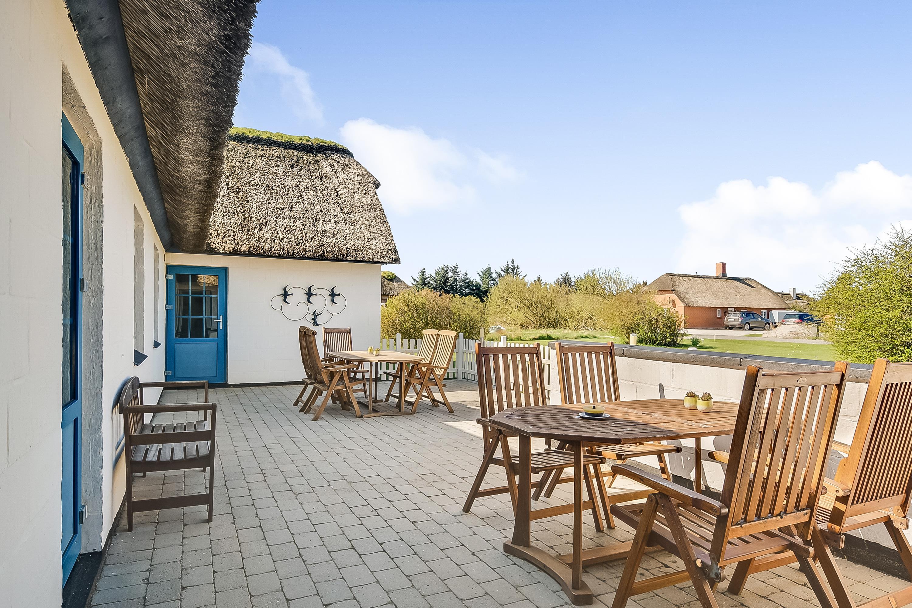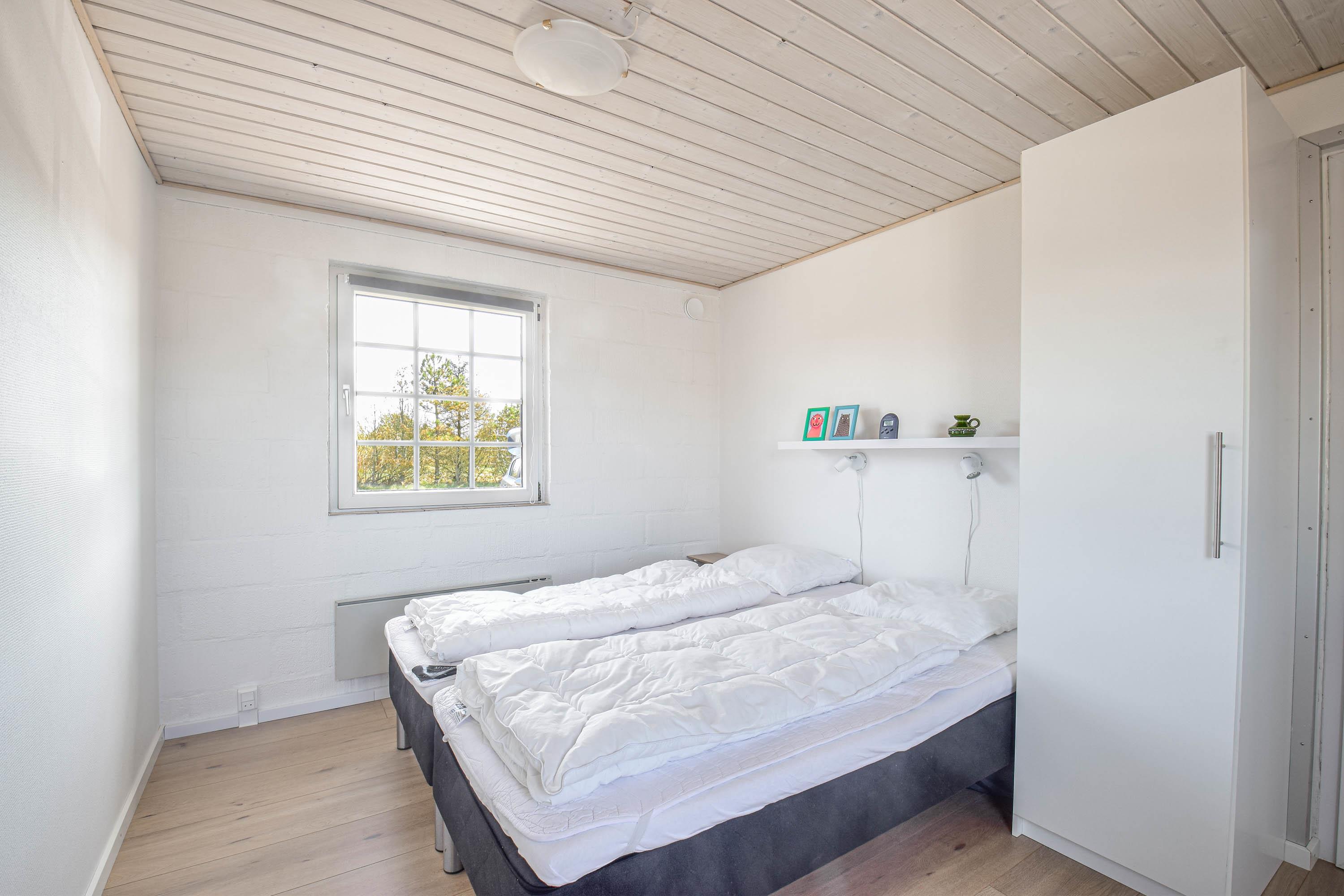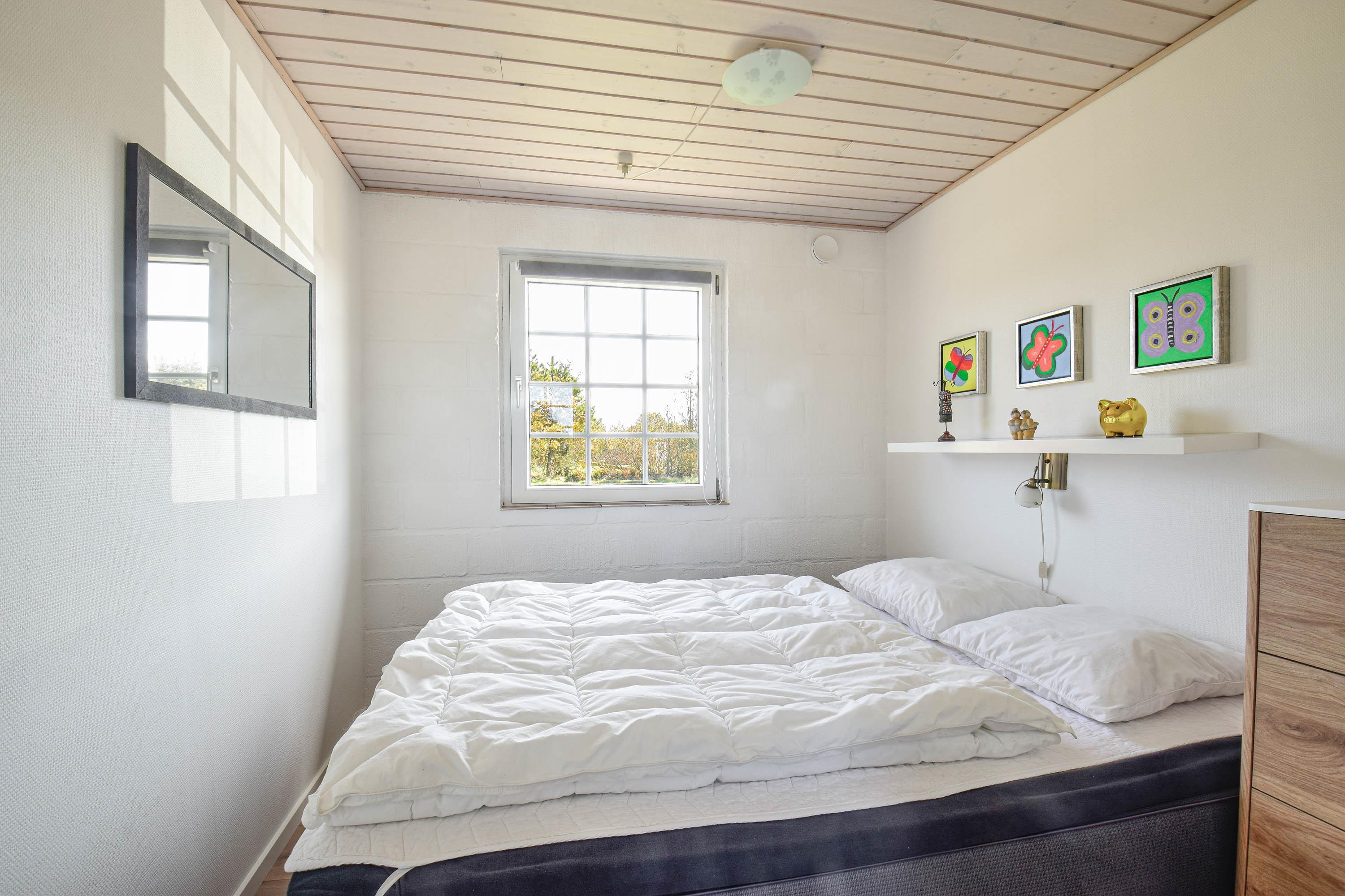 Indretning: Nyt køkken med spiseplads og i åben forbindelse med stuen, hvor der er brændeovn, sofagruppe og fjernsyn. Flot nyt badeværelse med bruser, vaskemaskine og tørretumbler, værelse med 2 enkeltsenge, værelse med dobbeltseng samt stort soveværelse med dobbeltseng. Fra stuen er der udgang til en dejlig vestvendt terrasse, og mod øst er der endnu en delvis lukket terrasse, hvor morgenmaden kan nydes til fuglesang og med havets brusen i baggrunden. 70 ltr. fryser.
