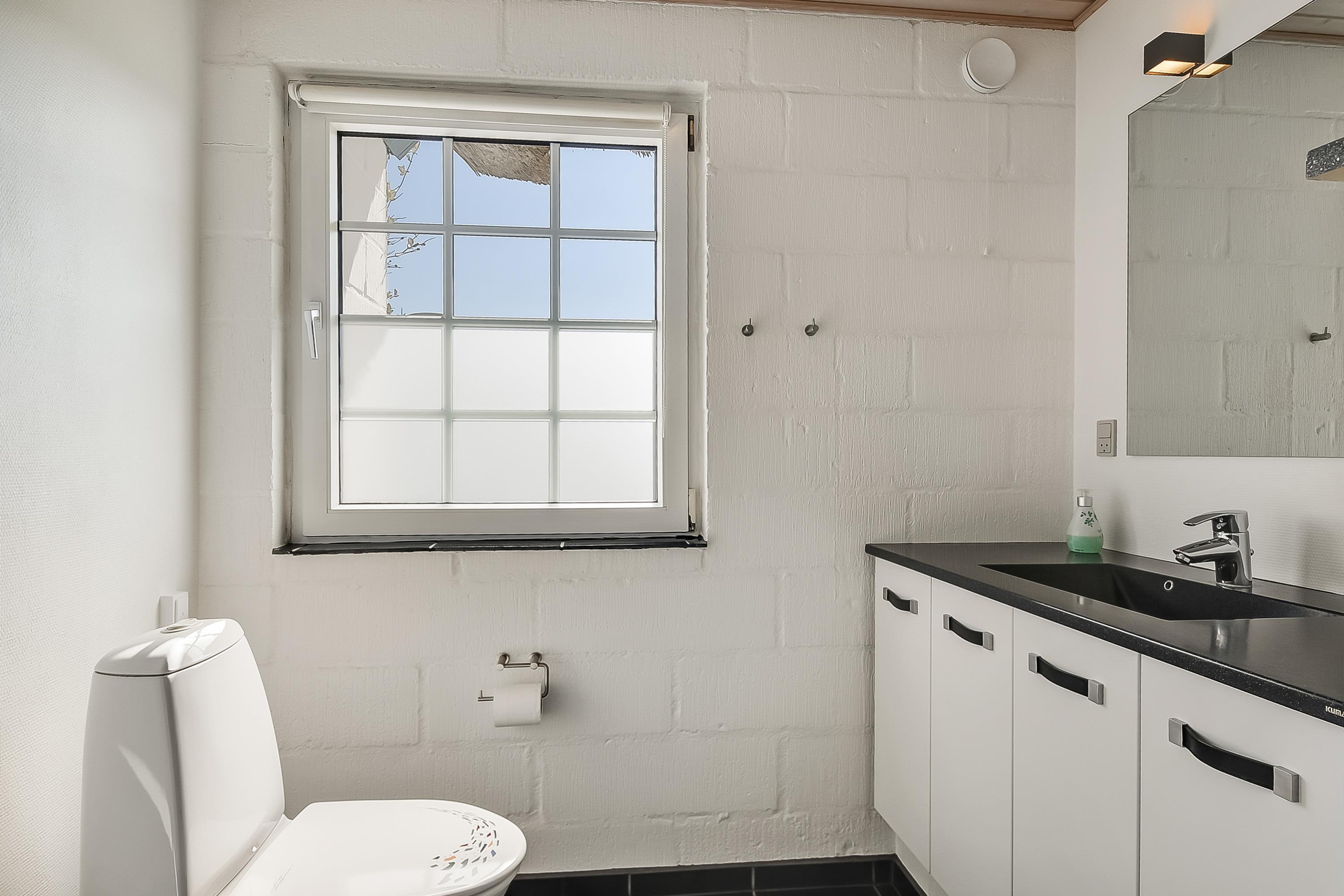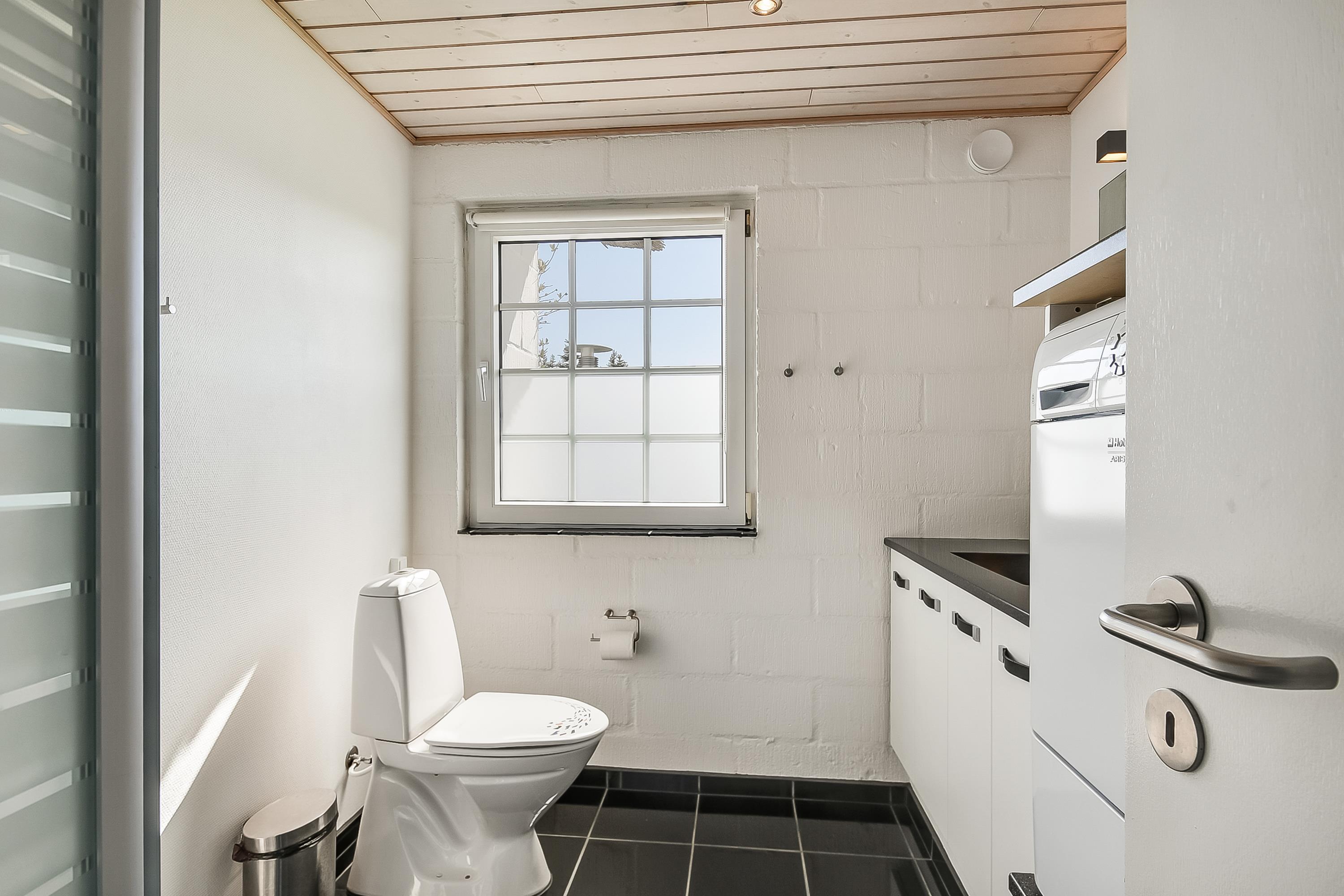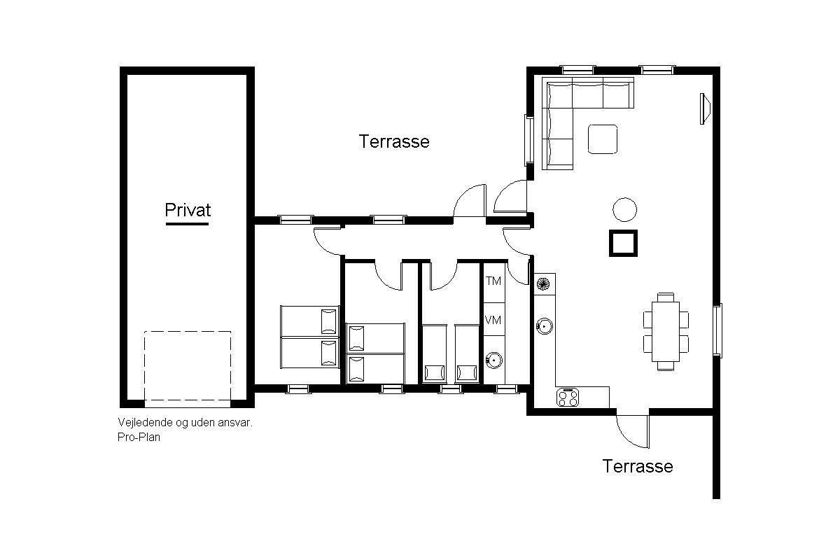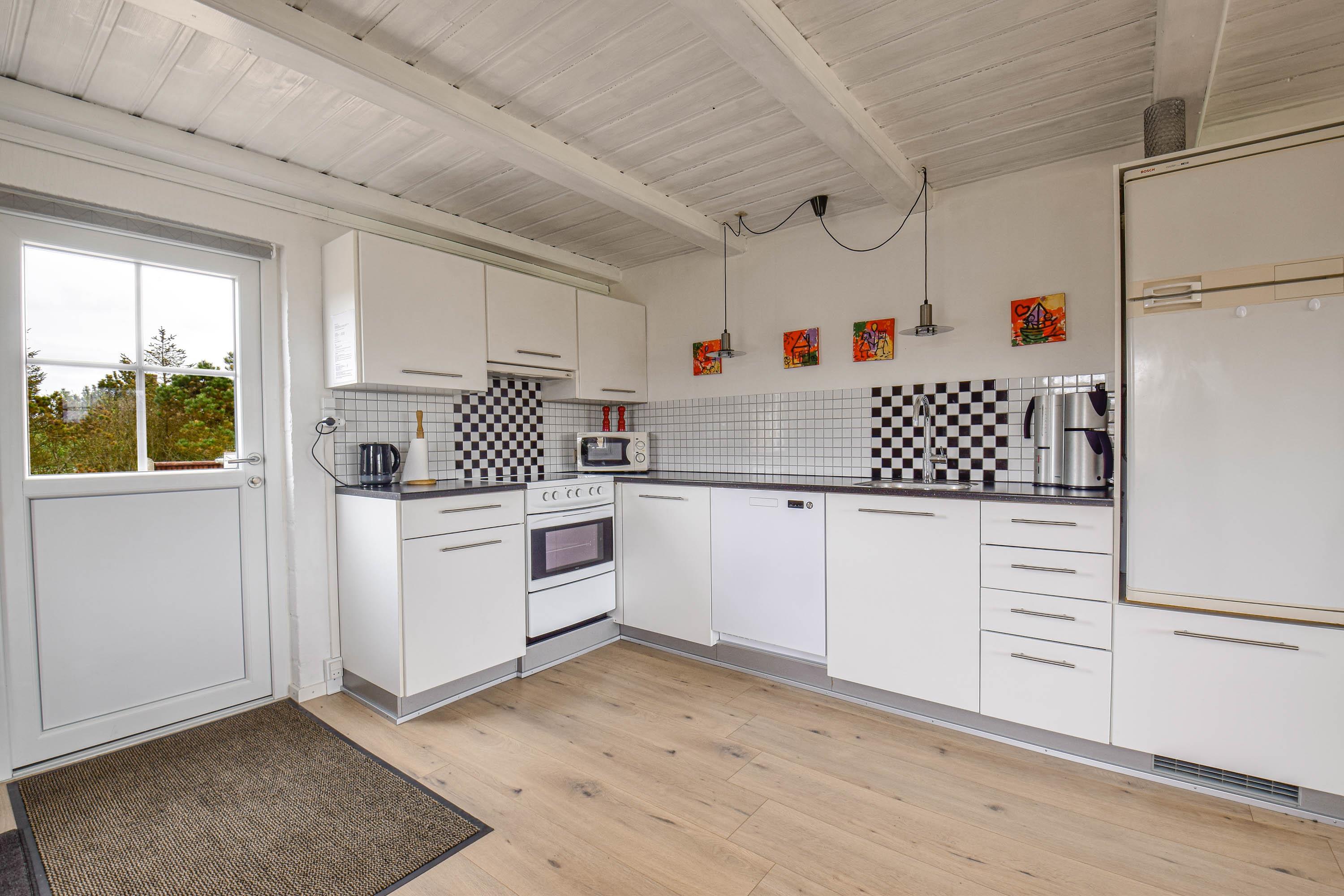 Indretning: Nyt køkken med spiseplads og i åben forbindelse med stuen, hvor der er brændeovn, sofagruppe og fjernsyn. Flot nyt badeværelse med bruser, vaskemaskine og tørretumbler, værelse med 2 enkeltsenge, værelse med dobbeltseng samt stort soveværelse med dobbeltseng. Fra stuen er der udgang til en dejlig vestvendt terrasse, og mod øst er der endnu en delvis lukket terrasse, hvor morgenmaden kan nydes til fuglesang og med havets brusen i baggrunden. 70 ltr. fryser.