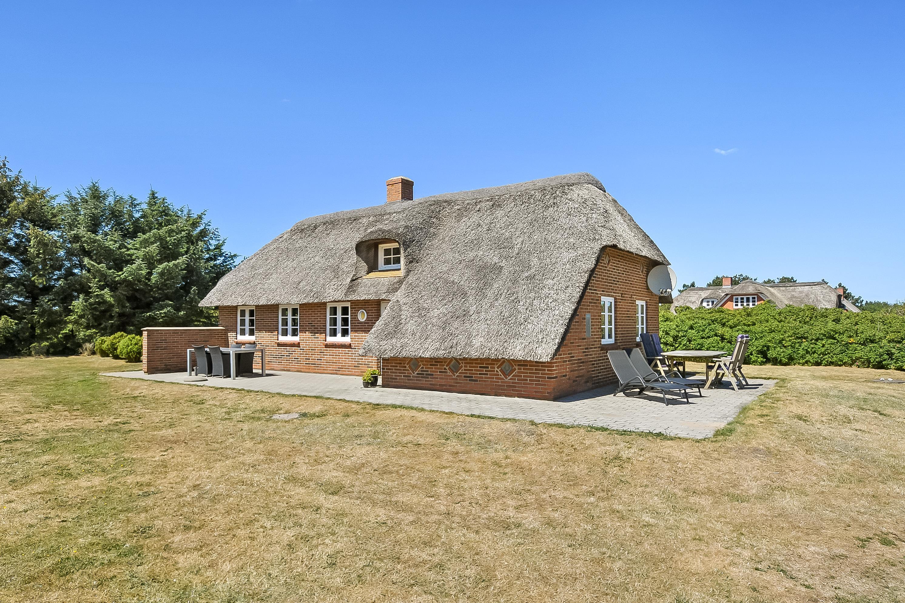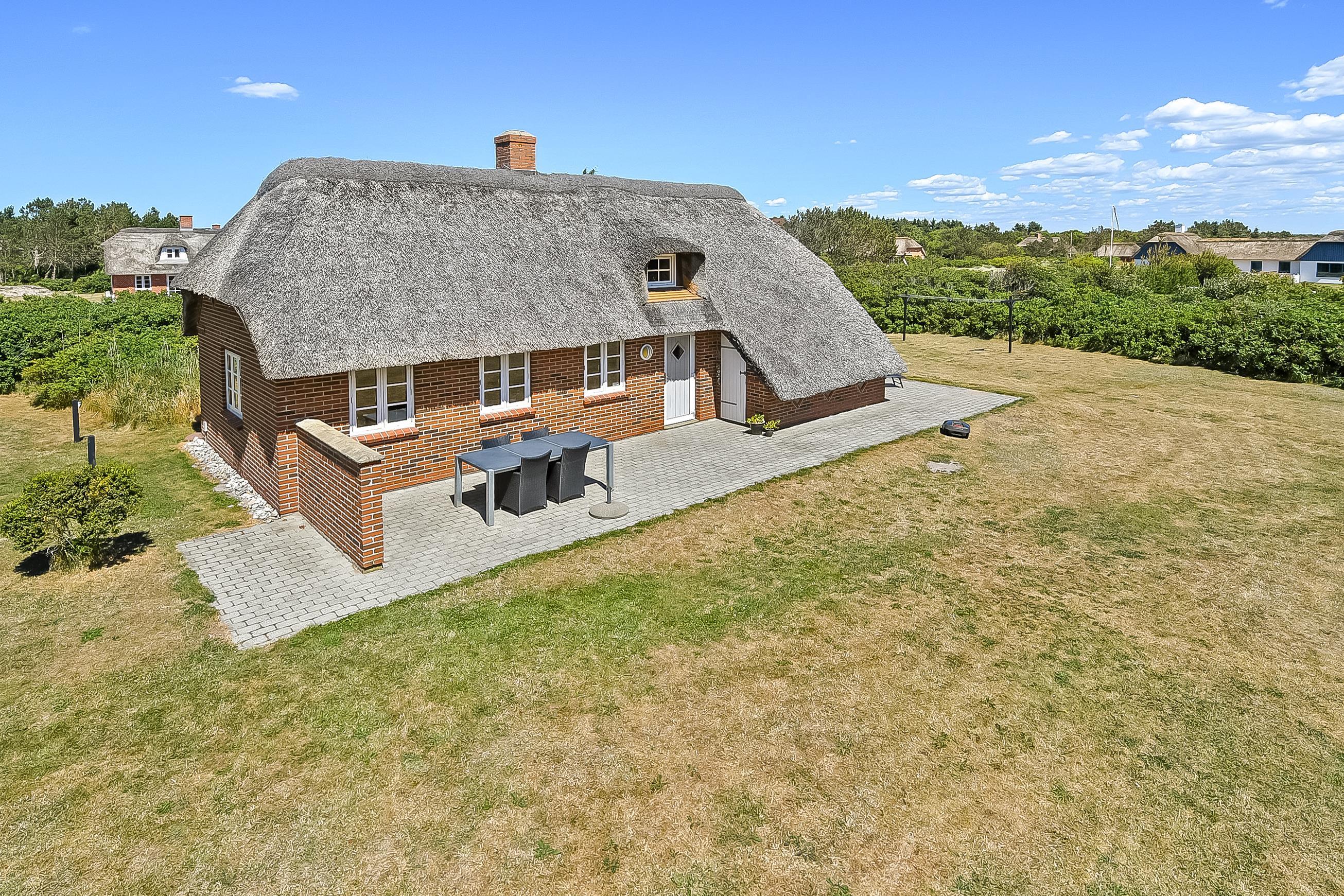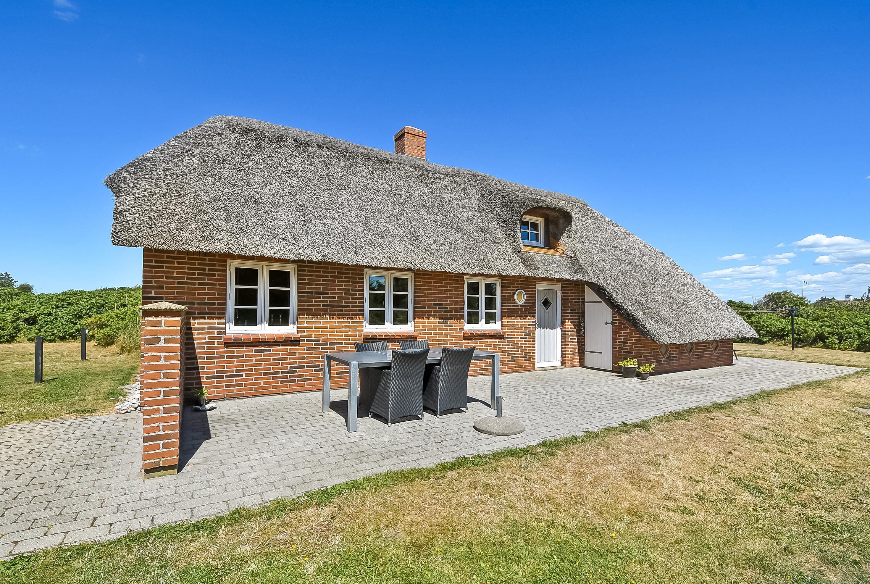 Kun 800 meter fra det brusende Vesterhav, midt i den smukke vestjyske natur, ligger dette charmerende murstenshus med stråtag – et feriehus med sjæl, varme og klassisk dansk atmosfære.