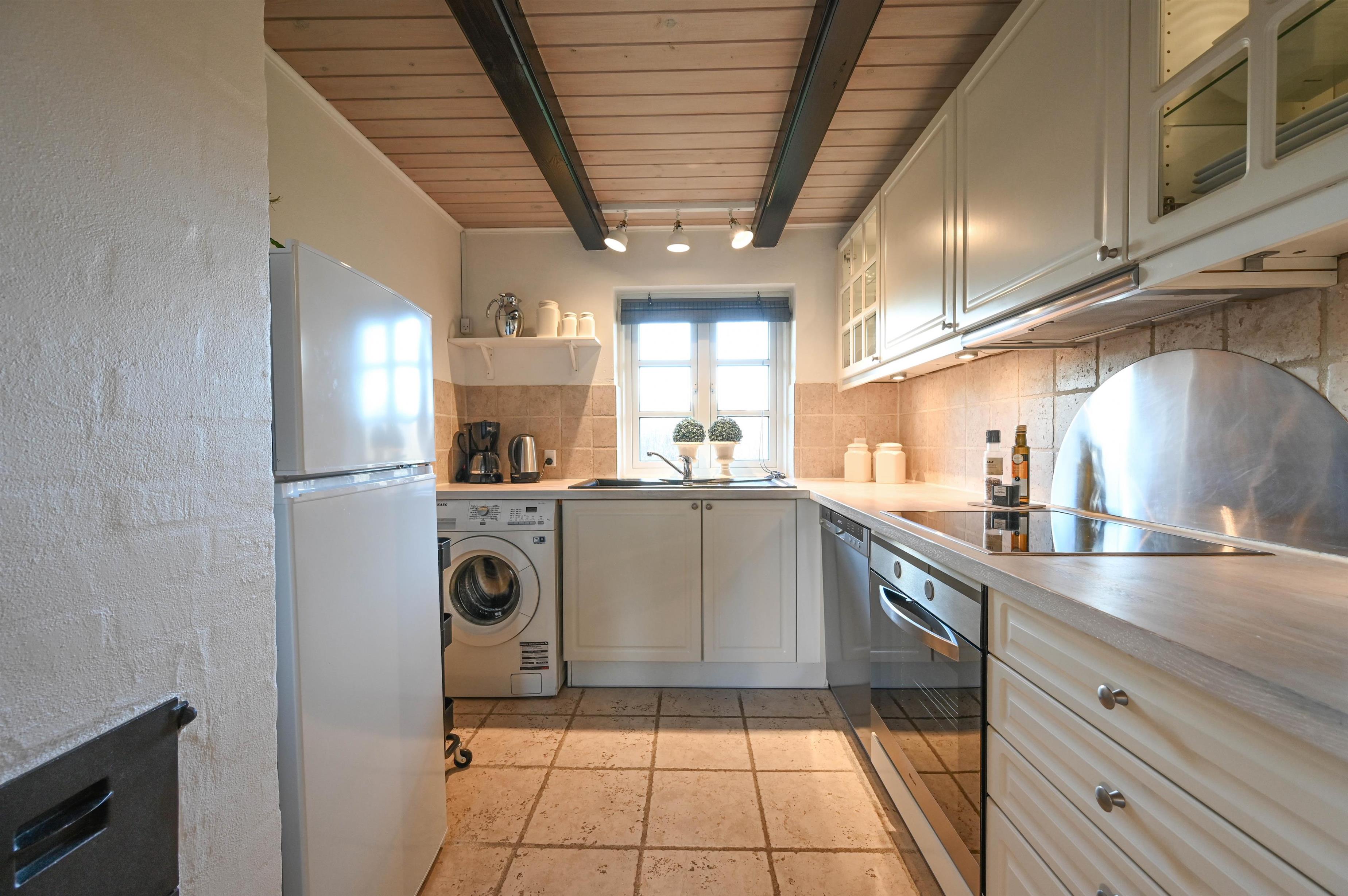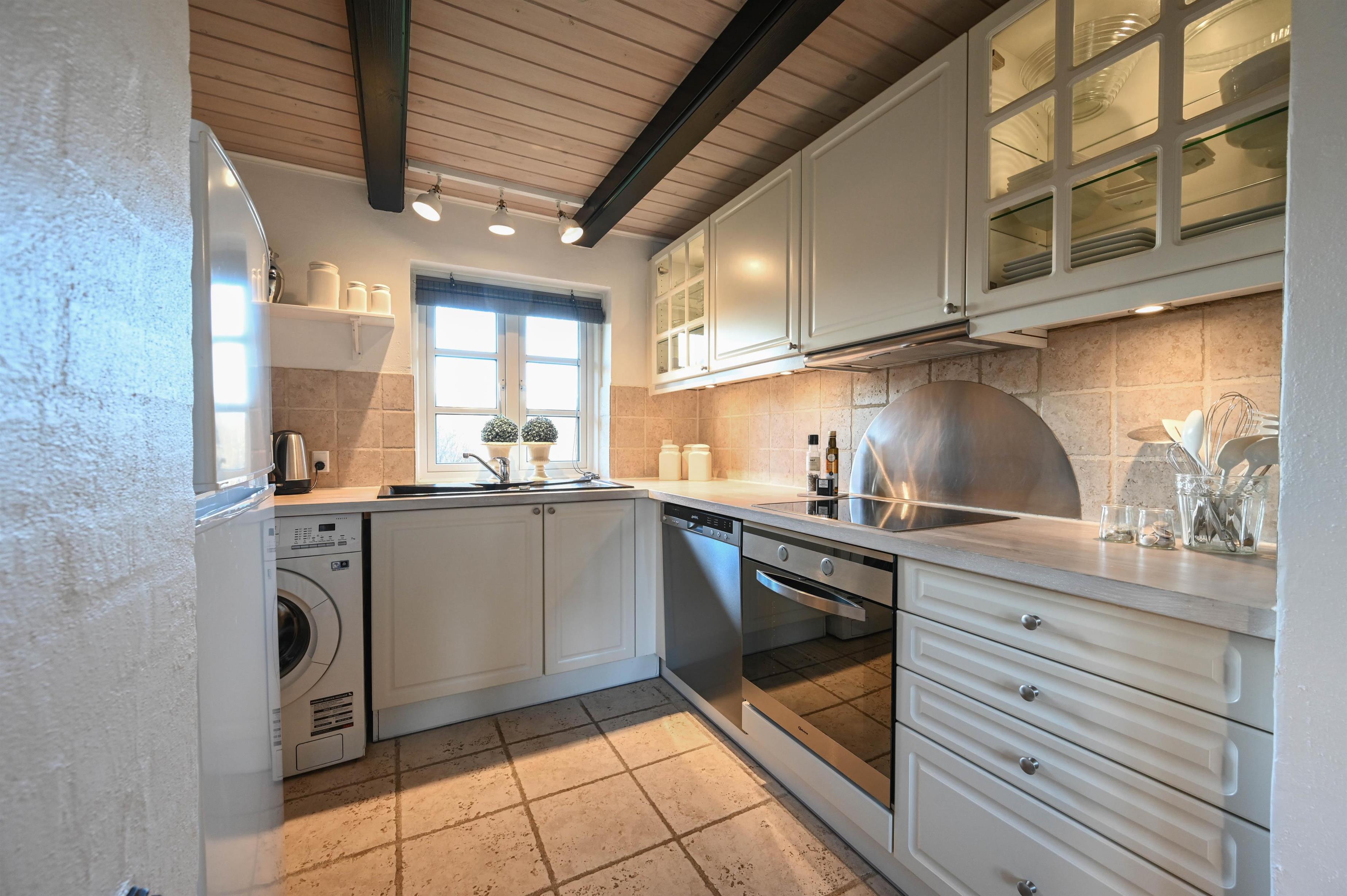 Det lyse køkken og stuen ligger i åben forbindelse og er indrettet i en enkel, smagfuld stil med komfortable møbler og god plads til samvær.