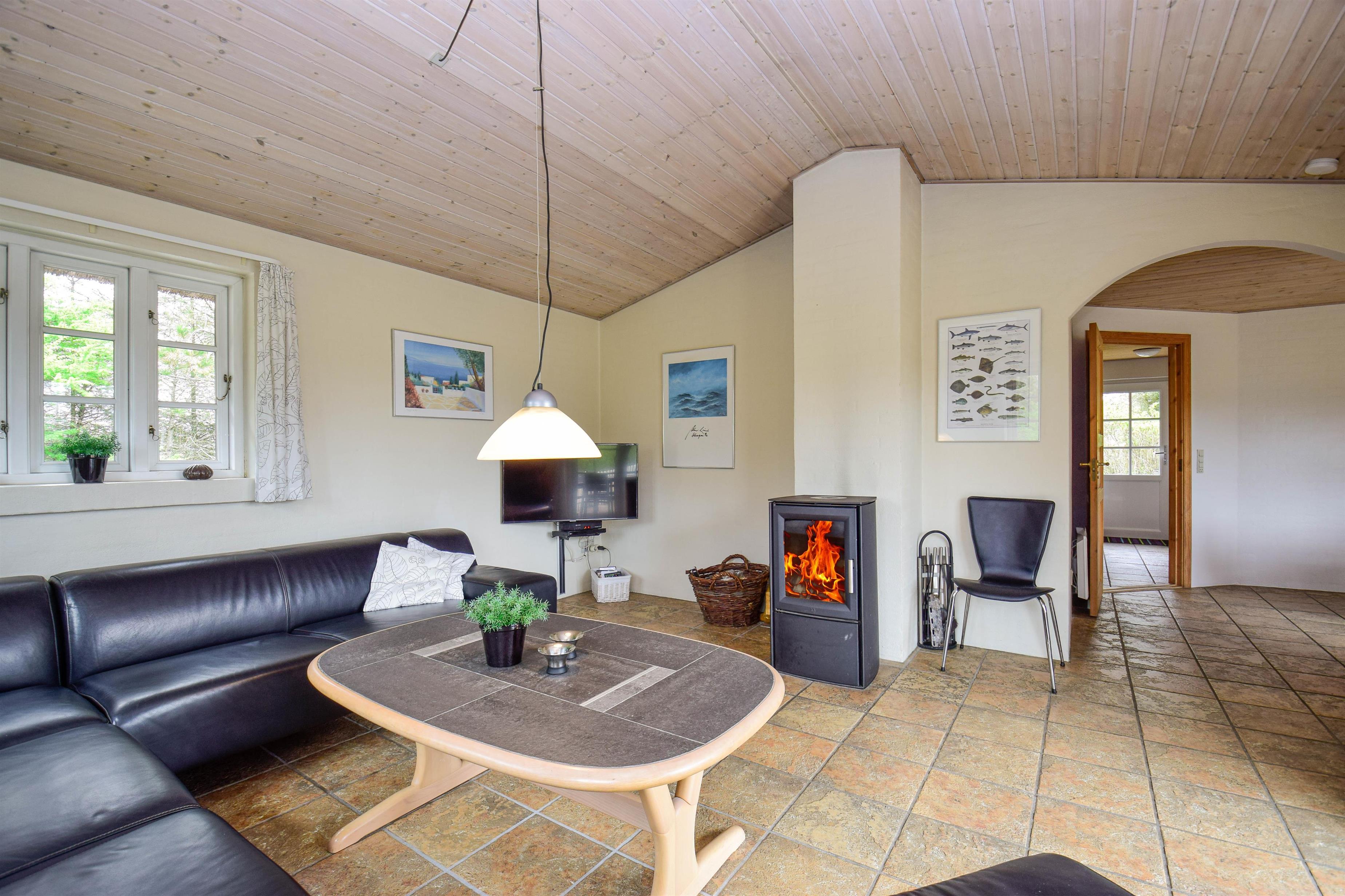 - Hyggelig og smagfuldt møbleret stue med brændeovn, der skaber varme og stemning på kølige aftener.
