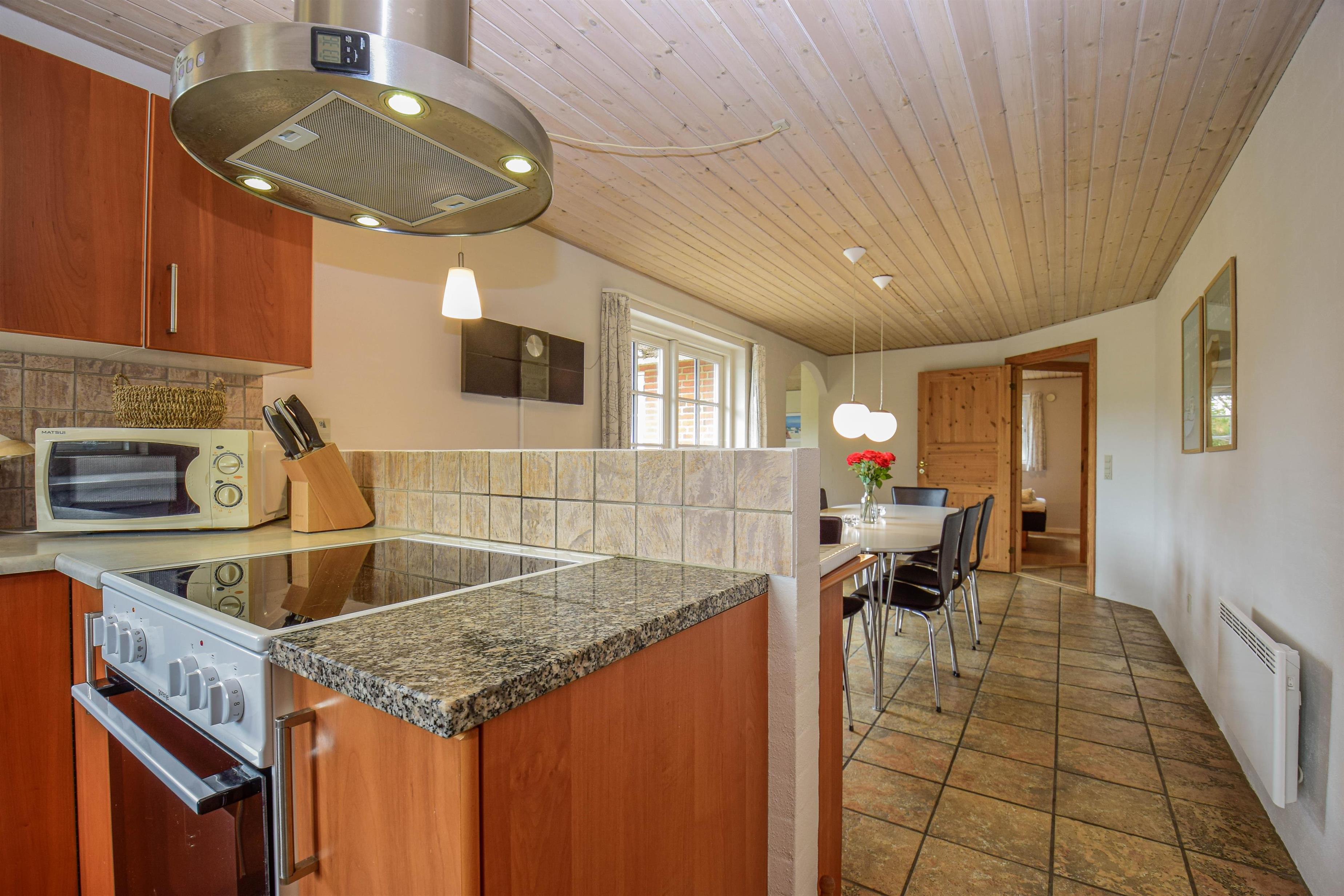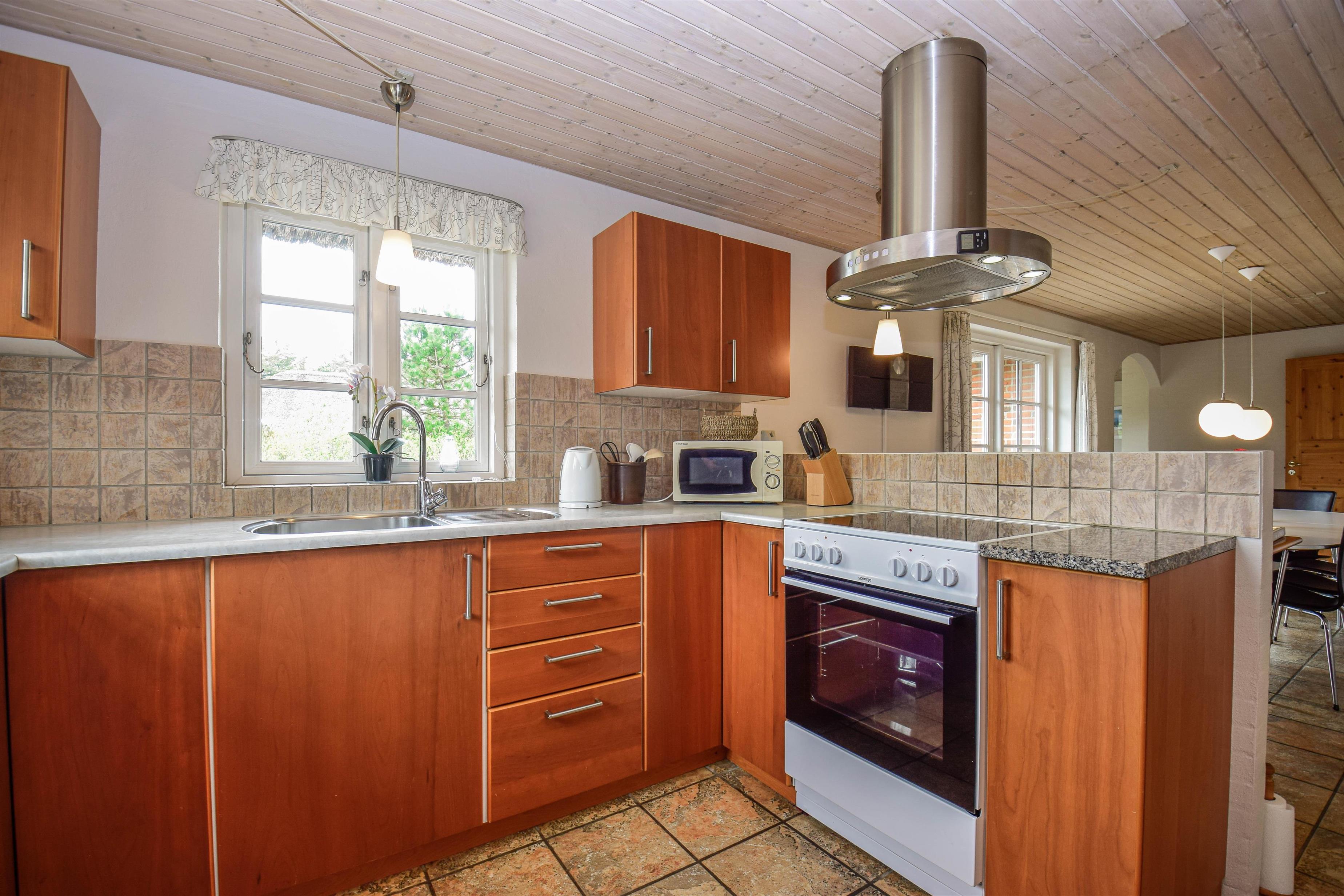Med sine 100 m² er huset opført i kvalitetsmaterialer og byder på en stilfuld og velovervejet indretning. Væggene er vandskurede i dæmpede farver, hvilket skaber en lys og indbydende atmosfære. Trægulv i værelserne og klinker i køkken-alrummet understreger den høje komfort og nem vedligeholdelse.