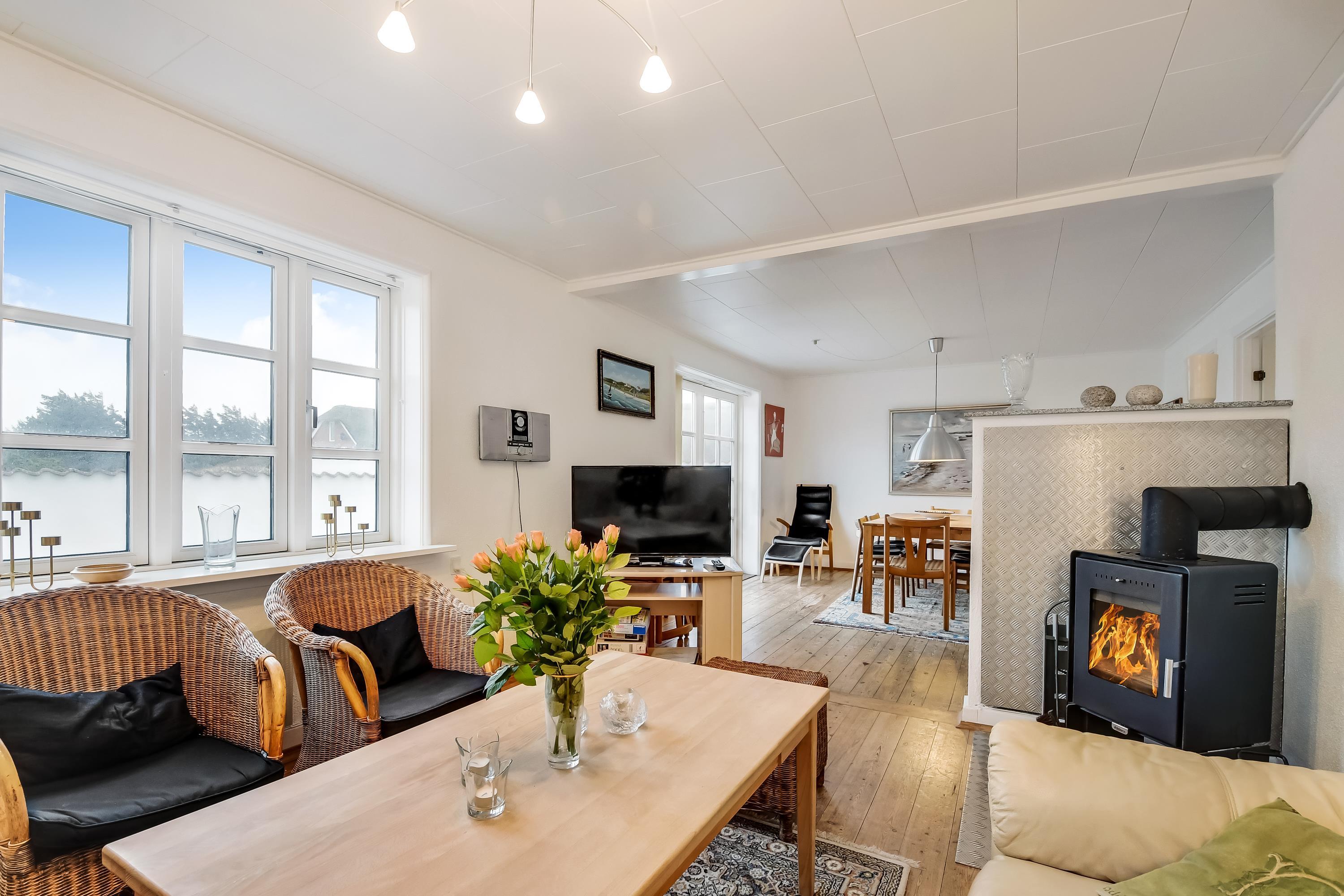 Stue med brændeovn, sofagruppe, spiseplads, TV og udgang til terrasse