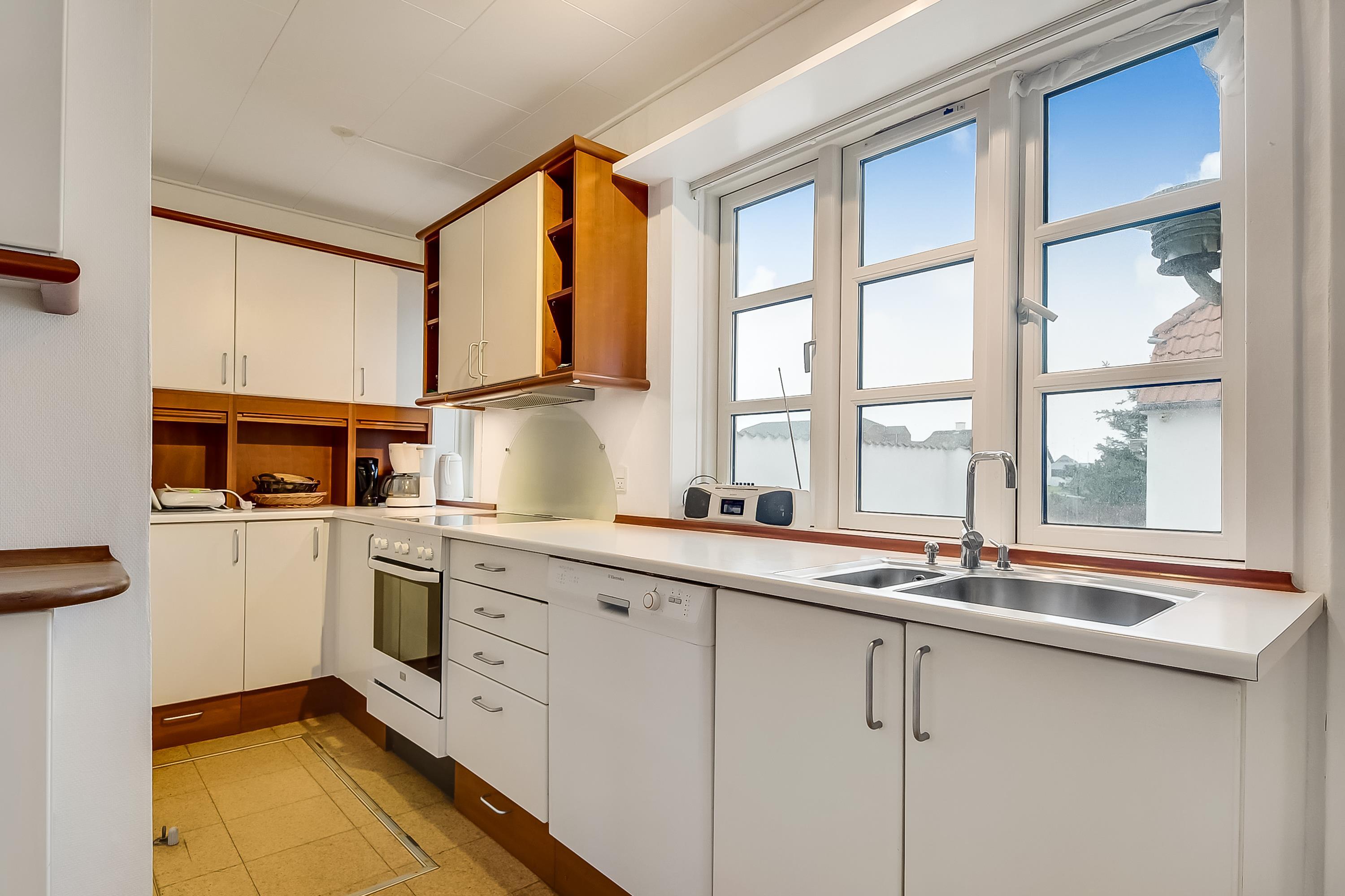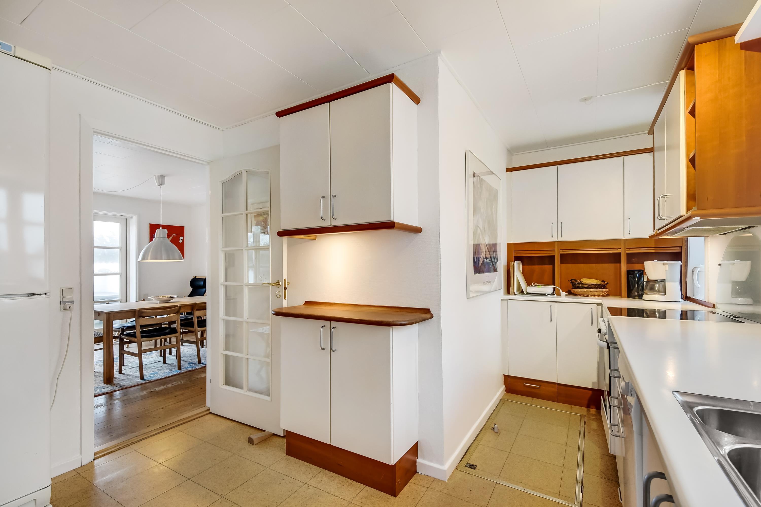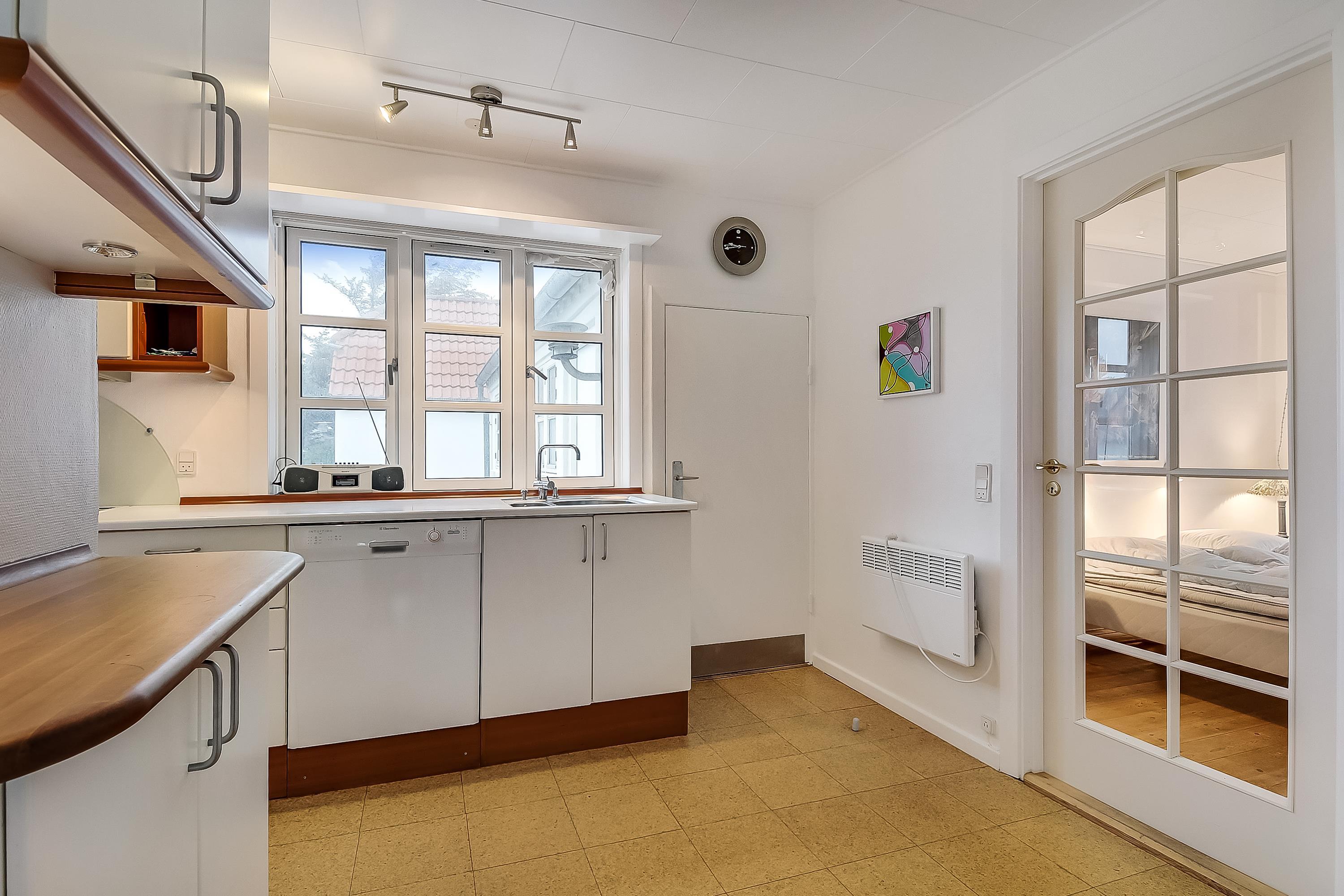 Køkken med god bordplads, opvaskemaskine samt køle-/fryseskab