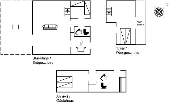 Til huset hører anneks, hvor der befinder sig 4 sovepladser. Der er et stort anneksværelse med udsigt over haven mod vest og direkte adgang til et stort badeværelse med vaskemaskine og tørretumbler. I den anden ende af annekset er der et mindre værelse med en køjeseng med direkte adgang fra gårdhave, hvor der kan sove 2 voksne.