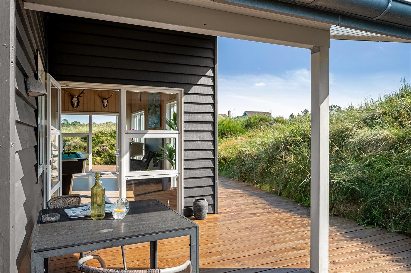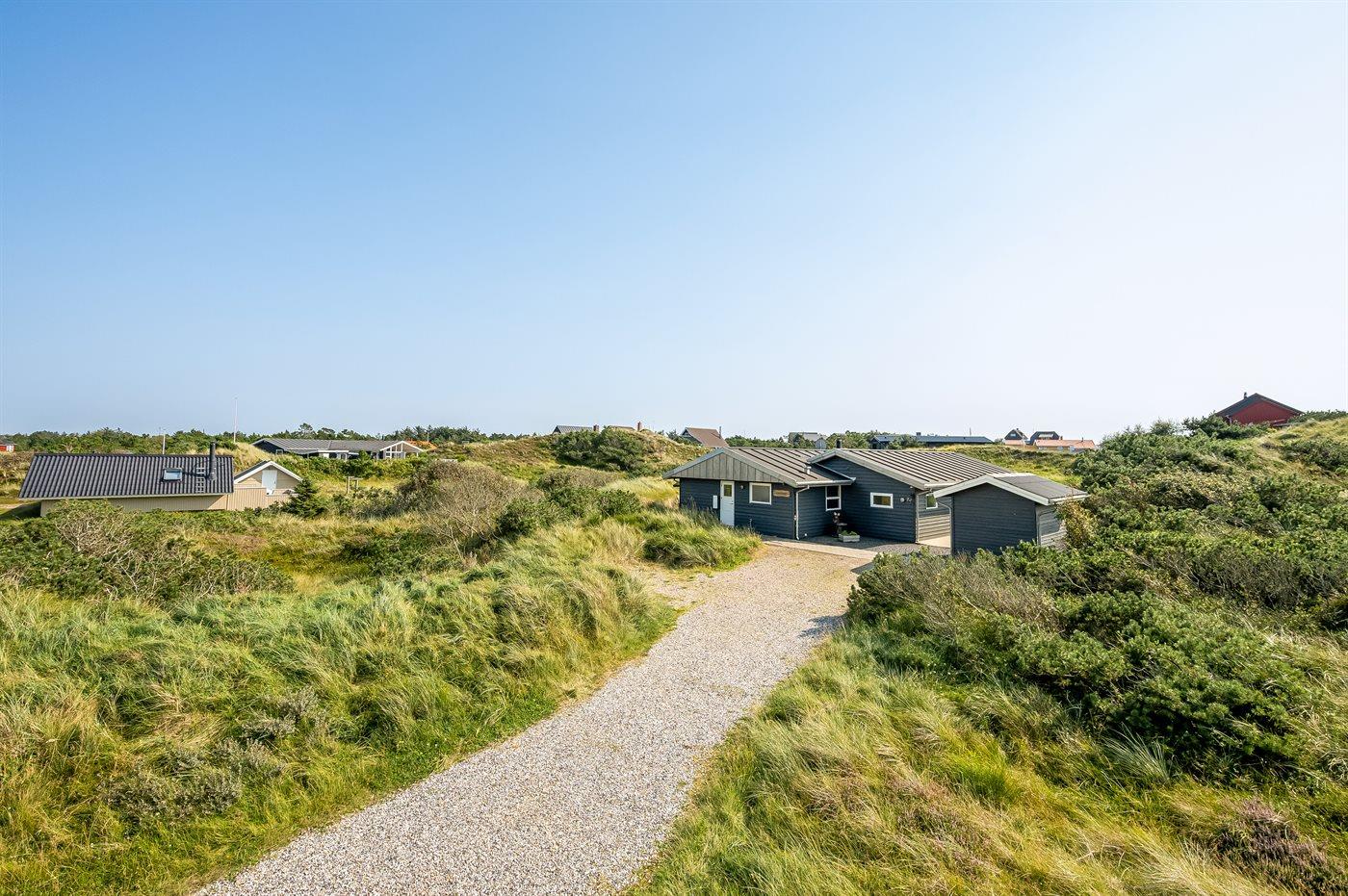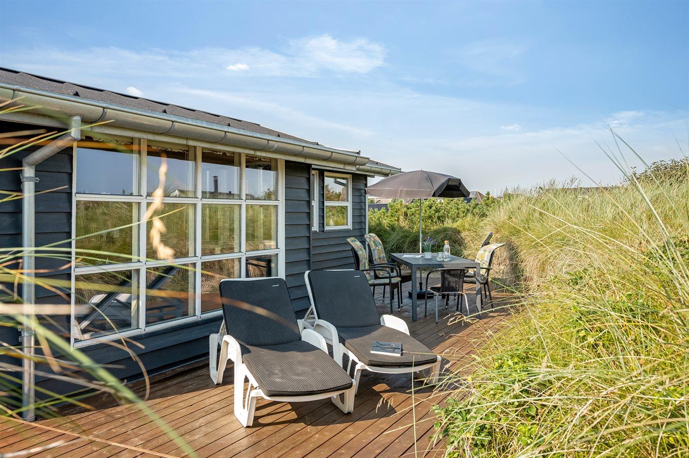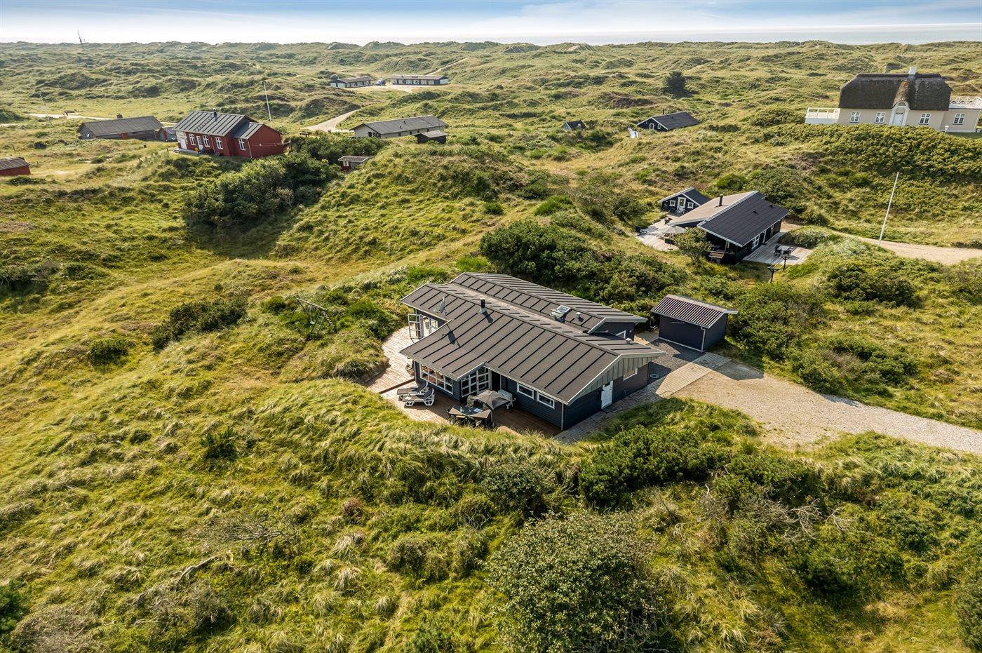 I gåafstand fra en af Danmarks bedste badestrande ligger dette herlige sommerhus i træ, bygget i 1970, renoveret og udvidet i 2009 med bl.a. nyt badeværelse med spa. Huset ligger på en 2800 m2 stor klitgrund og til huset hører stort, delvist overdækket terrasseareal med havemøbler. Flot badeværelse (2009) med opvarmet klinkegulv, bruseniche, 2-pers. spa samt adgang til husets sauna. Ekstra badeværelse med bruseniche. Det dejlige køkken er bl.a. udstyret med opvaskemaskine og mikrobølgeovn. Rummelig opholdsstue med pæne lædermøbler, brændeovn, stereoanlæg med CD-afspiller, DVD-afspiller og 42” fladskærms-TV med parabol (digital). Aktivitetsrum med billard- og bordtennisbord samt dart. Husets sovepladser fordeler sig på 3 værelser, alle med dobbeltseng. Desuden 2 sovepladser på husets hems. Af yderligere udstyr kan gratis ADSL-internetforbindelse (computer medbringes), 1 ekstra TV, Nintendo Wii vaskemaskine og tørretumbler nævnes. Til de mindste feriegæster findes der sandkasse og gynge på grunden. Der findes endvidere et dejligt, stort redskabsrum (9 m2) med god plads til f.eks. cykler. Et skønt sommerhus, som uanset årstid er et godt udgangspunkt for en dejlig ferieoplevelse.