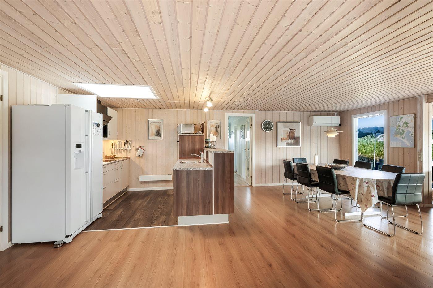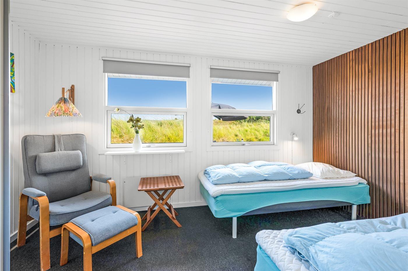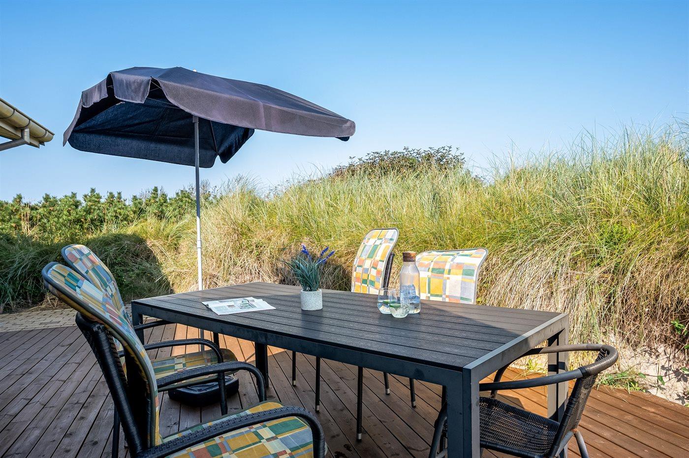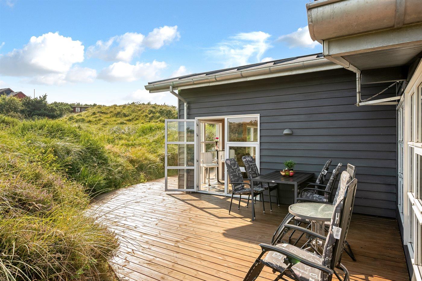 I gåafstand fra en af Danmarks bedste badestrande ligger dette herlige sommerhus i træ, bygget i 1970, renoveret og udvidet i 2009 med bl.a. nyt badeværelse med spa. Huset ligger på en 2800 m2 stor klitgrund og til huset hører stort, delvist overdækket terrasseareal med havemøbler. Flot badeværelse (2009) med opvarmet klinkegulv, bruseniche, 2-pers. spa samt adgang til husets sauna. Ekstra badeværelse med bruseniche. Det dejlige køkken er bl.a. udstyret med opvaskemaskine og mikrobølgeovn. Rummelig opholdsstue med pæne lædermøbler, brændeovn, stereoanlæg med CD-afspiller, DVD-afspiller og 42” fladskærms-TV med parabol (digital). Aktivitetsrum med billard- og bordtennisbord samt dart. Husets sovepladser fordeler sig på 3 værelser, alle med dobbeltseng. Desuden 2 sovepladser på husets hems. Af yderligere udstyr kan gratis ADSL-internetforbindelse (computer medbringes), 1 ekstra TV, Nintendo Wii vaskemaskine og tørretumbler nævnes. Til de mindste feriegæster findes der sandkasse og gynge på grunden. Der findes endvidere et dejligt, stort redskabsrum (9 m2) med god plads til f.eks. cykler. Et skønt sommerhus, som uanset årstid er et godt udgangspunkt for en dejlig ferieoplevelse.