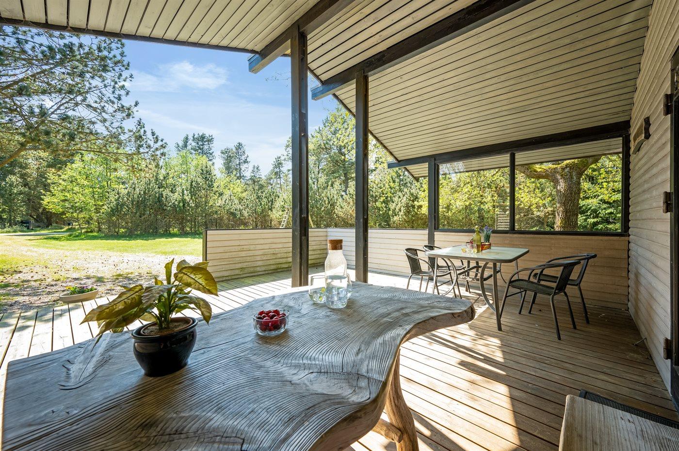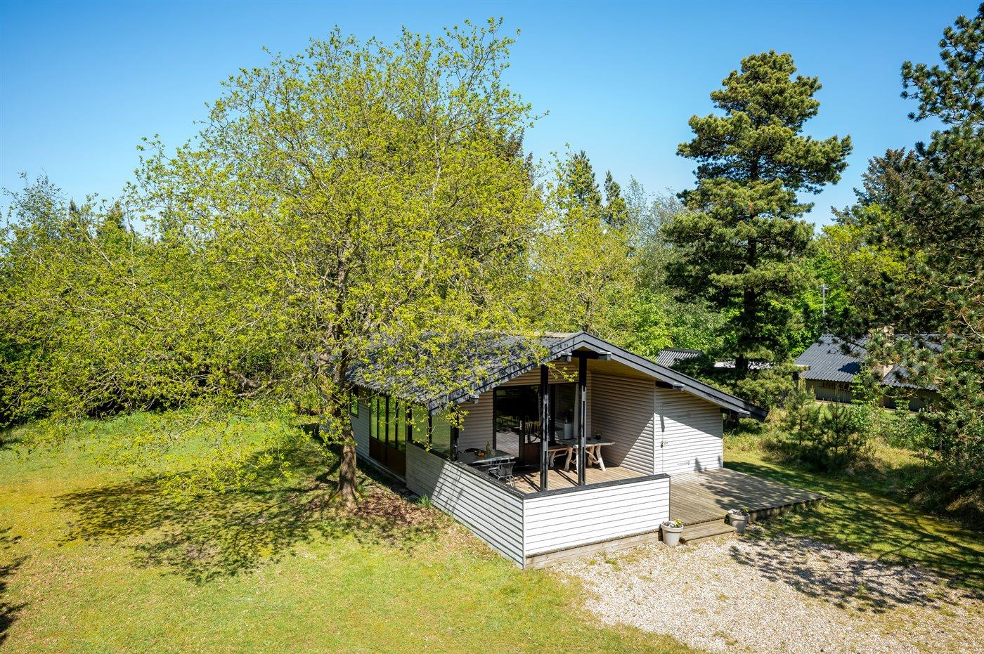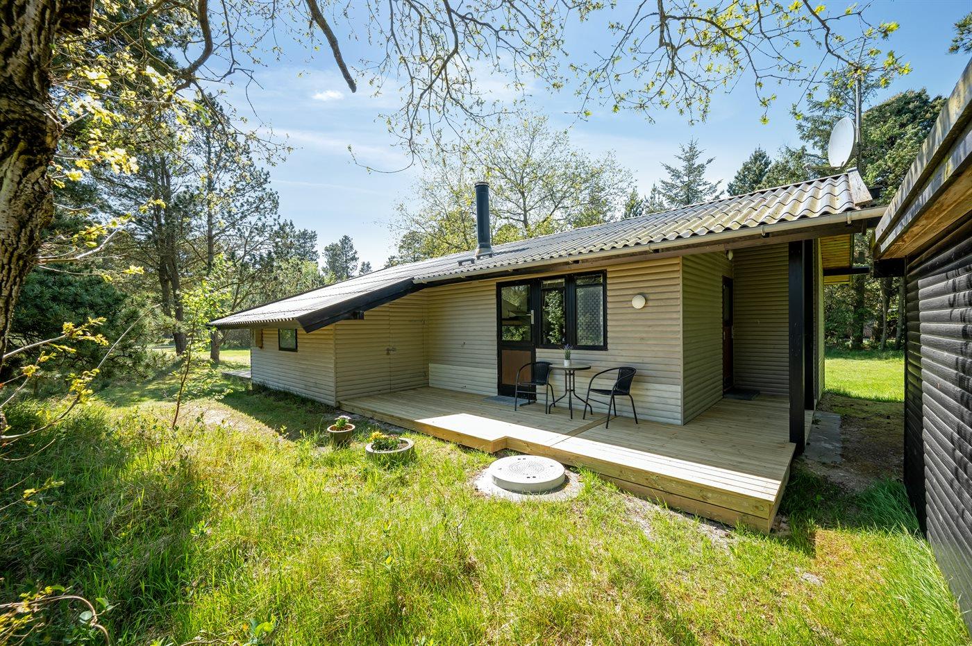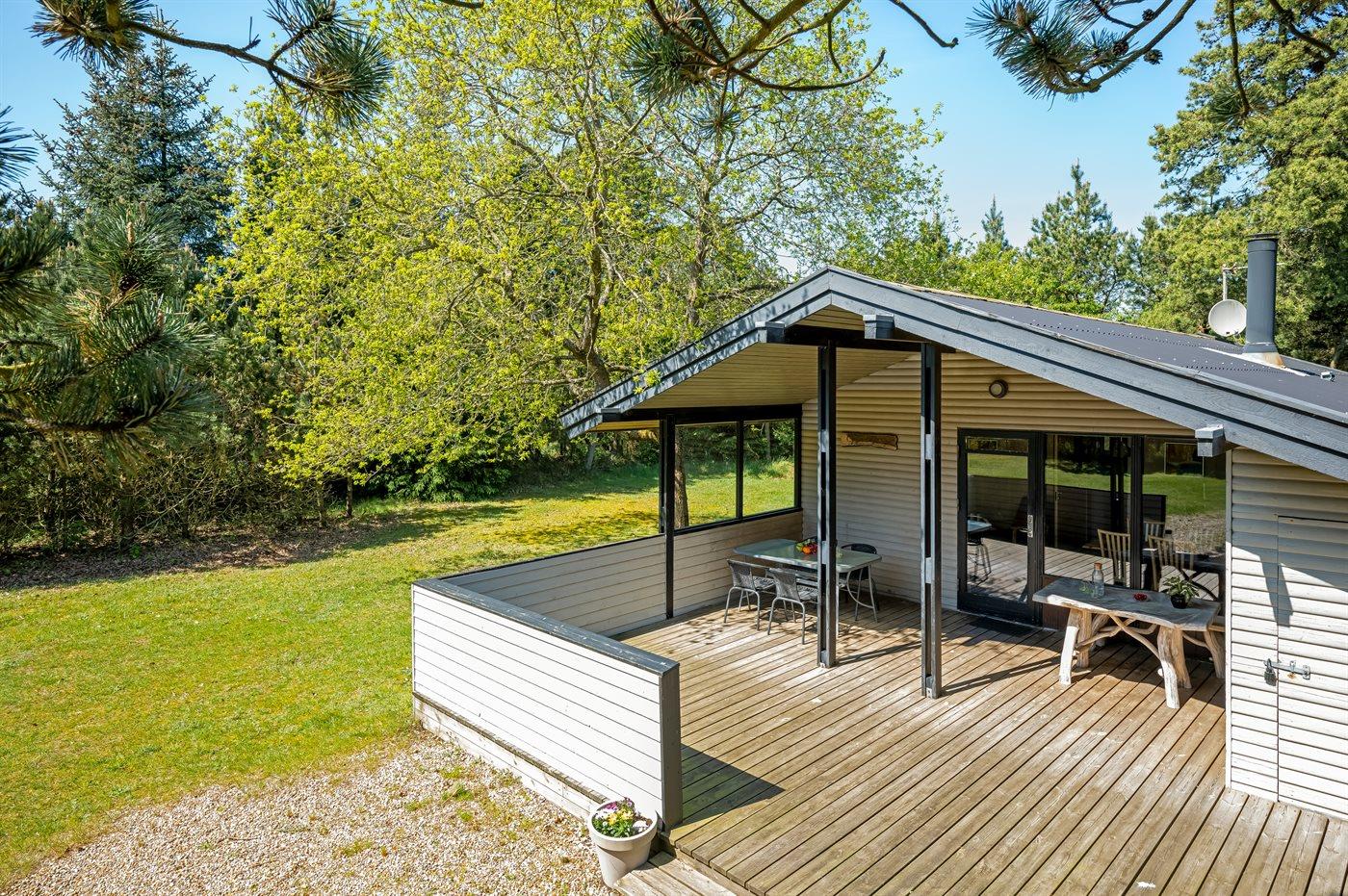 Hyggeligt sommerhus ved Vejers Strand med sauna, overdækket terrasse og stor naturgrund for afslappende ferie.