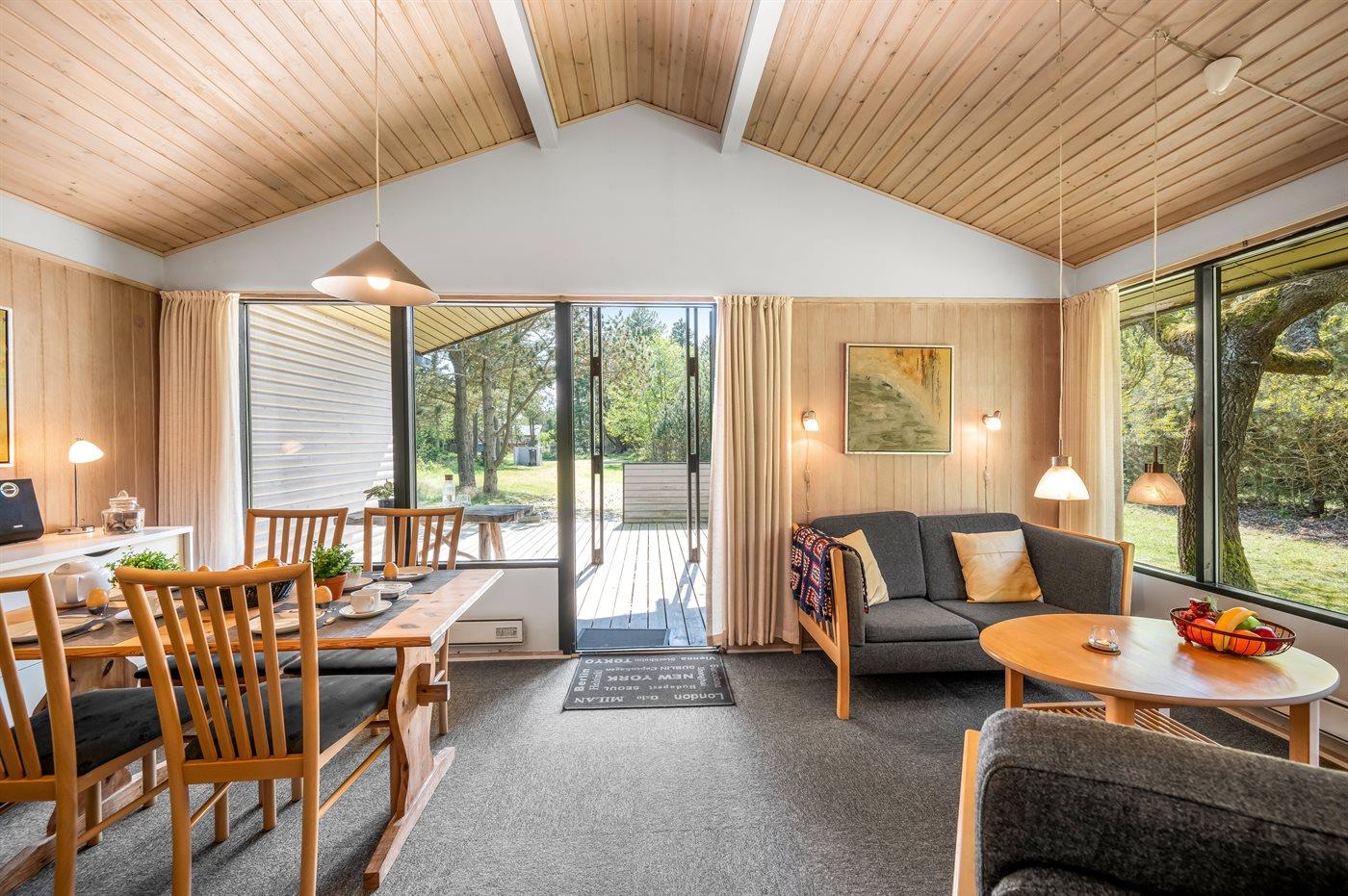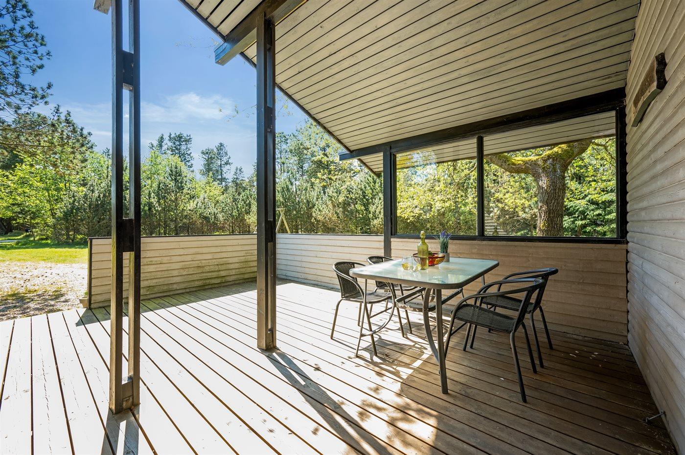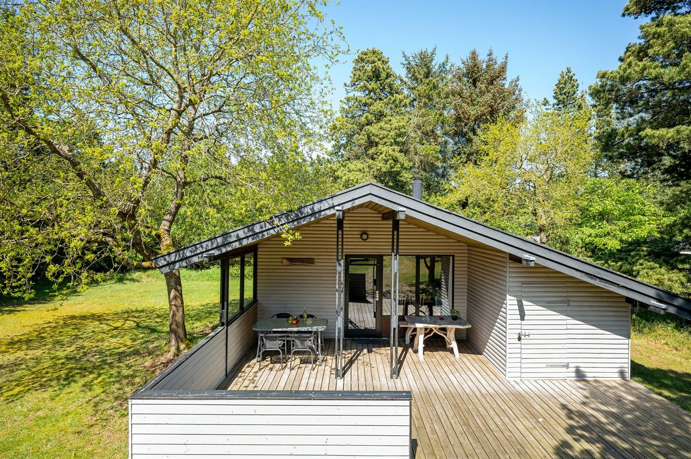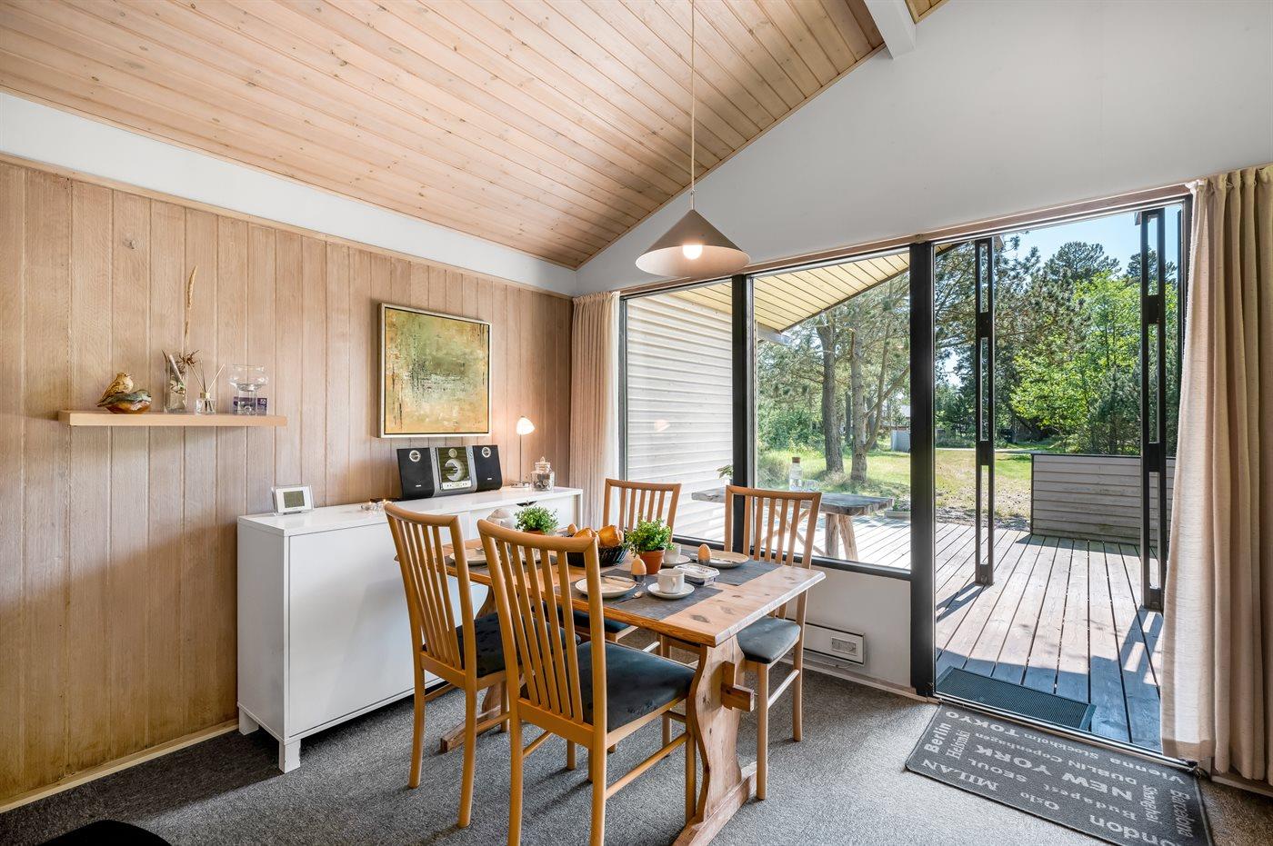Hyggeligt sommerhus ved Vejers Strand med sauna, overdækket terrasse og stor naturgrund for afslappende ferie.