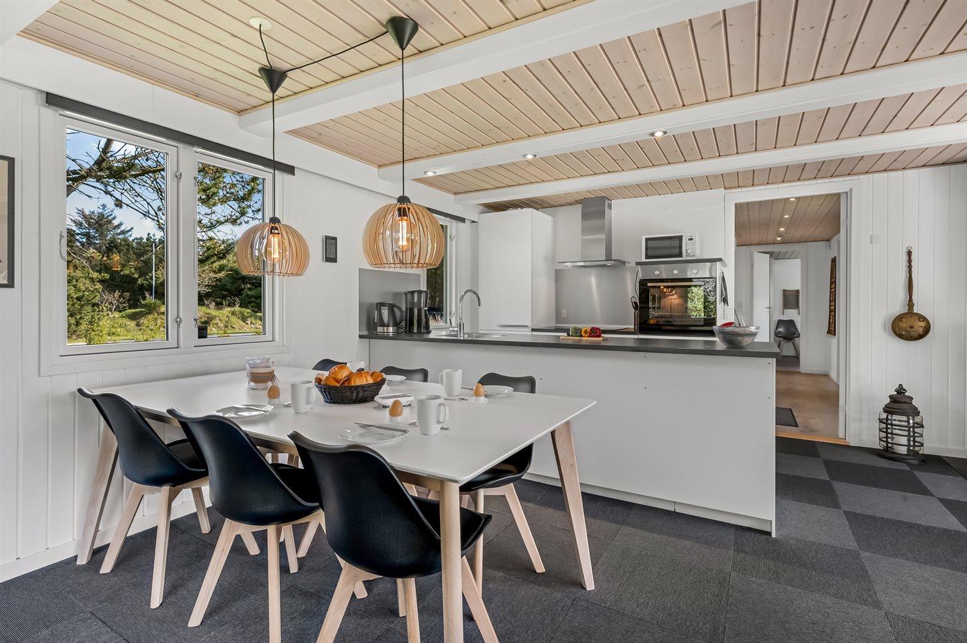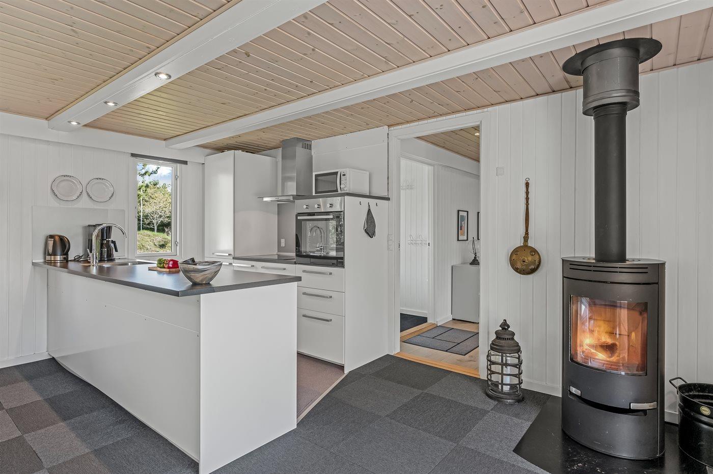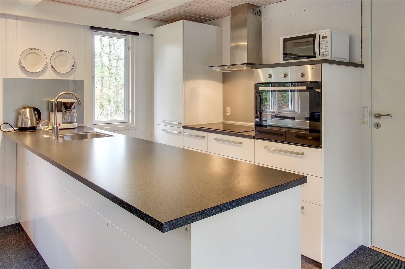 Køkkenet er udstyret med 1 køleskab. Der er 4 keramiske kogeplader, bageovn, mikrobølgeovn samt opvaskemaskine.